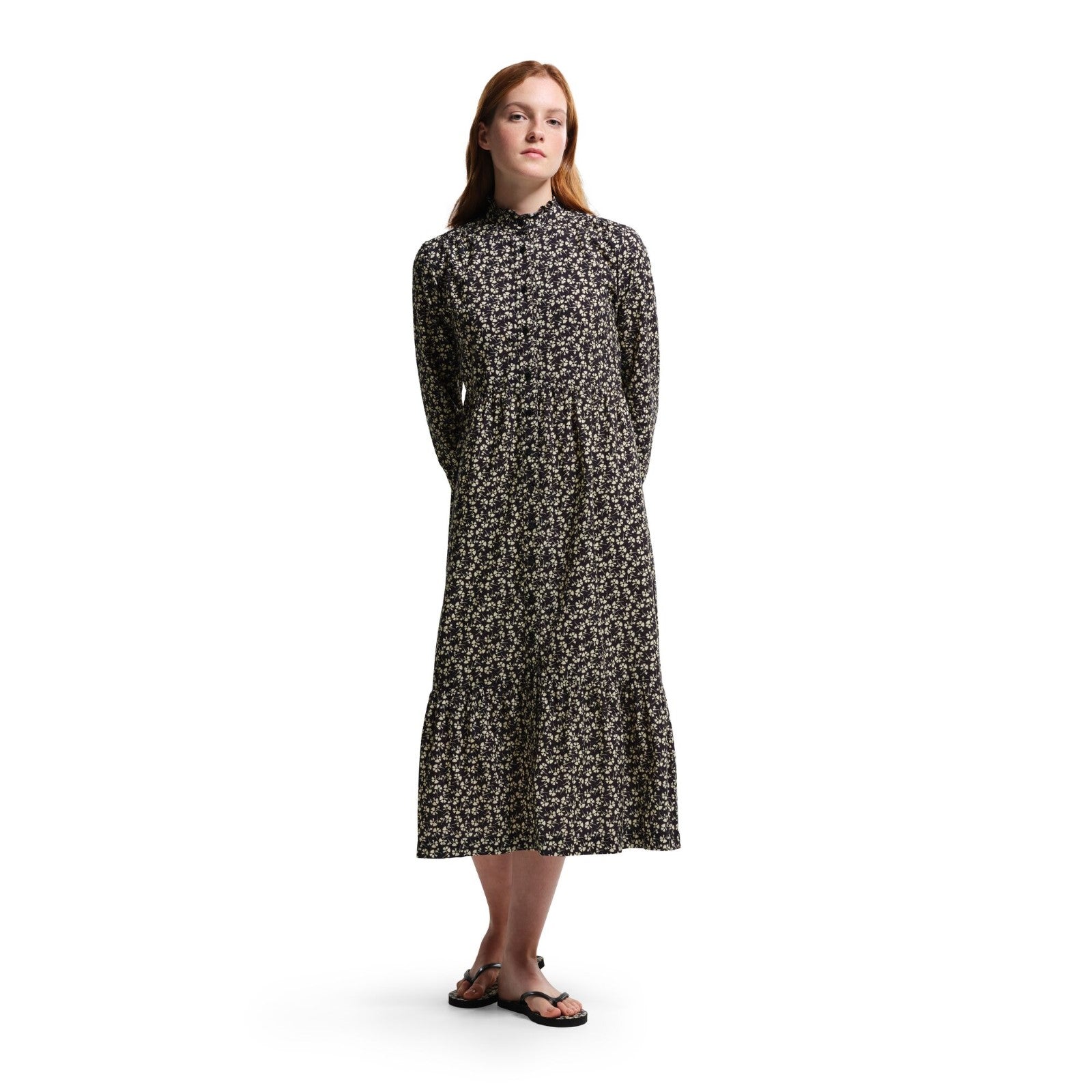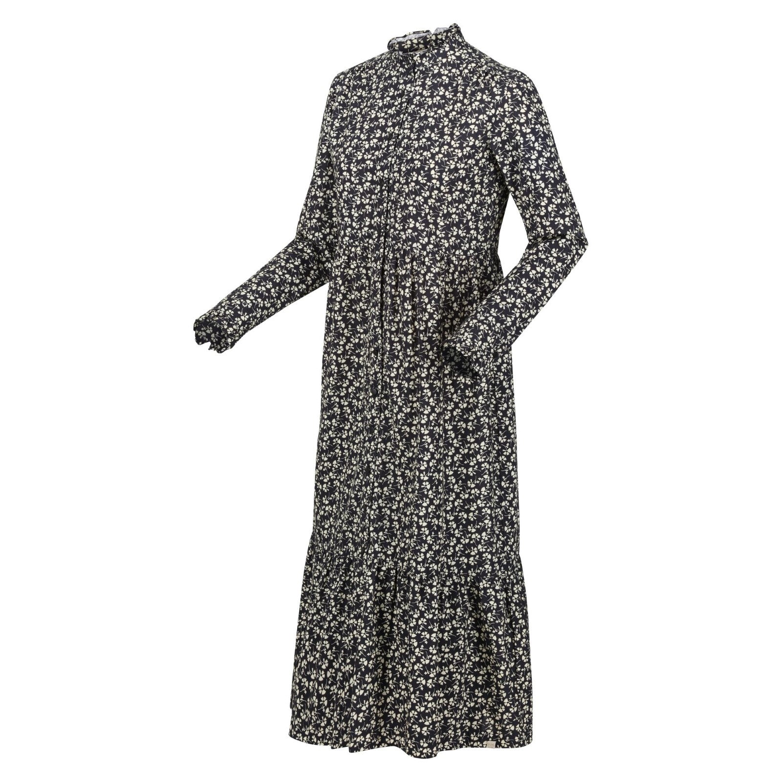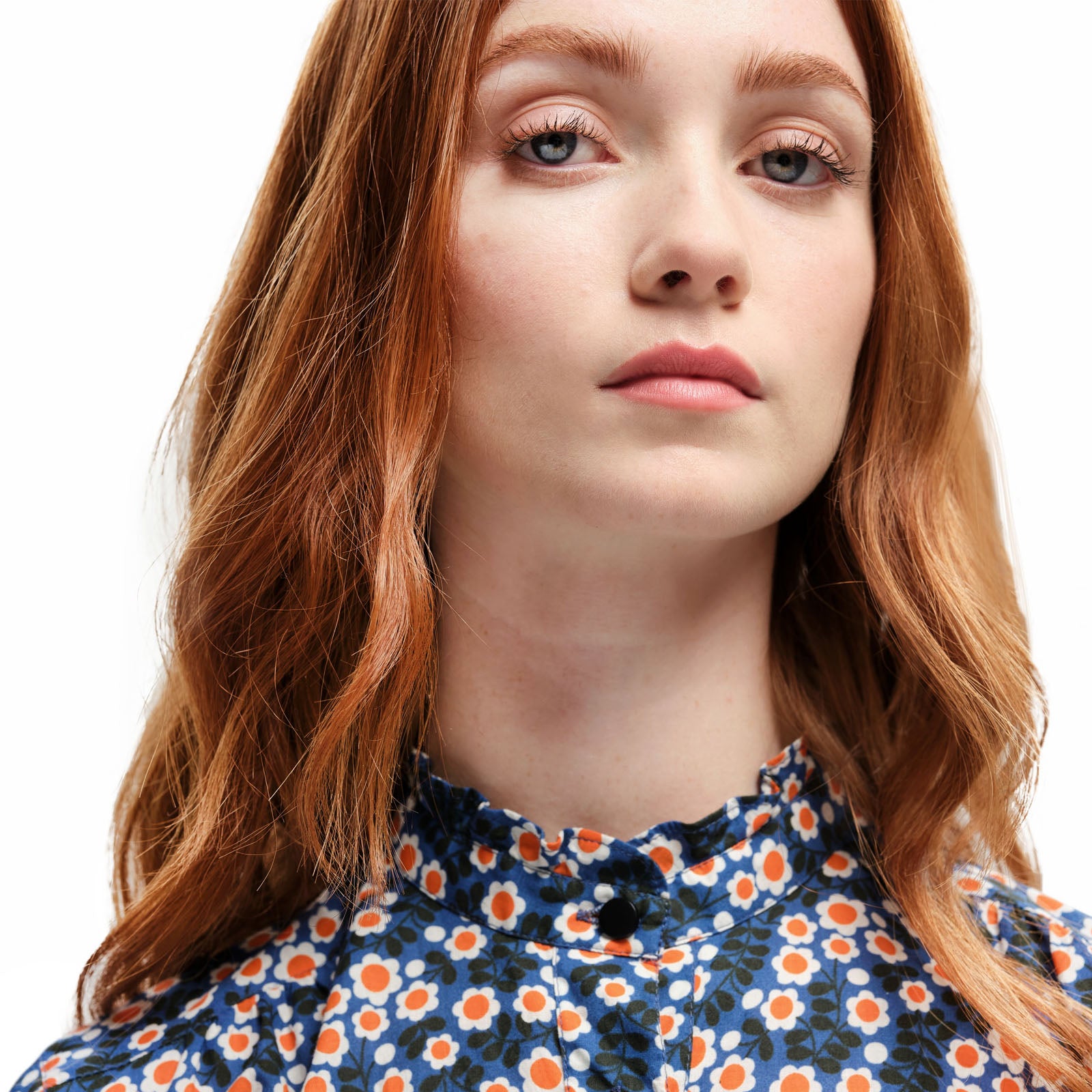 - This playful style features an all over floral print, high neck button front fastening and frill detail.