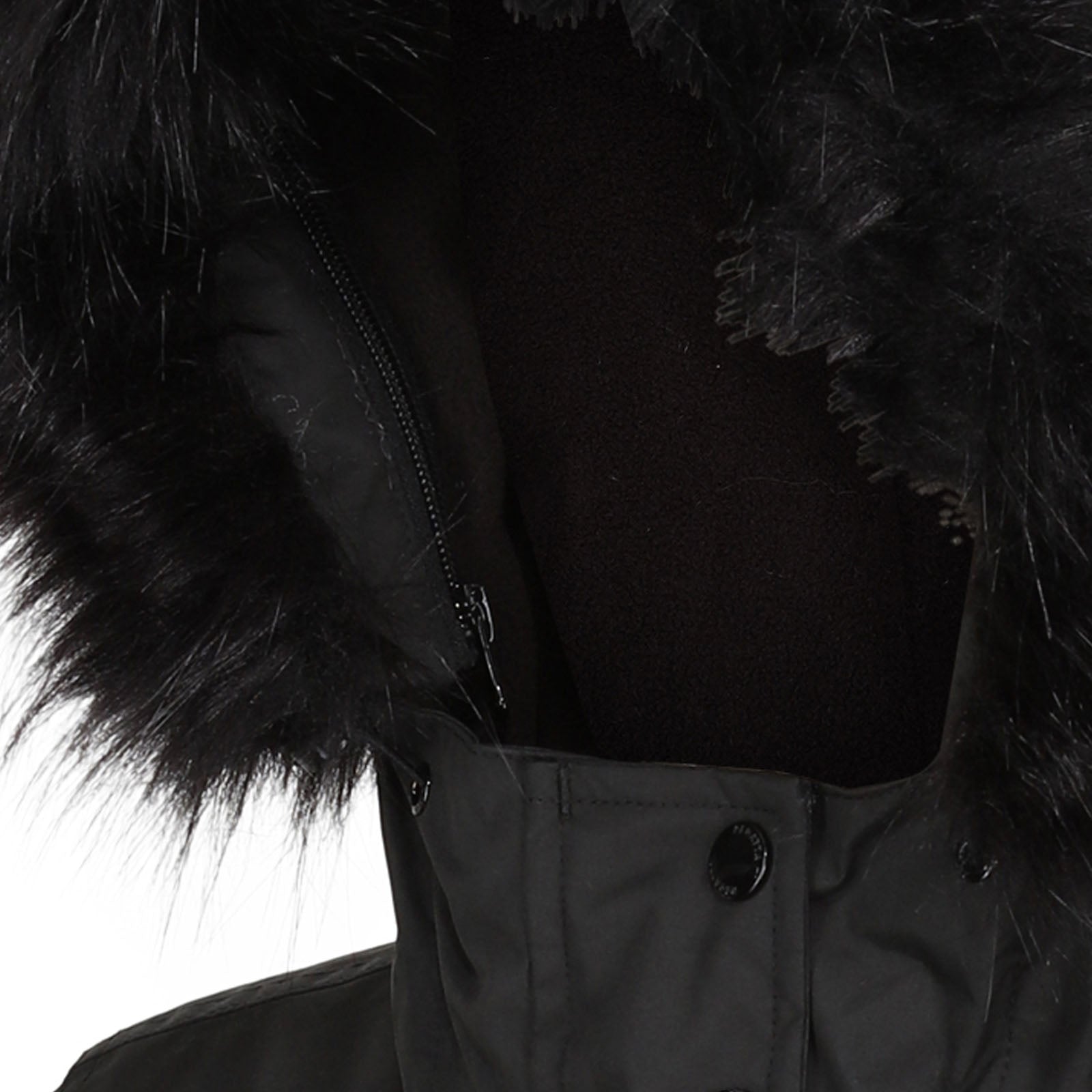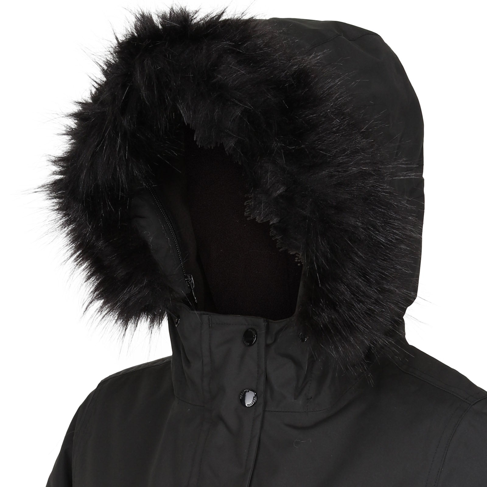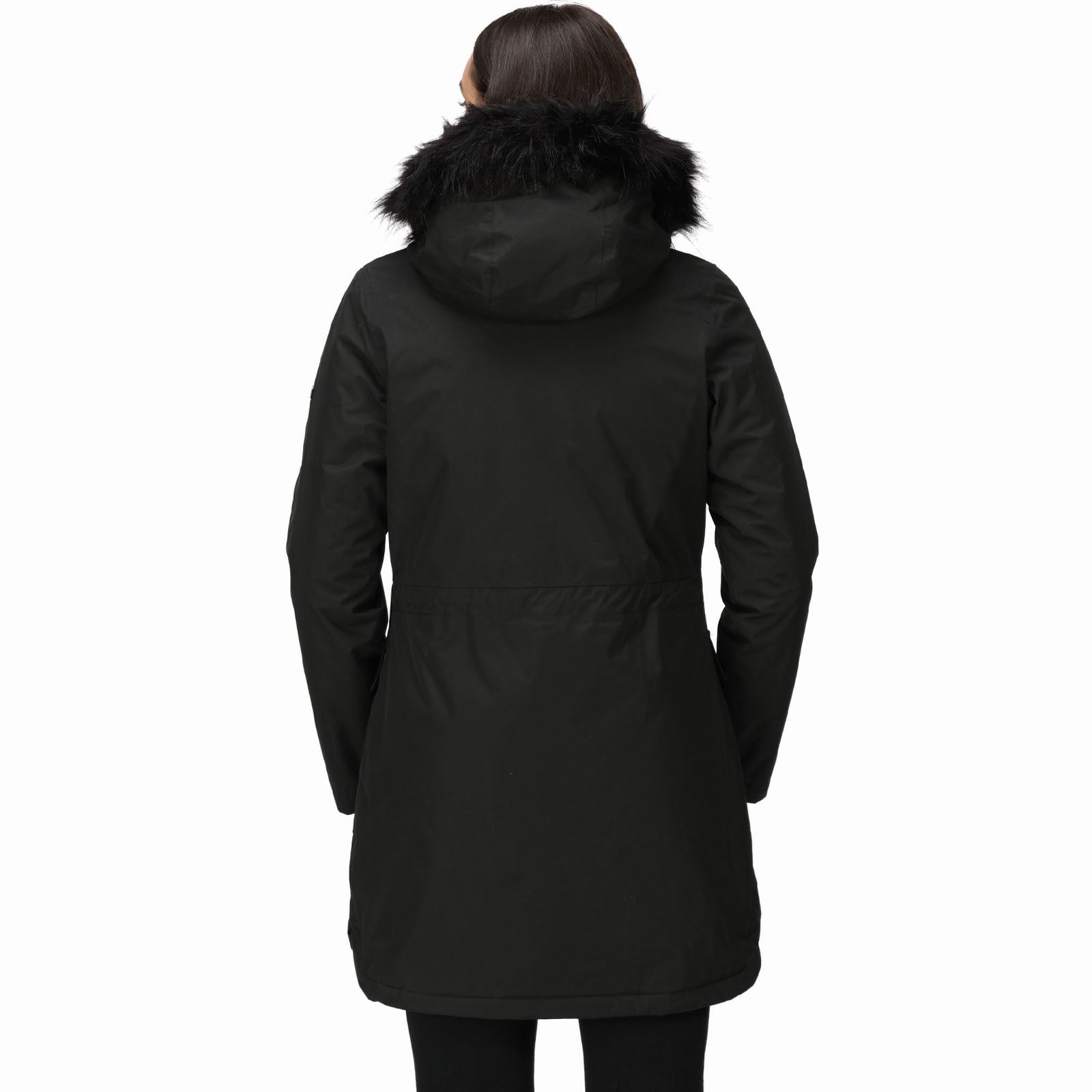 • There's a stylish curved hem and trendy faux fur trim to the collar