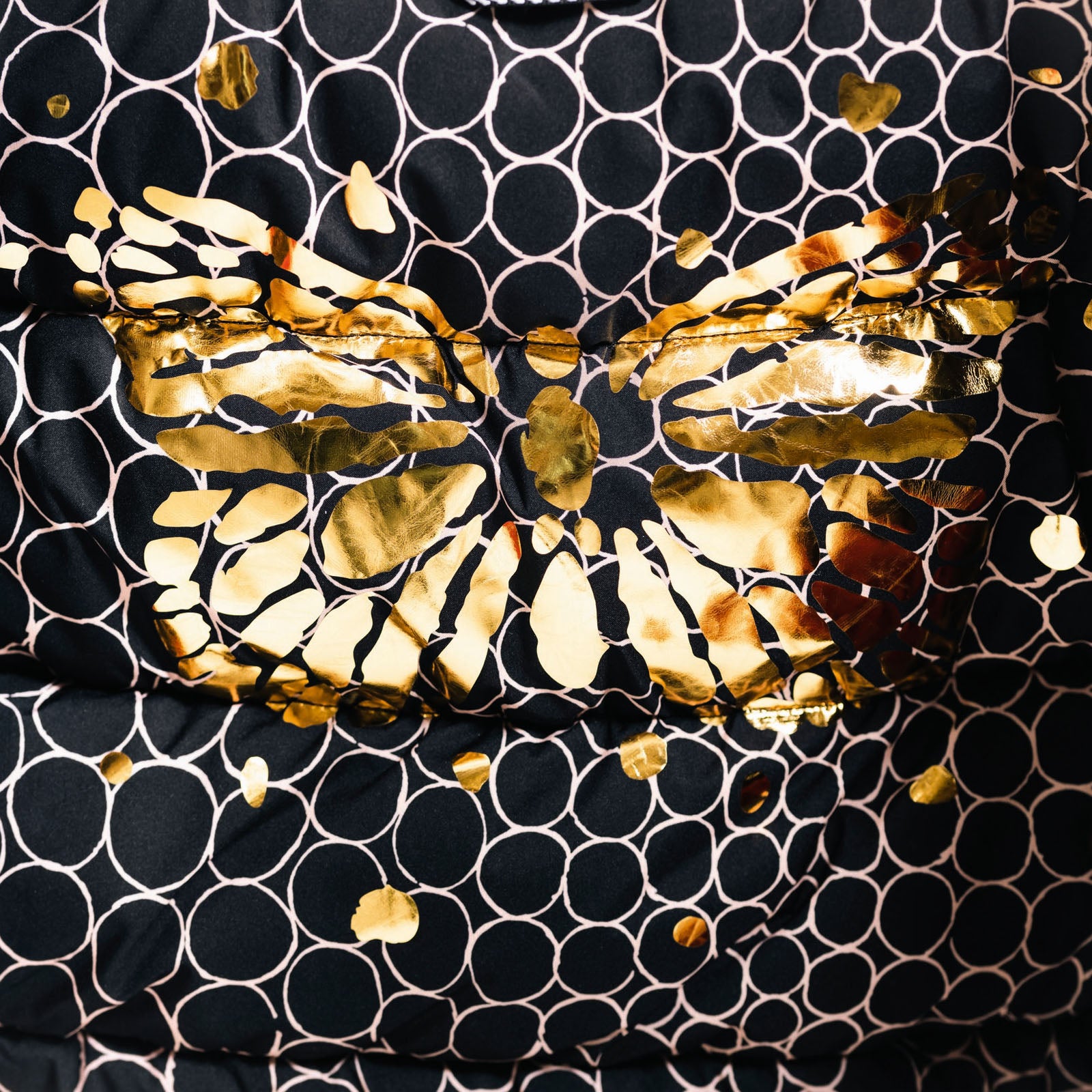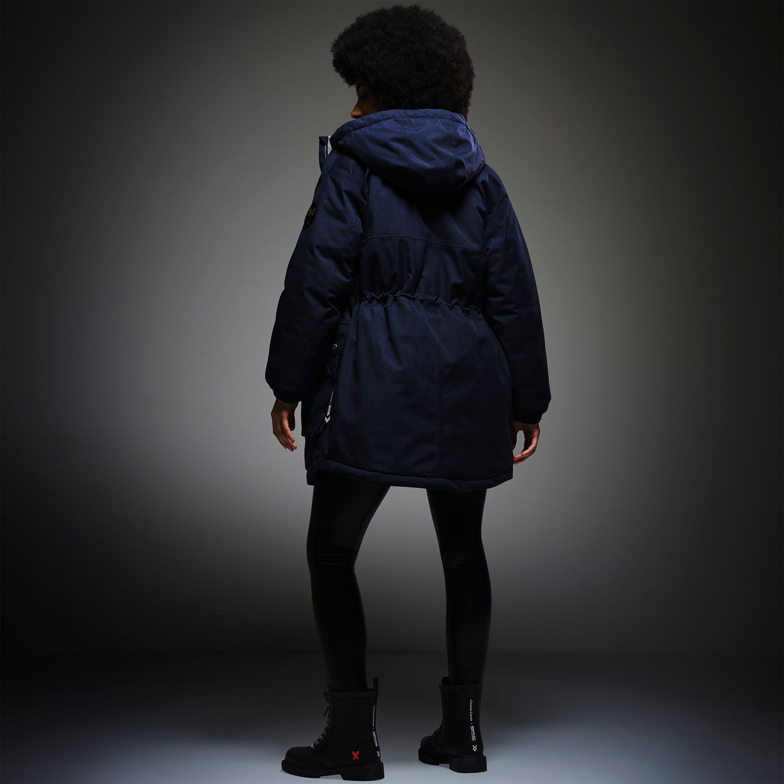 • With balloon sleeves, baffled lining panels, inner adjustable chevron shoulder straps, grown on hood and pockets.