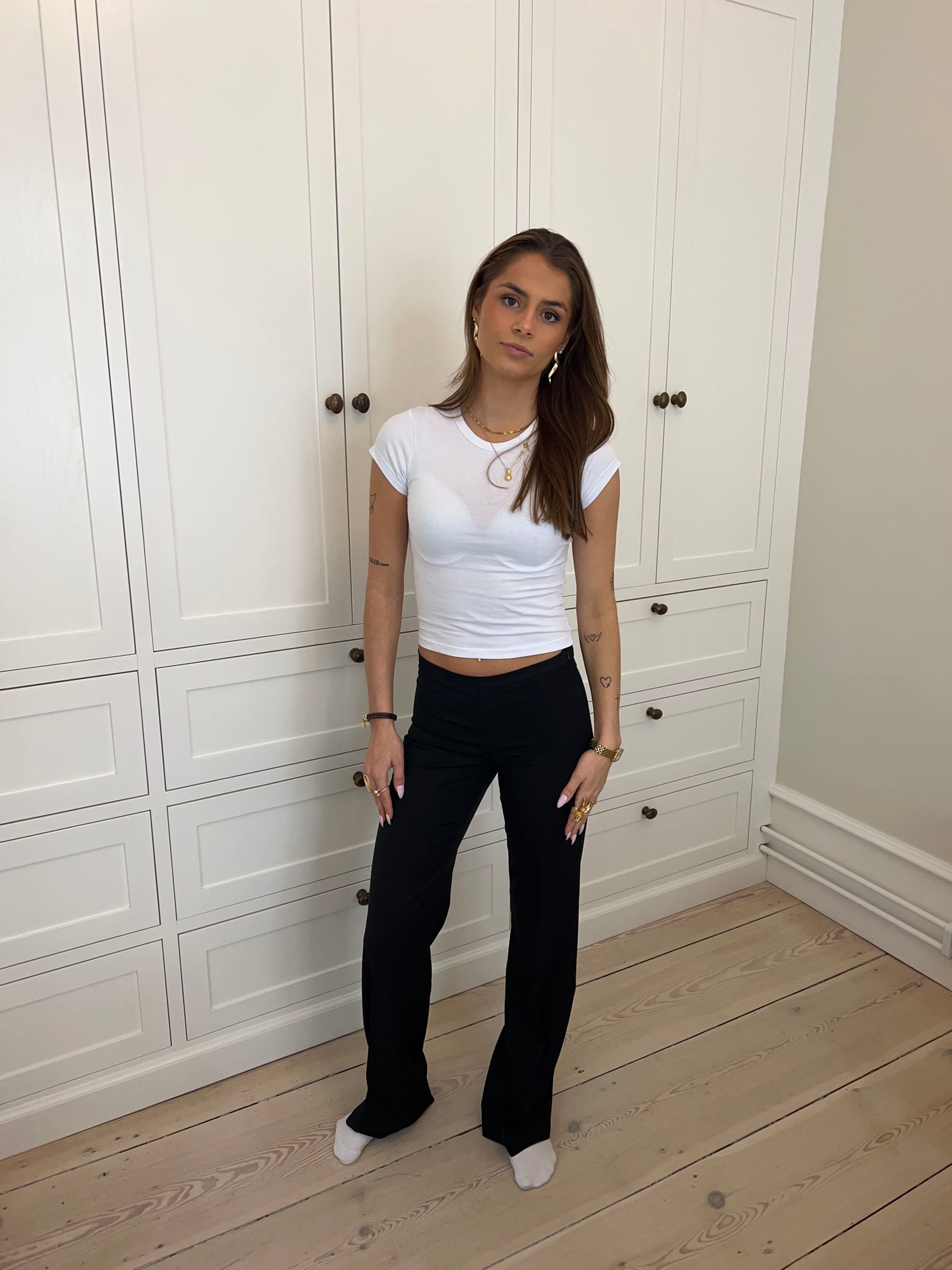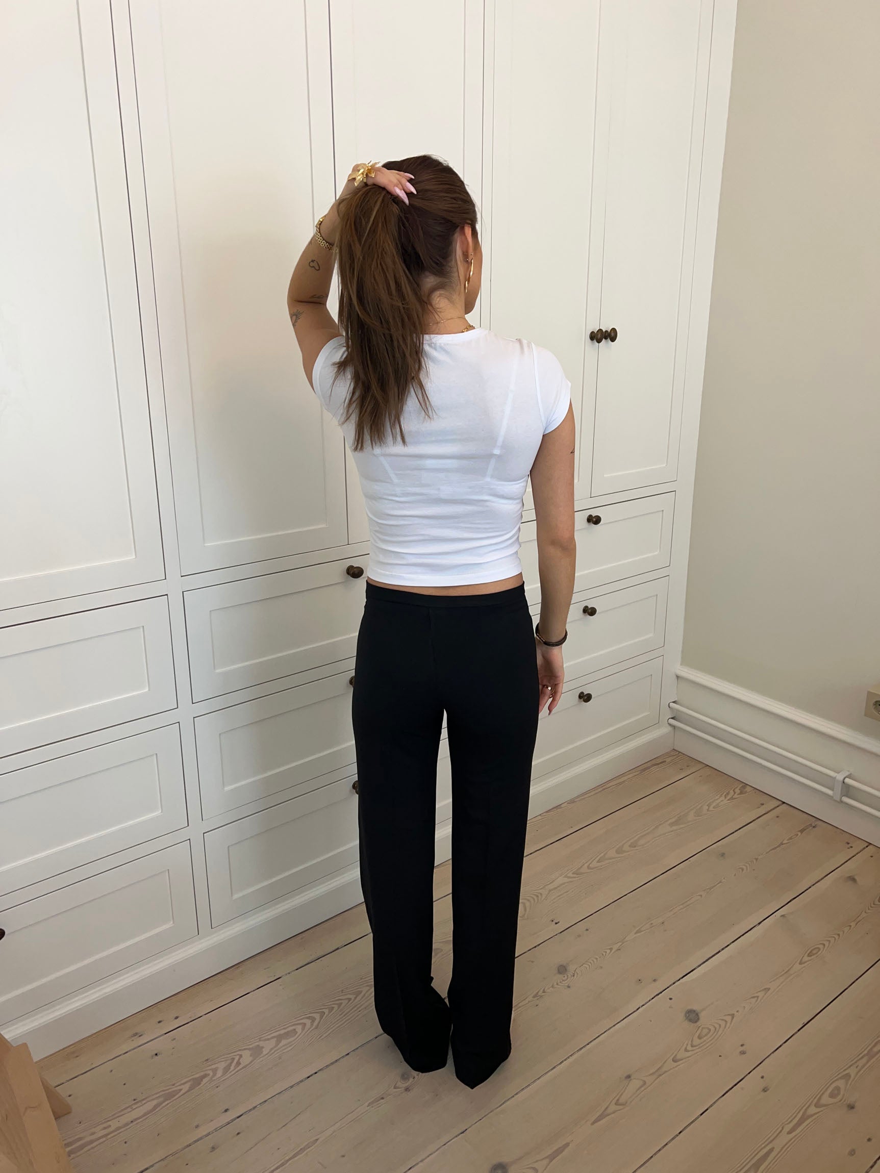 These elegant black suit trousers feature a flattering, form-fitting cut around the waist and hips, flowing into a beautiful wide silhouette at the bottom. The sleek design provides a sophisticated look, perfect for both everyday wear and special occasions. The trousers can be worn alone for a classic style or layered over a skirt for a unique and fashion-forward outfit.