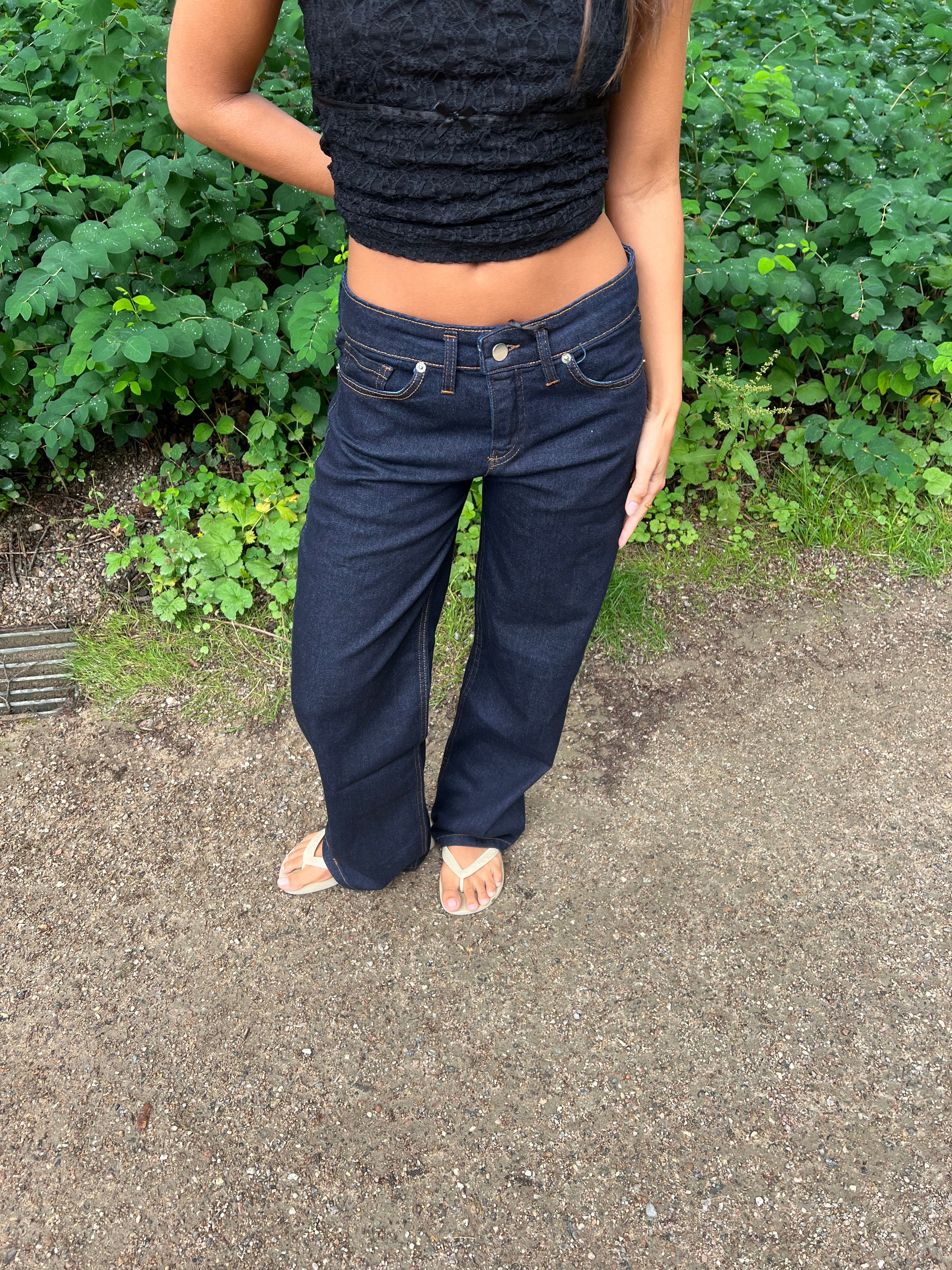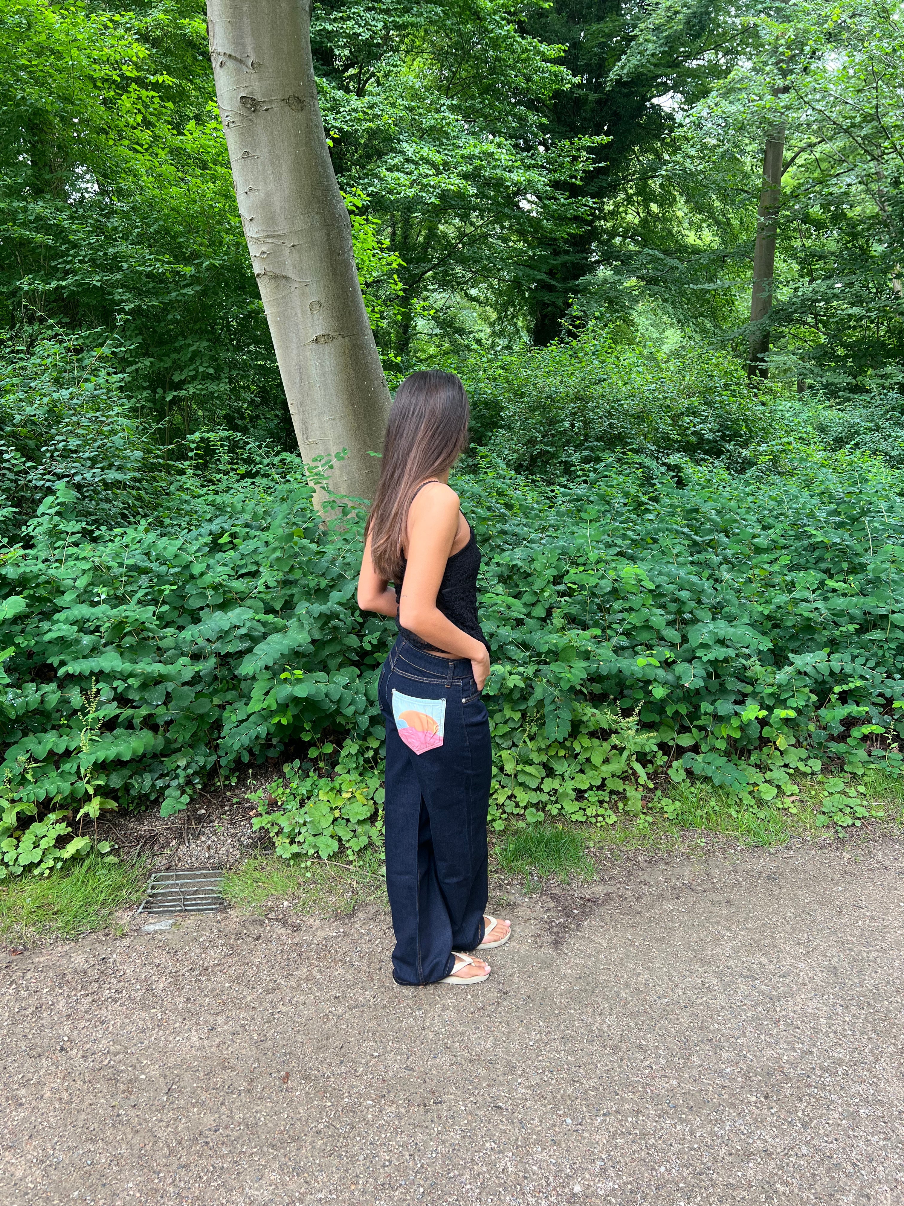 These jeans have a loose and baggy fit. They have a straight fit and a low waist. The trousers have the coolest detail on one back pocket.