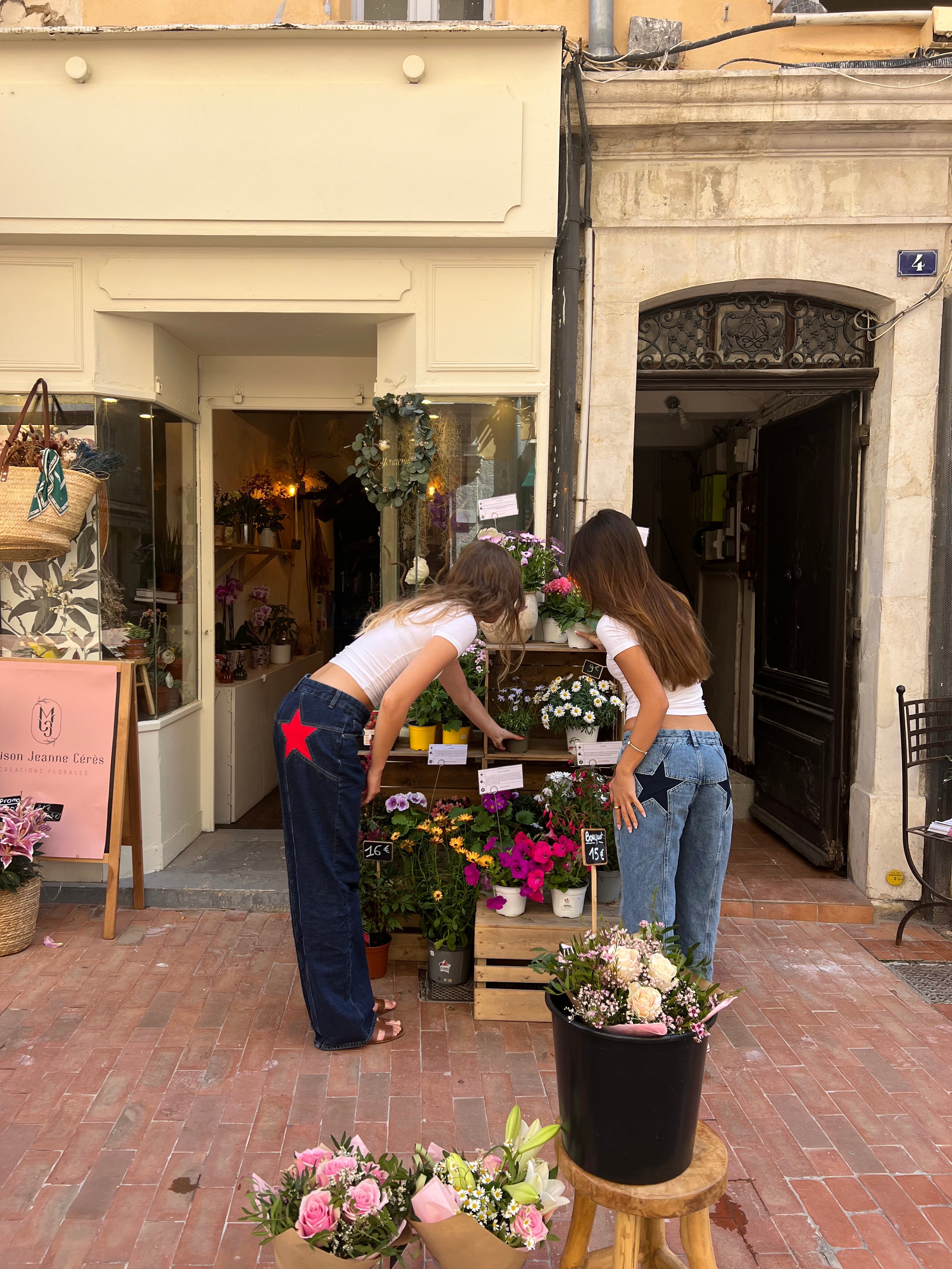 The coolest jeans with red stars on the back. The jeans have a loose and straight fit and a mid-waist. They have belt loops and a zipper and button closure.