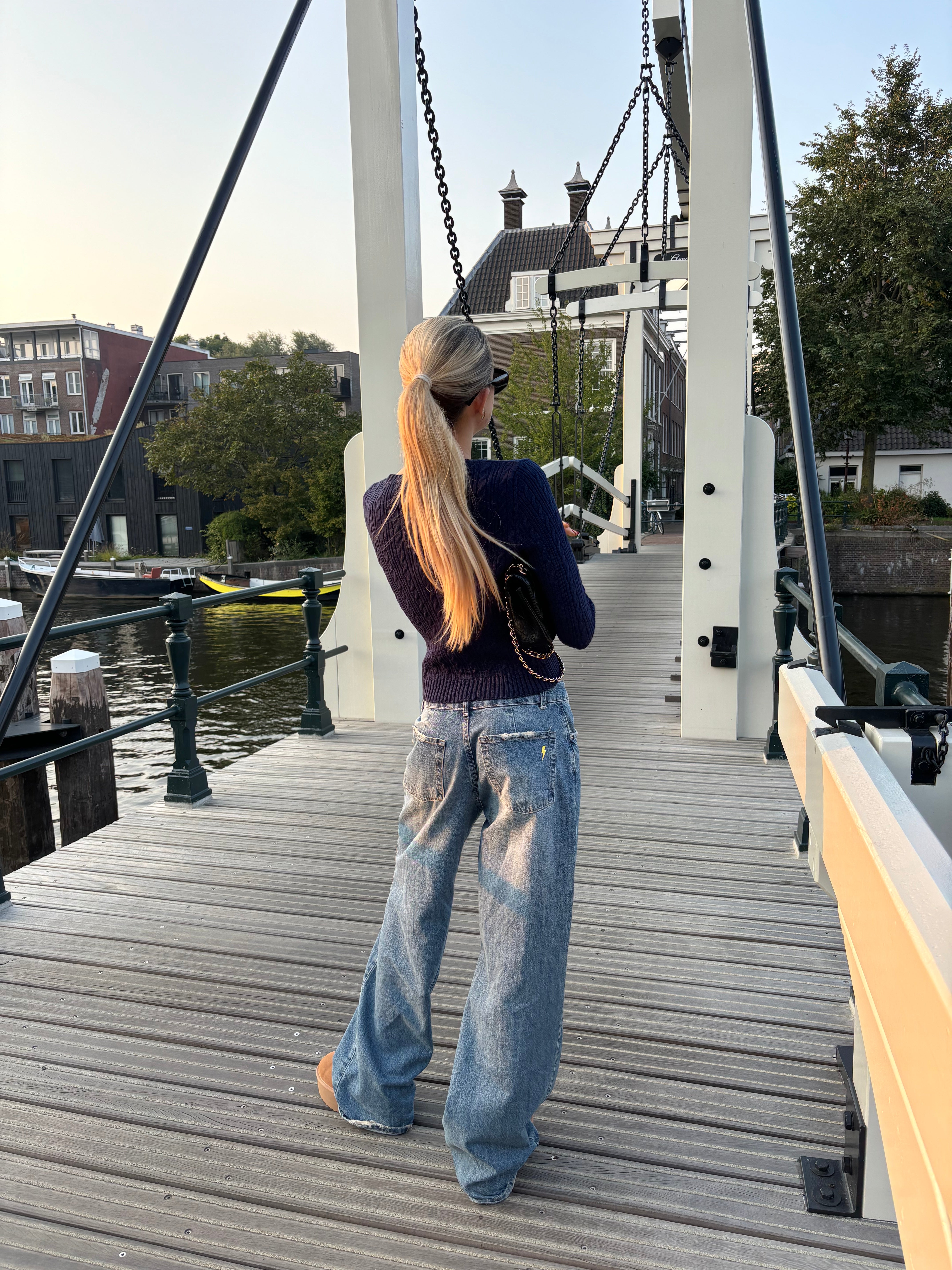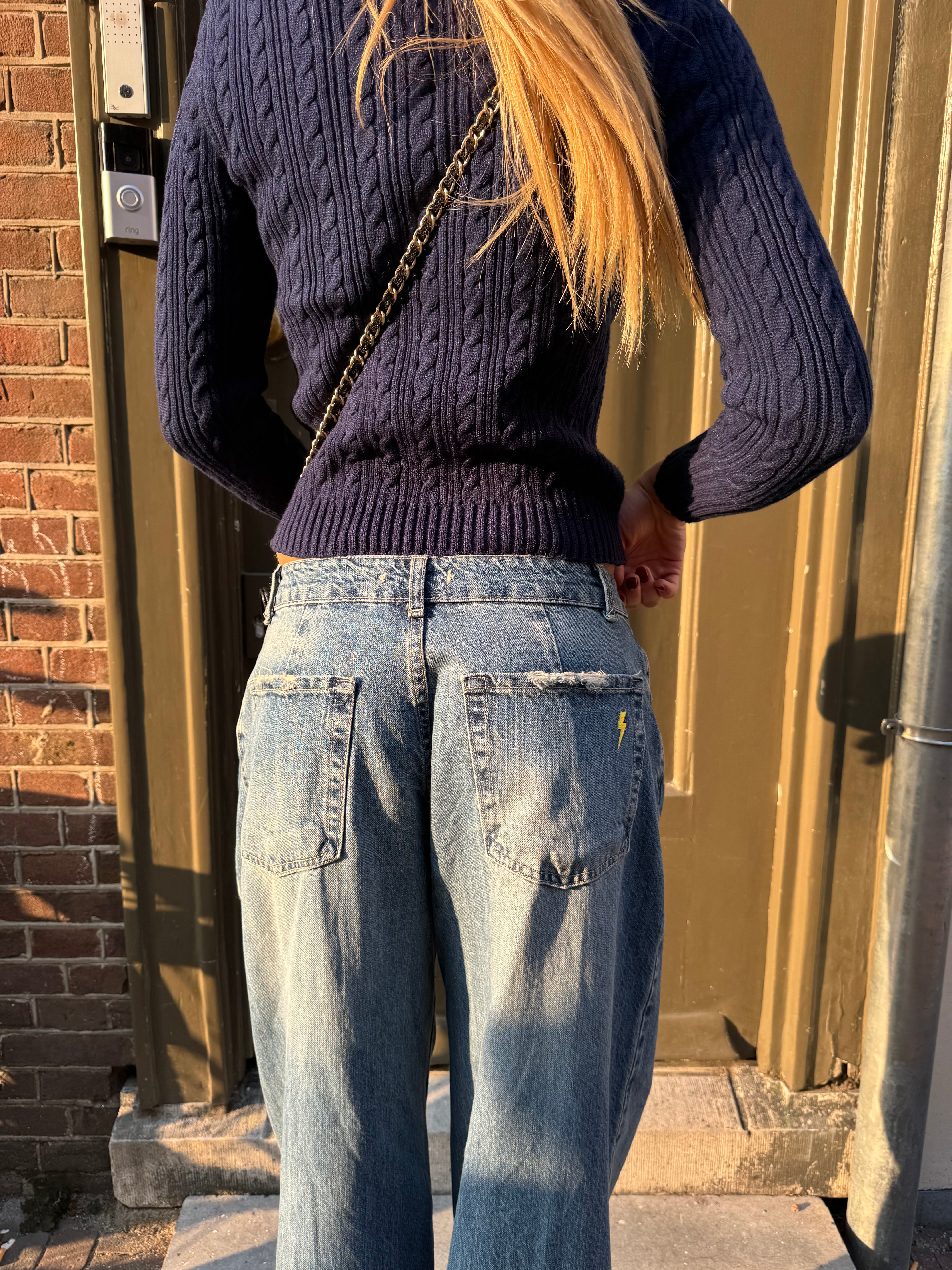 These jeans have the coolest lightning detail at the back that makes them unique. The jeans have a low waist and a loose and long length. They have belt loops and a front zipper and button closure.