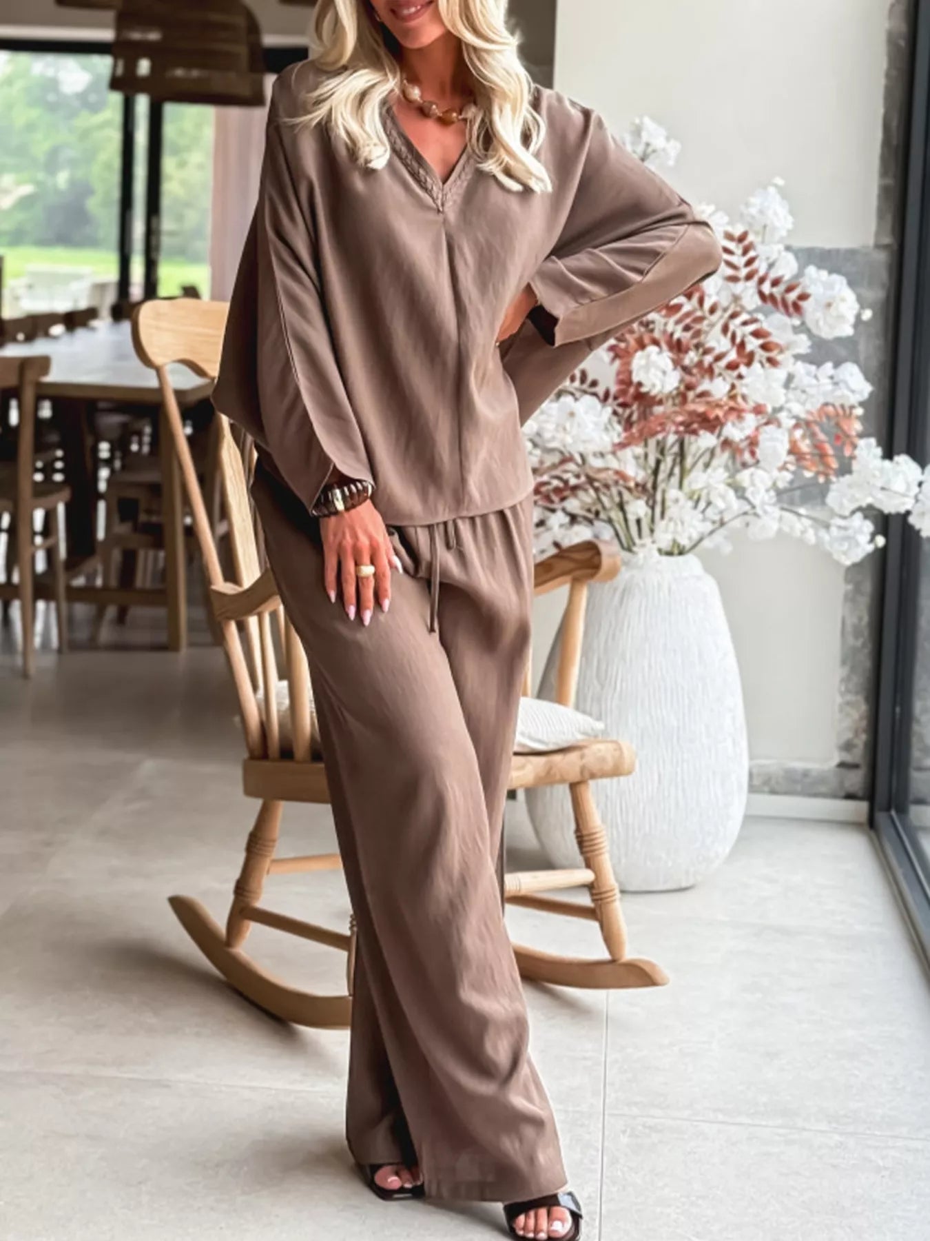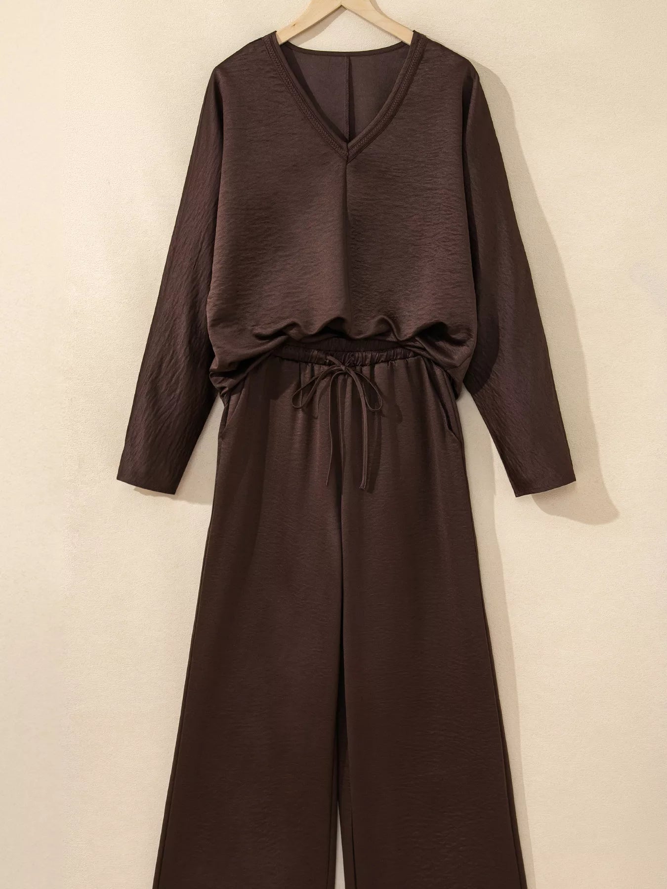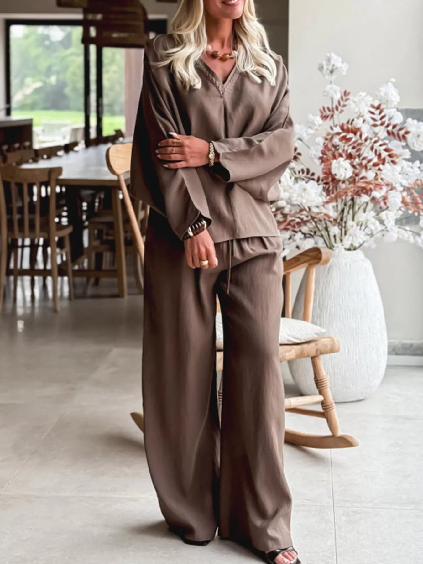 Braided V Neck Long Sleeve Loose Top and Drawstring High Waist Pants 2pcs Outfit