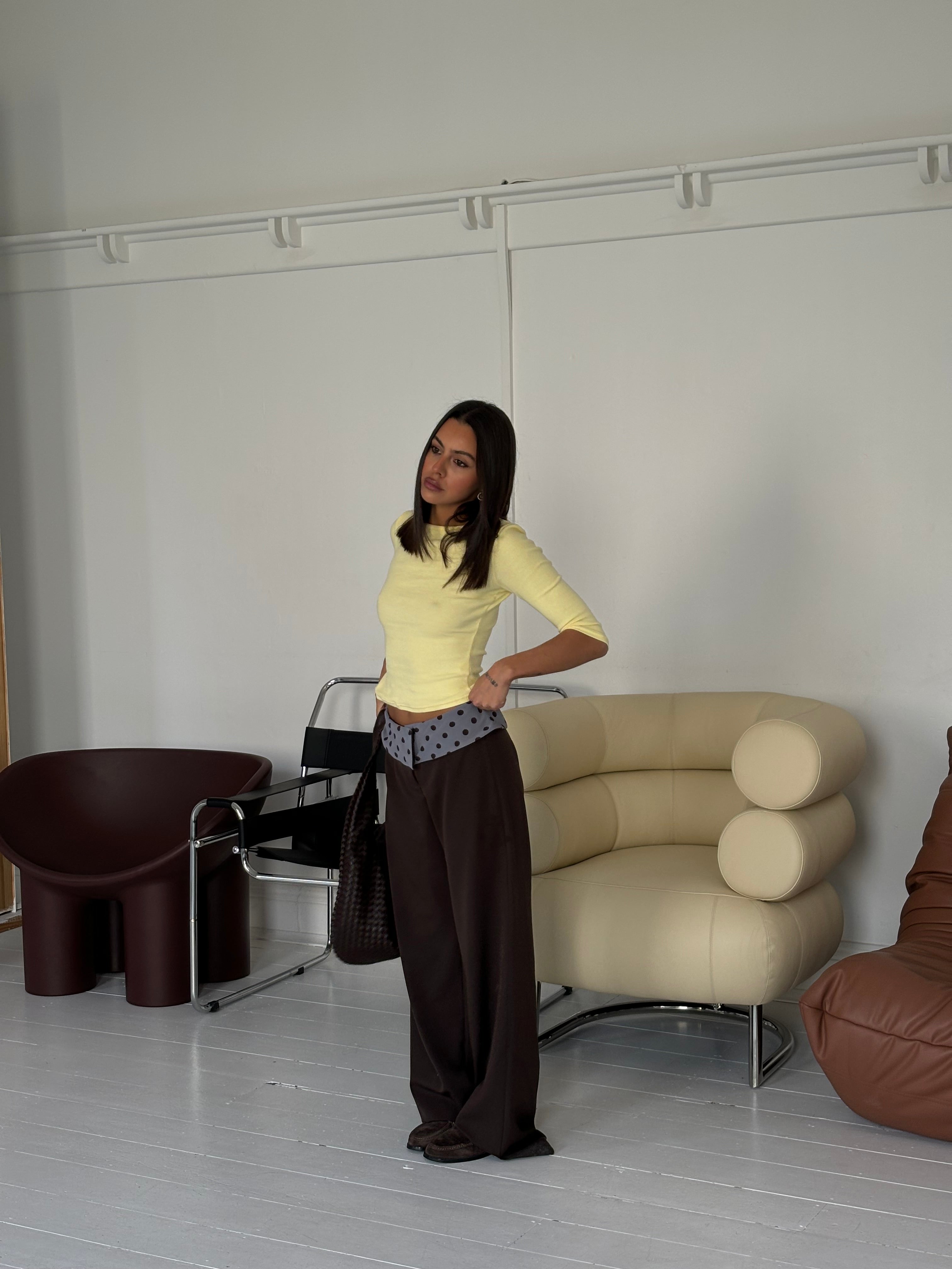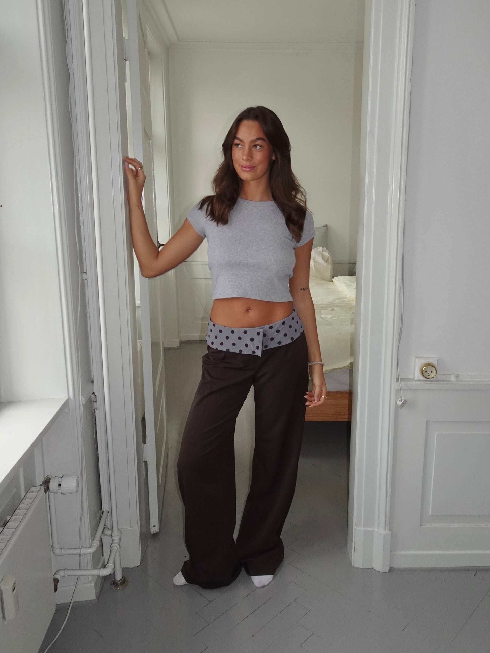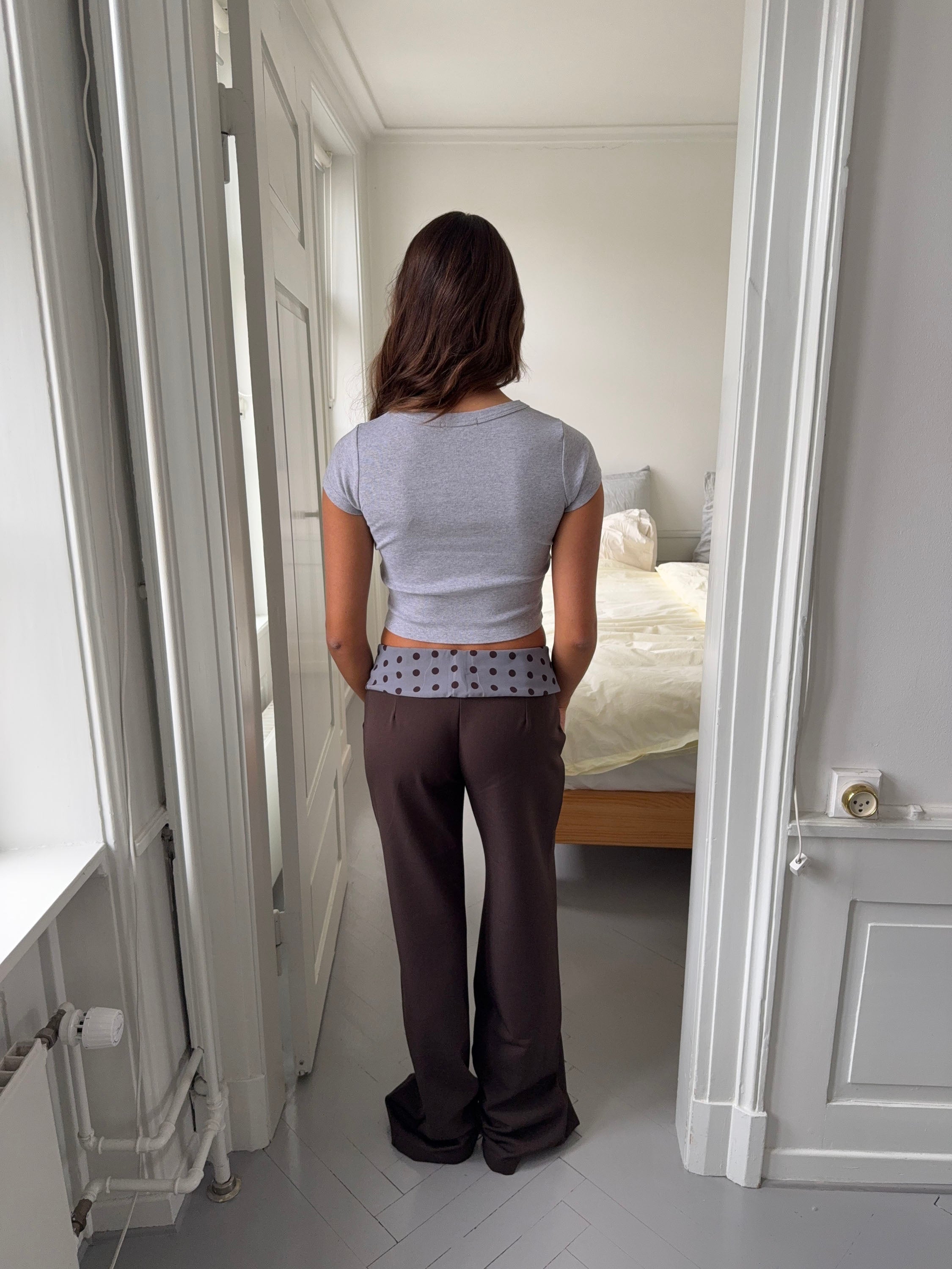 These loose-fit suit trousers in brown offer an elegant alternative to classic dress pants, featuring a subtle yet eye-catching detail. The delicate blue polka dot trim along the waistband sets them apart from traditional styles, adding a sophisticated and festive touch. With their relaxed fit, these trousers combine comfort with style, while the classic brown hue makes them versatile and easy to style. The unique waistband detail adds a modern twist, making these trousers perfect for both special occasions and more formal settings where you want to stand out with a refined, luxurious look.