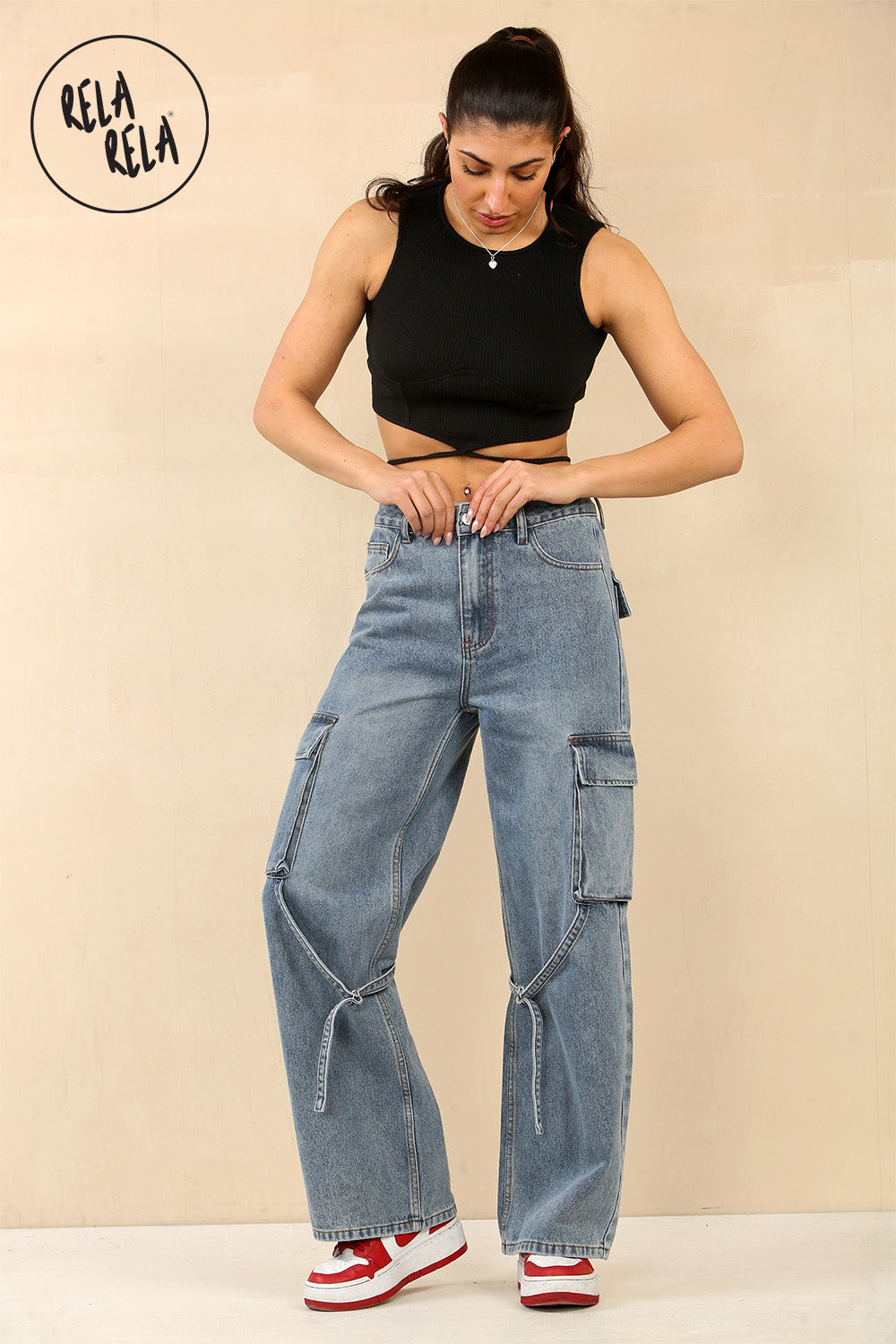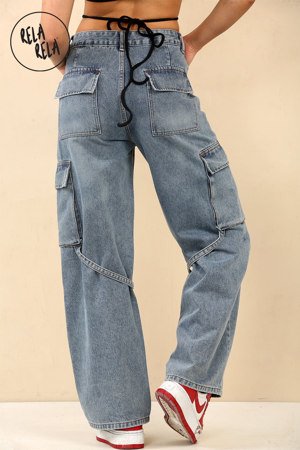 Cargo Jeans Denim Blue Straight Wide Leg Baggy Jeans