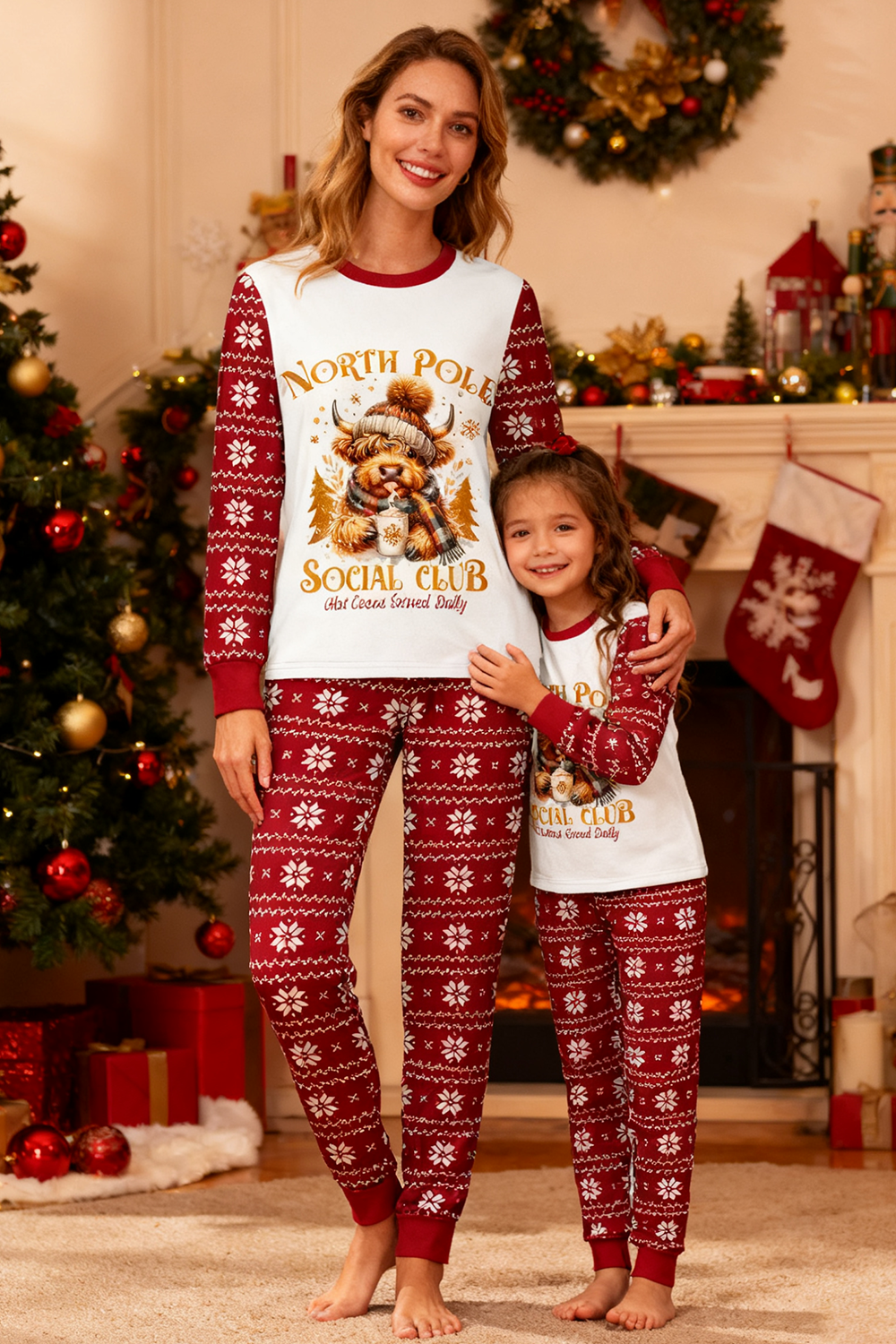 A mother and daughter, glowing with joy in matching festive pajamas, share a tender moment before their beautifully adorned Christmas tree, surrounded by the warmth of holiday decorations.​ No one can resist the warmth and joy of Christmas and the New Year. Let the whole family wear these special Christmas-themed pajamas together!