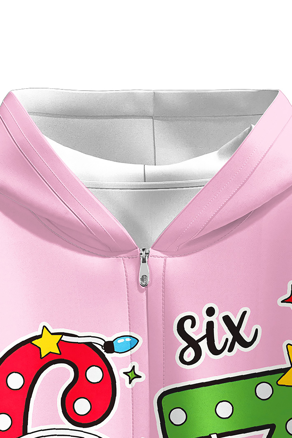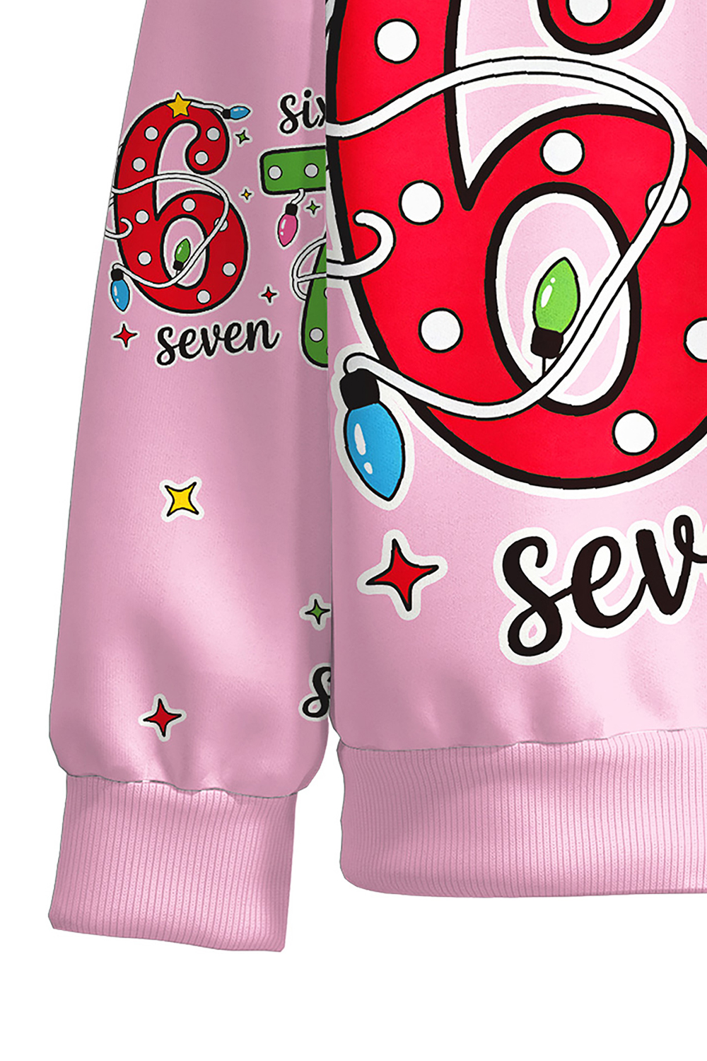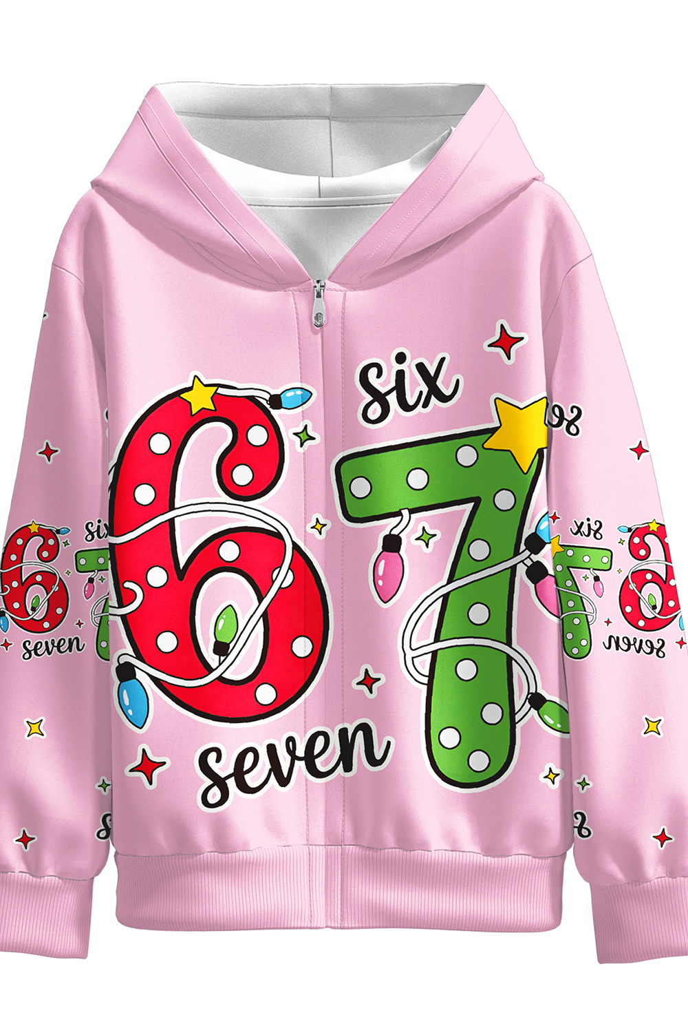 This vibrant pink hoodie features oversized "6" and "7" numbers wrapped in colorful Christmas lights, with playful stars and confetti patterns all over. Perfectly cozy for festive photos, holiday parties, or everyday fun! These unique SIX SEVEN pajamas make the ultimate holiday gift.