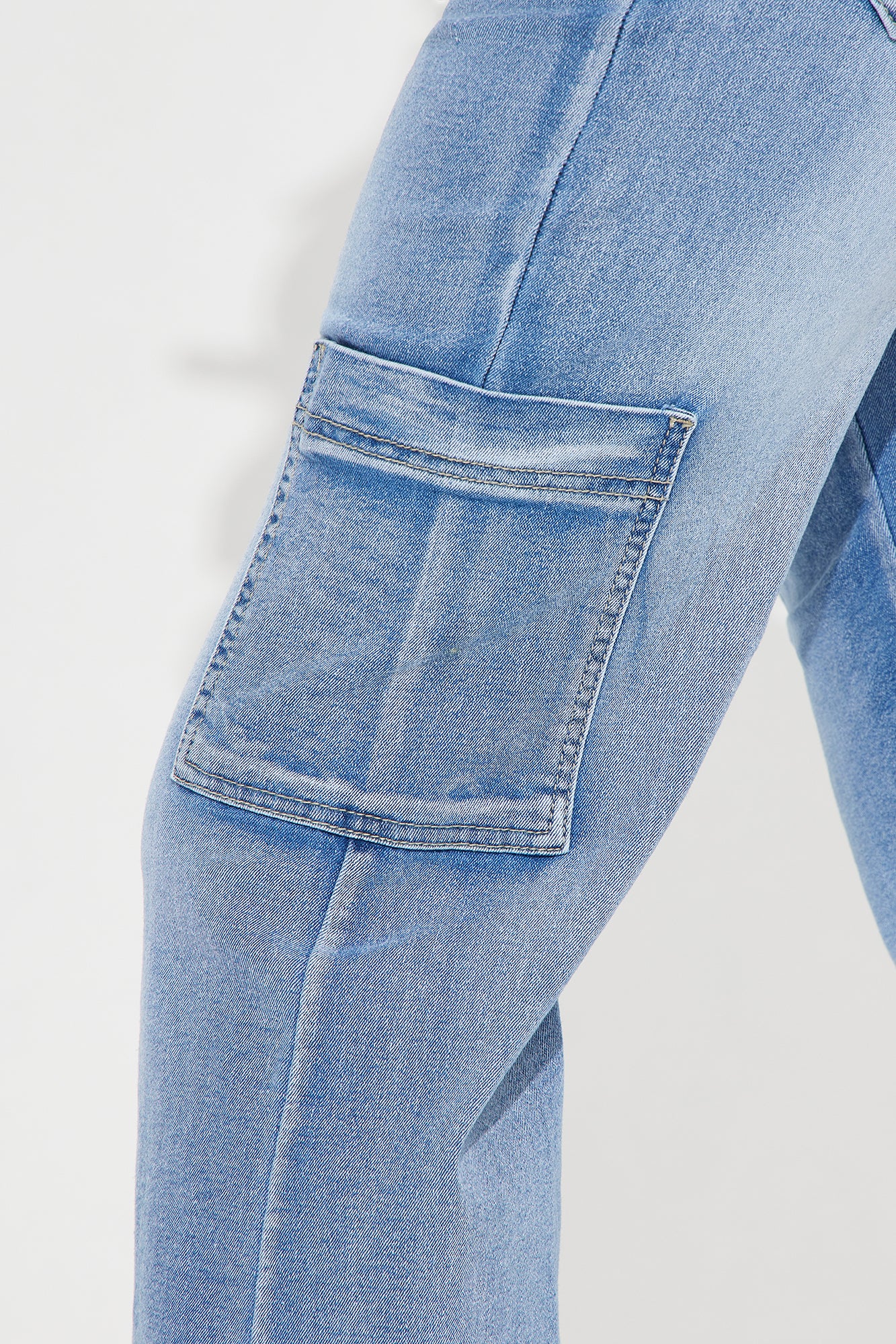 Available In Medium Wash.Wide Leg JeanFunctional Cargo PocketsPleatedHigh Stretch10" Mid Rise32.5" InseamHigh StretchDisclaimer: Due To The Wash Process, Each Garment Is Unique.54% Cotton 26% Polyester 18% Rayon 2% SpandexImported