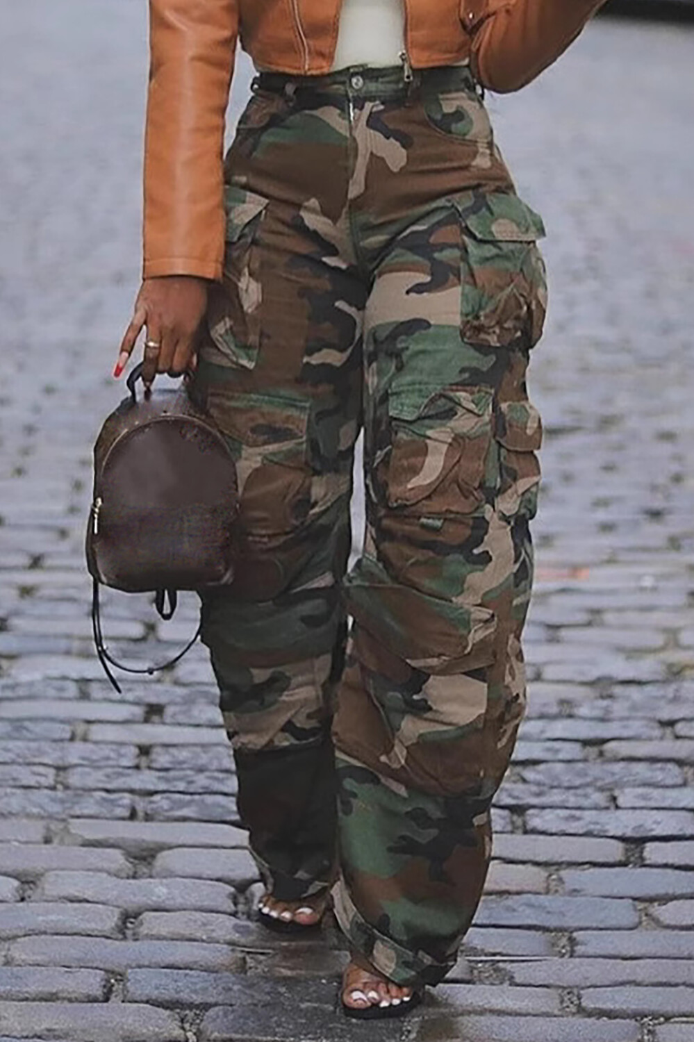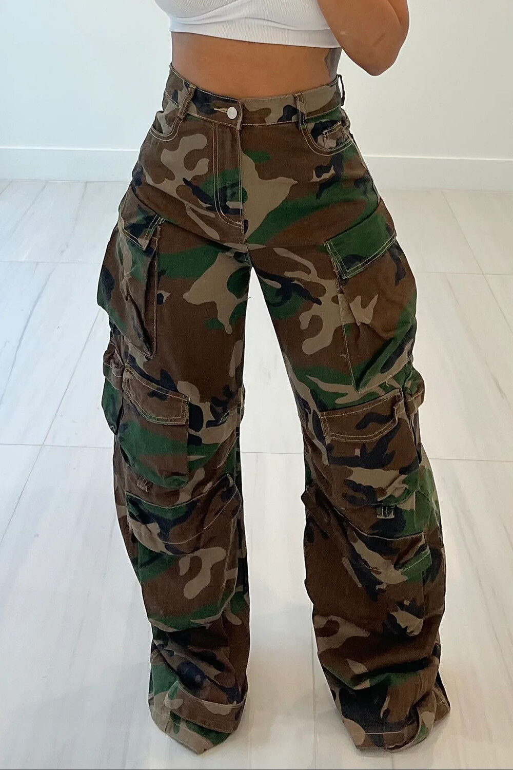 Denim Camo Print High Waist Pockets Cargo Jeans-Green