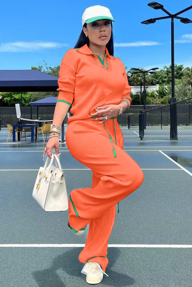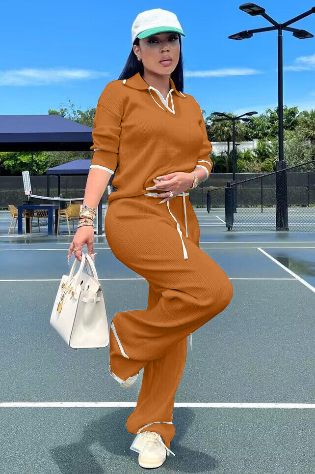 Knit Turndown Collar Long Sleeve Top Straight Leg Casual Pants Matching Set