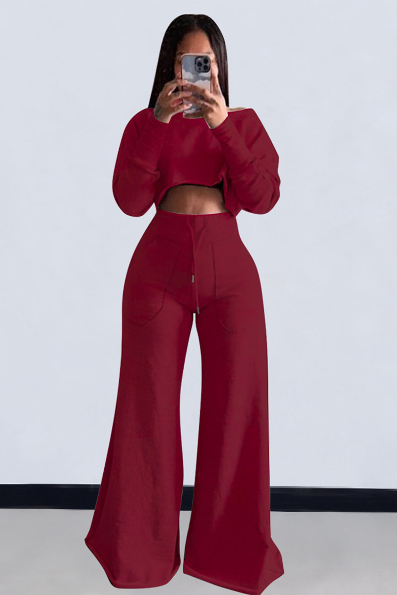 Plain Long Sleeve Crop Sweatshirt Pocket Wide Leg Pants Matching Set-Grey