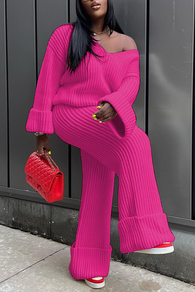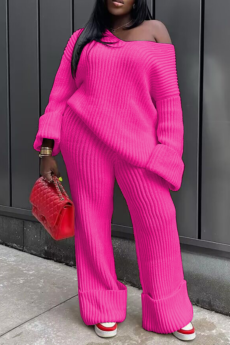 Pleated Knit Off Shoulder Long Sleeve Sweater Straight Leg Pants Matching Set-White