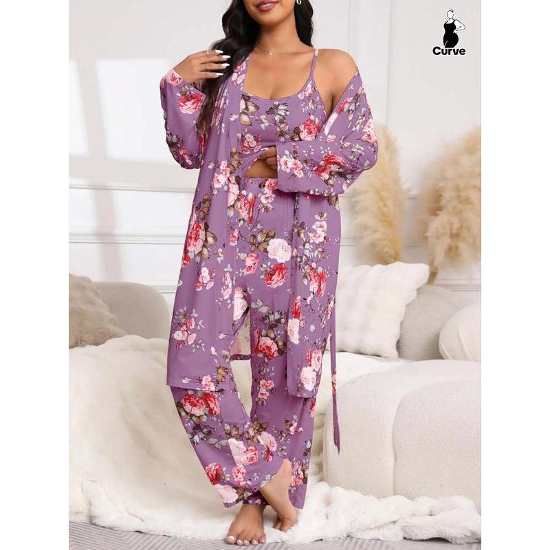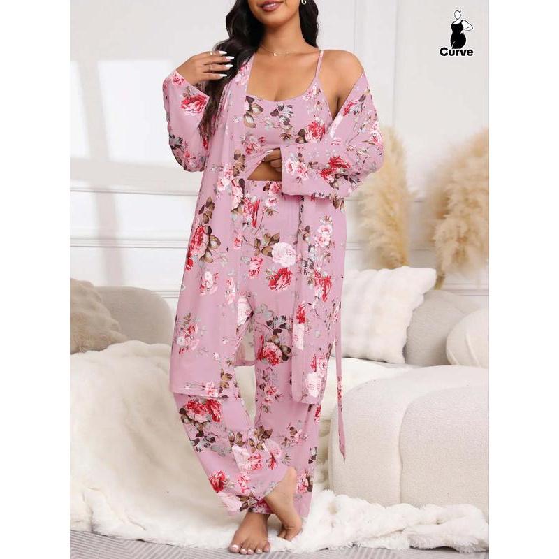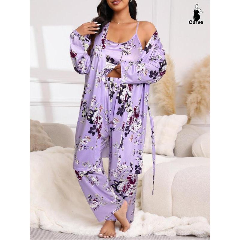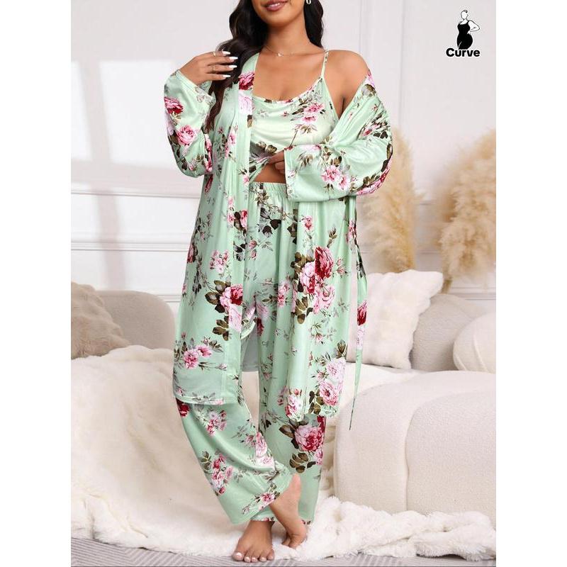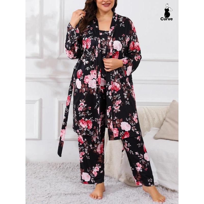 [Plus Size] Three-Piece Set Floral Print Belted Lounge Robe & Cami Top & Elastic Waist Pants Pyjama Set, Elegant Comfy Drop Shoulder Long Sleeve Robe & Sleeveless Top & Bow Decor Trousers PJ Set, Women's Sleepwear for Spring & Fall