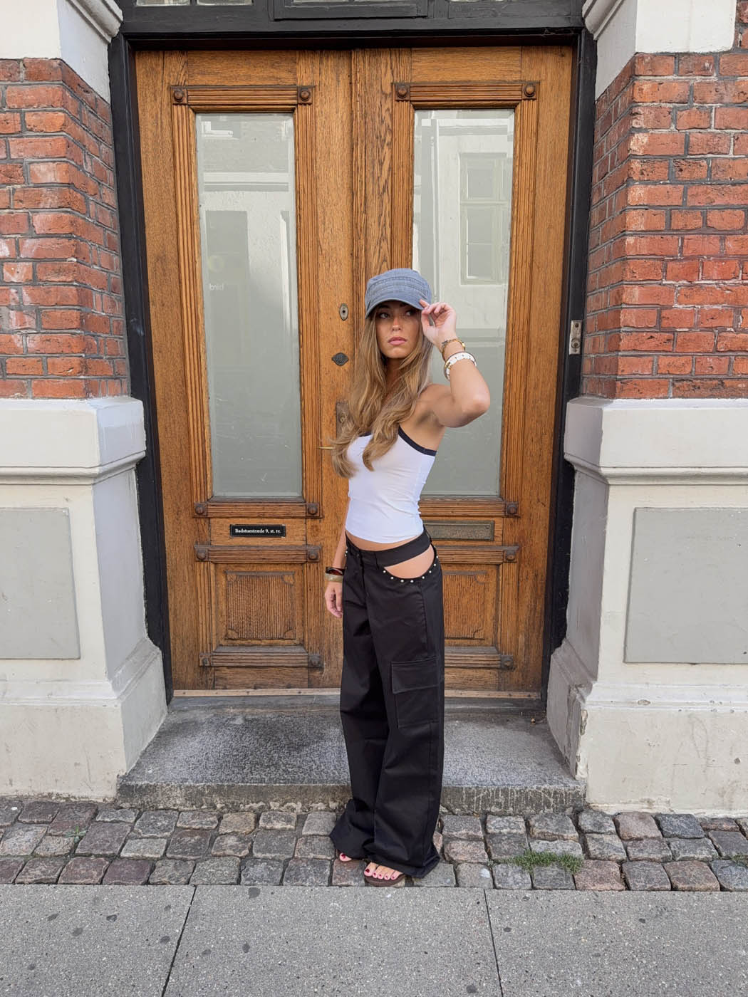 These black trousers combine a classic expression with edgy, modern details. Crafted from a heavy yet soft fabric that drapes beautifully, they create an elegant silhouette. The waist is accentuated by a wide tie belt that can be styled in a knot or bow, depending on the look and mood. Along the pocket edges, small shiny studs add subtle dimension and a bold contrast to the otherwise simple design. The fit is slightly tapered and flattering, with a focus on both comfort and style. A pair of trousers that effortlessly balance sophistication and a rebellious touch – perfect for both the office and a dinner out.