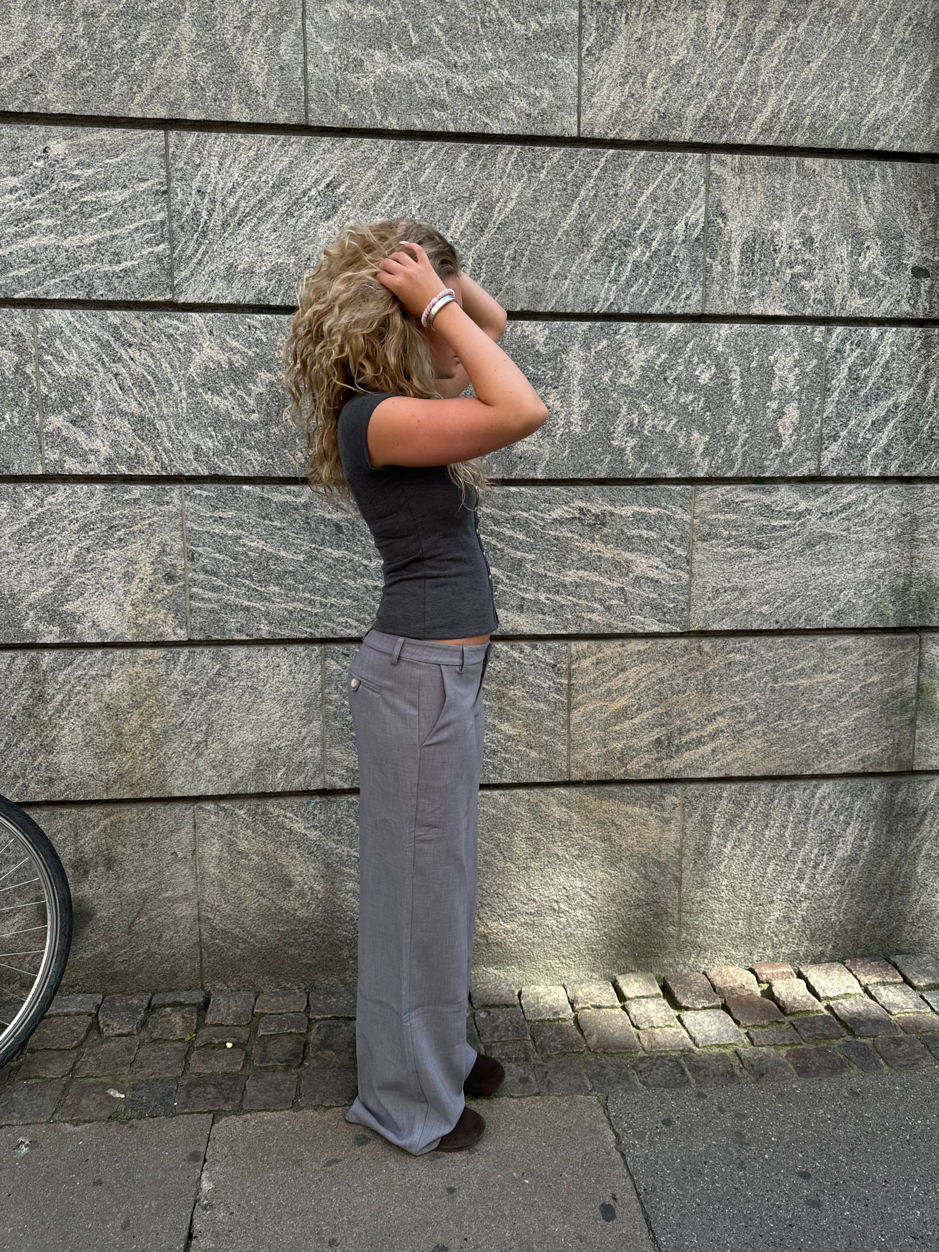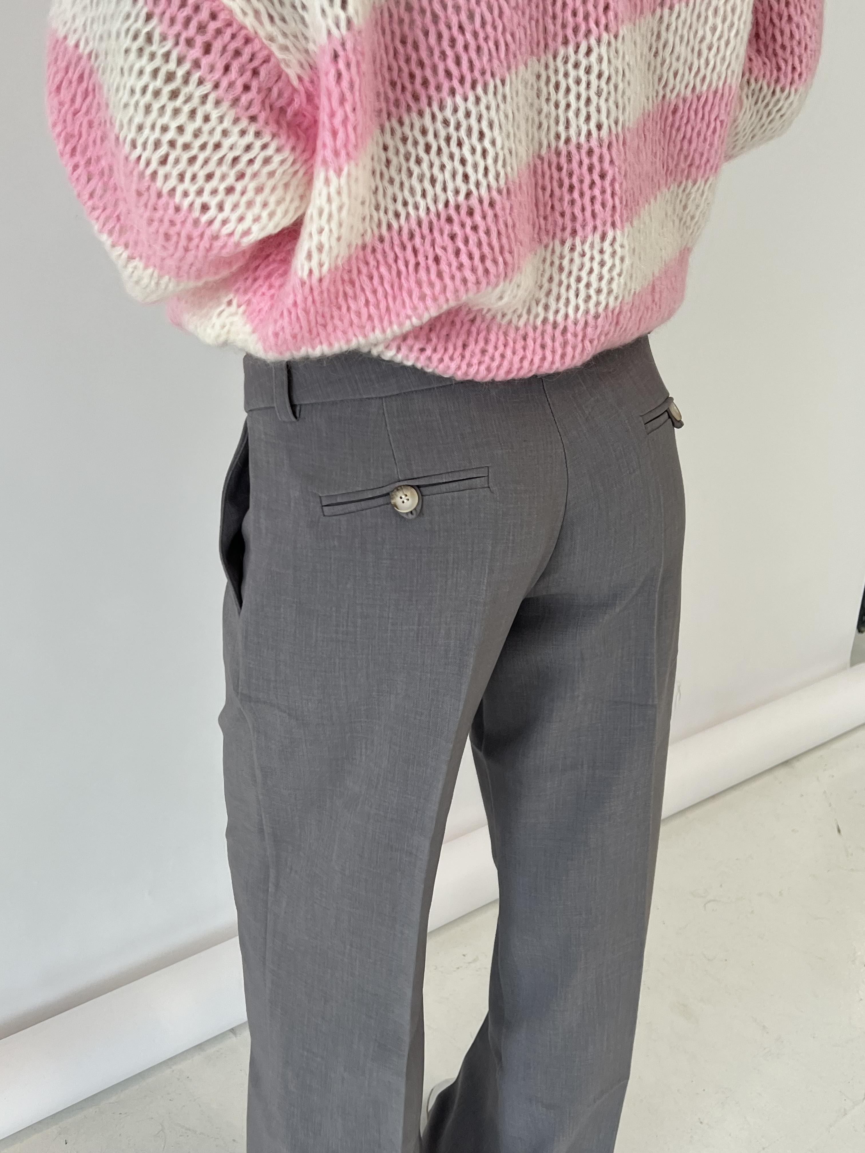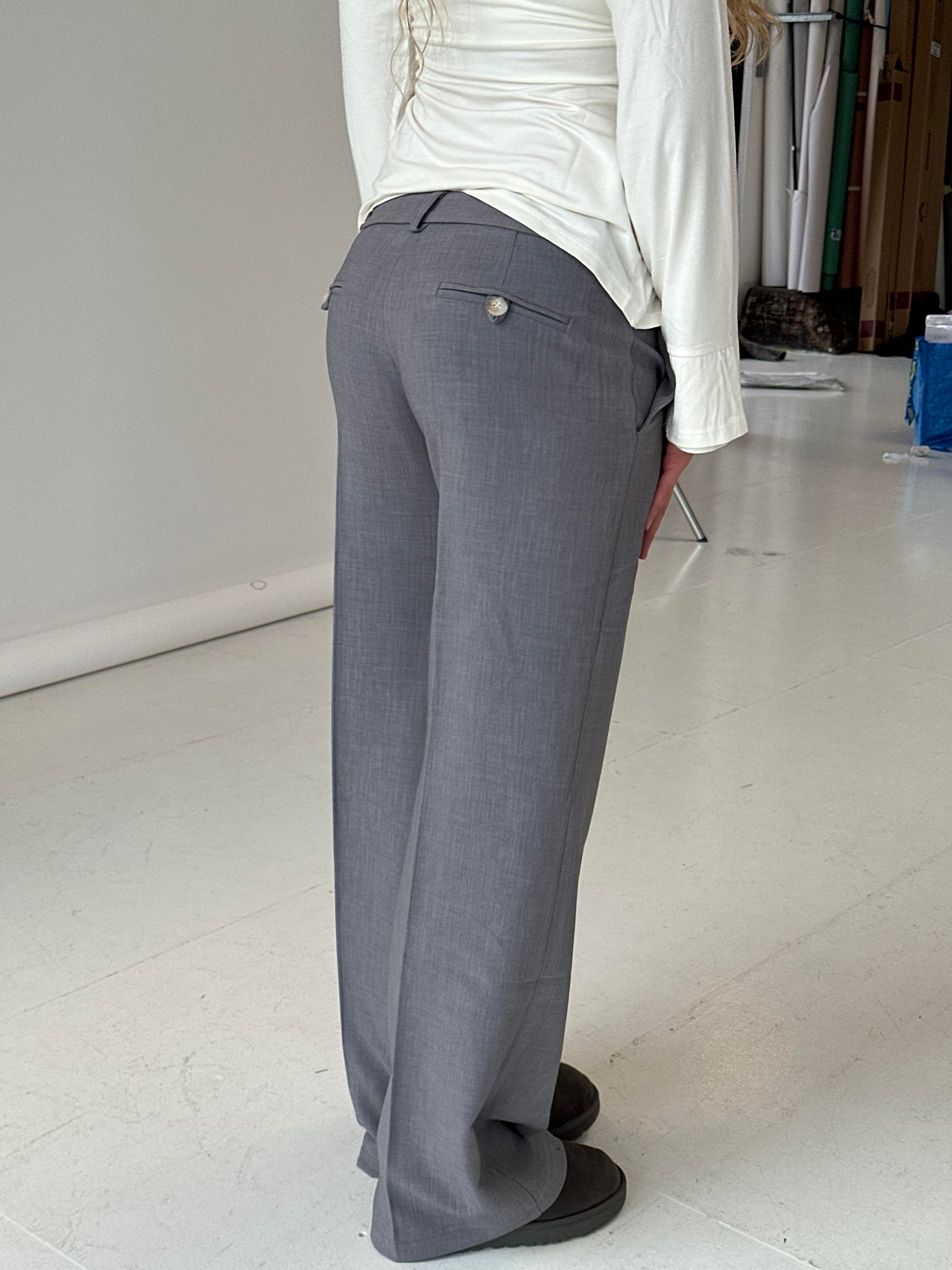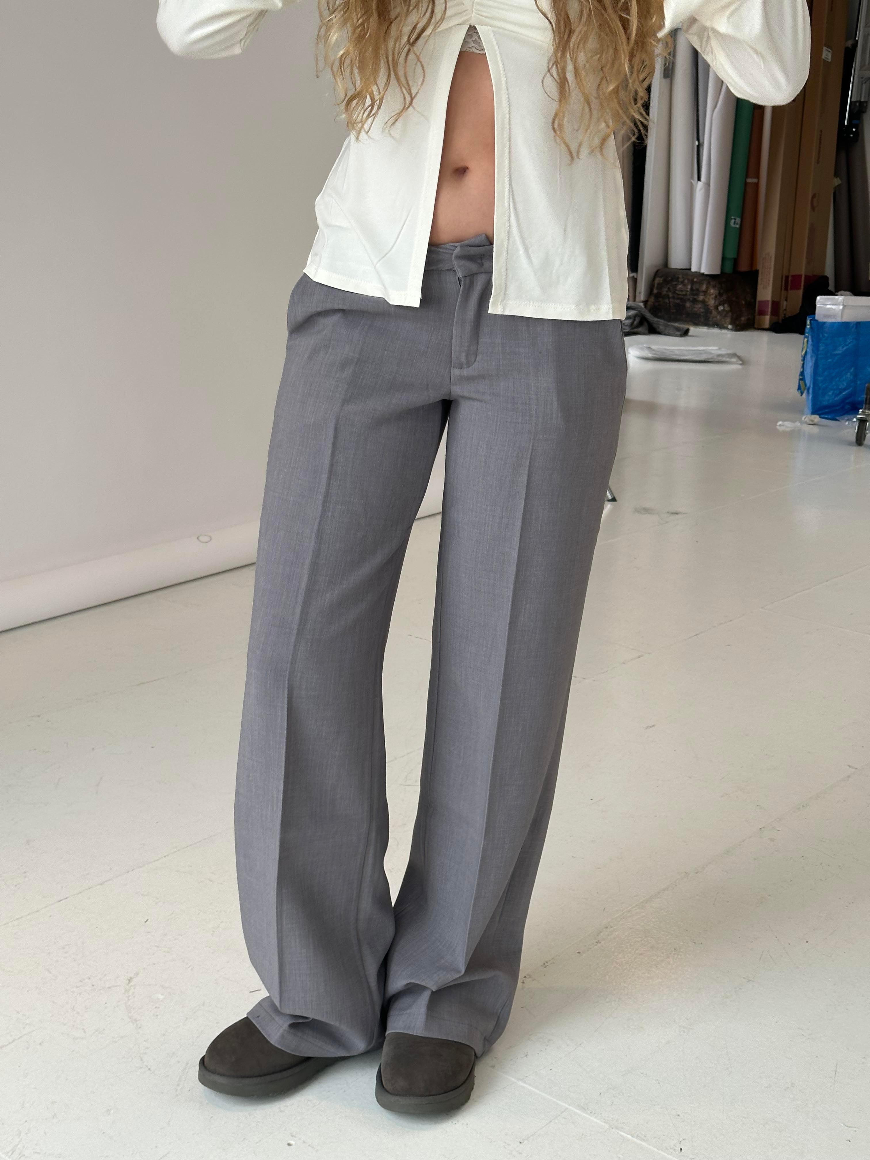 These suit pants are designed with a low waist. The pants have belt loops and are closed with a zipper and a hook-and-loop fastener. They are made with a loose and straight fit.
