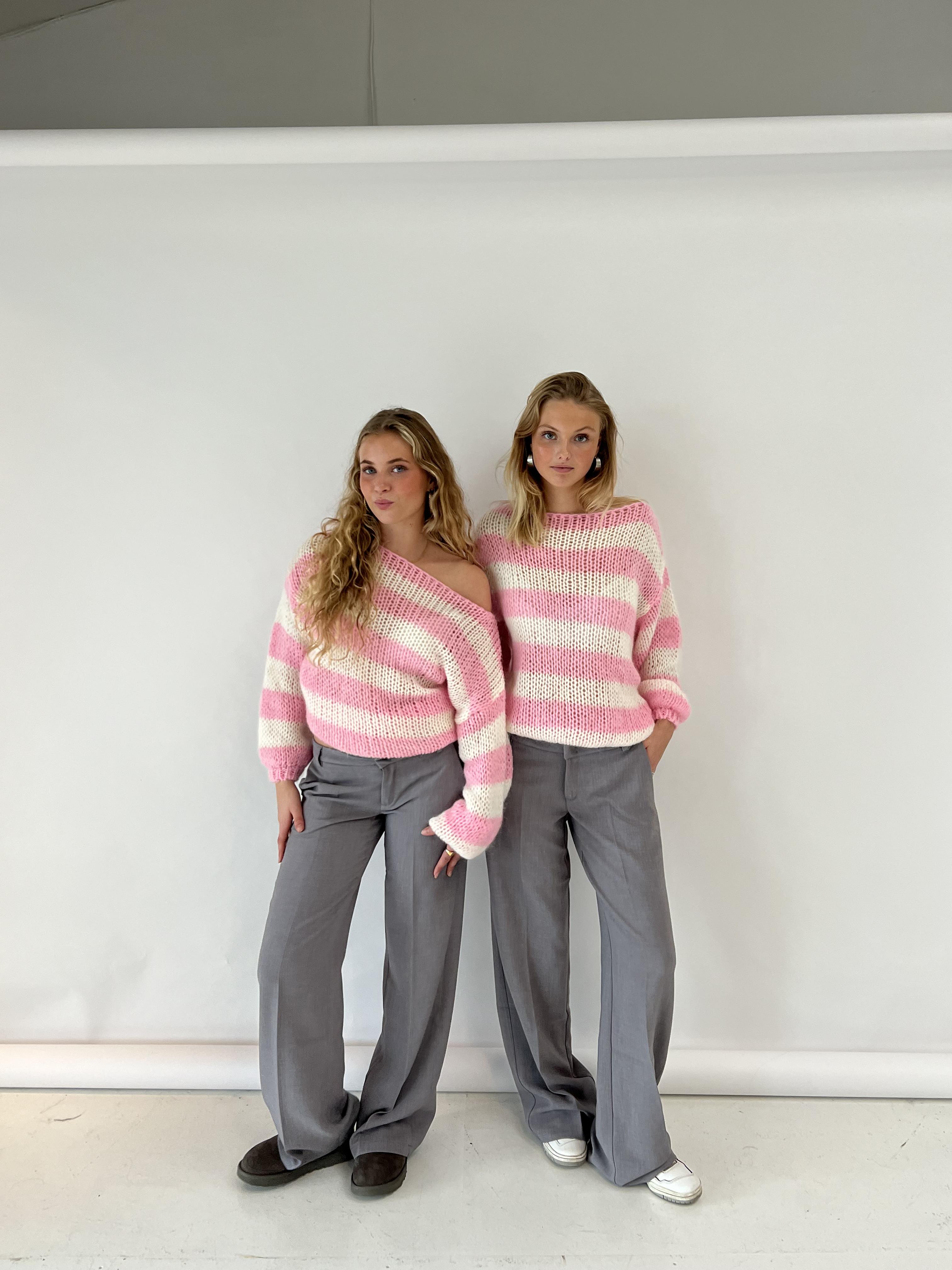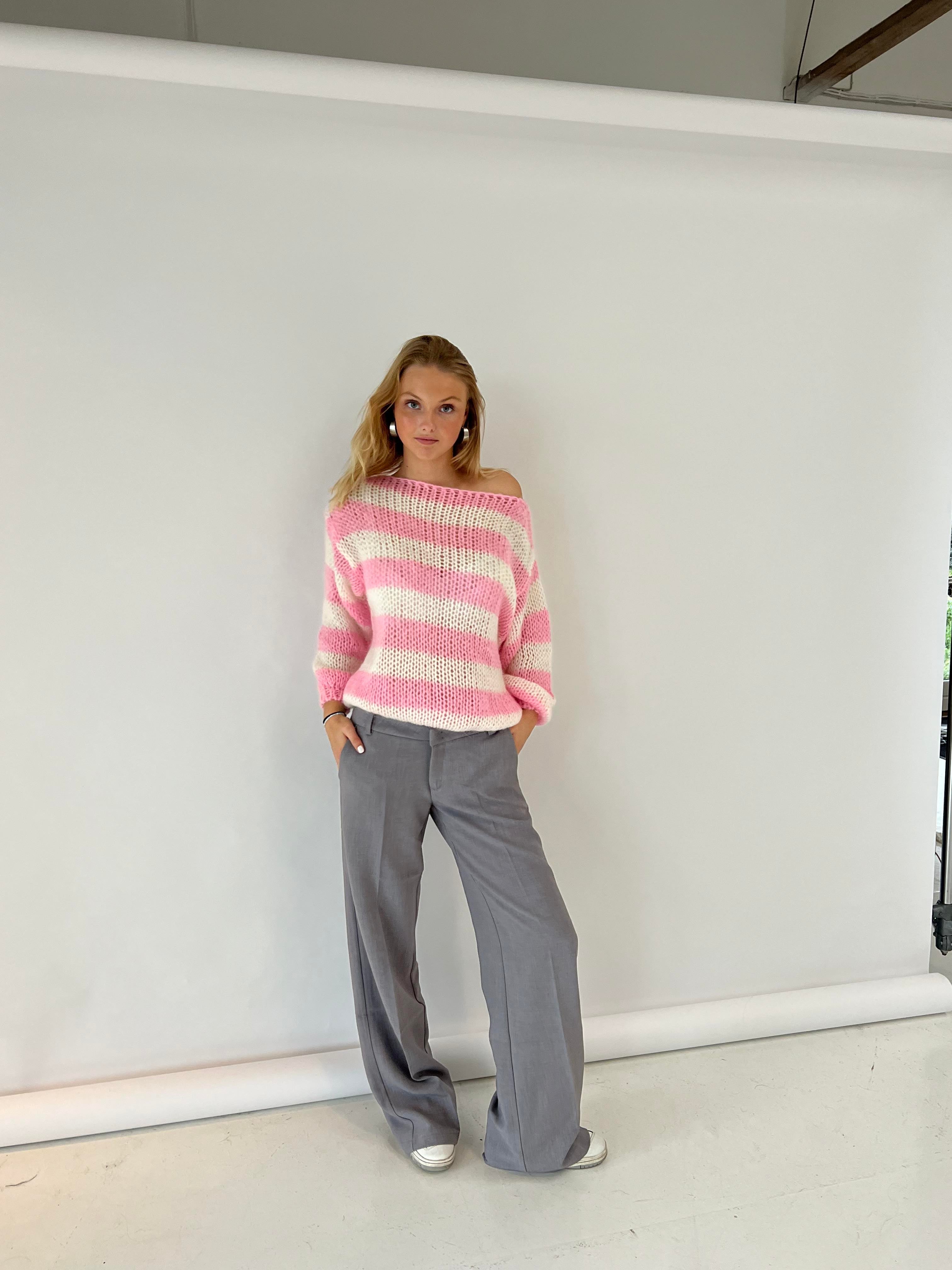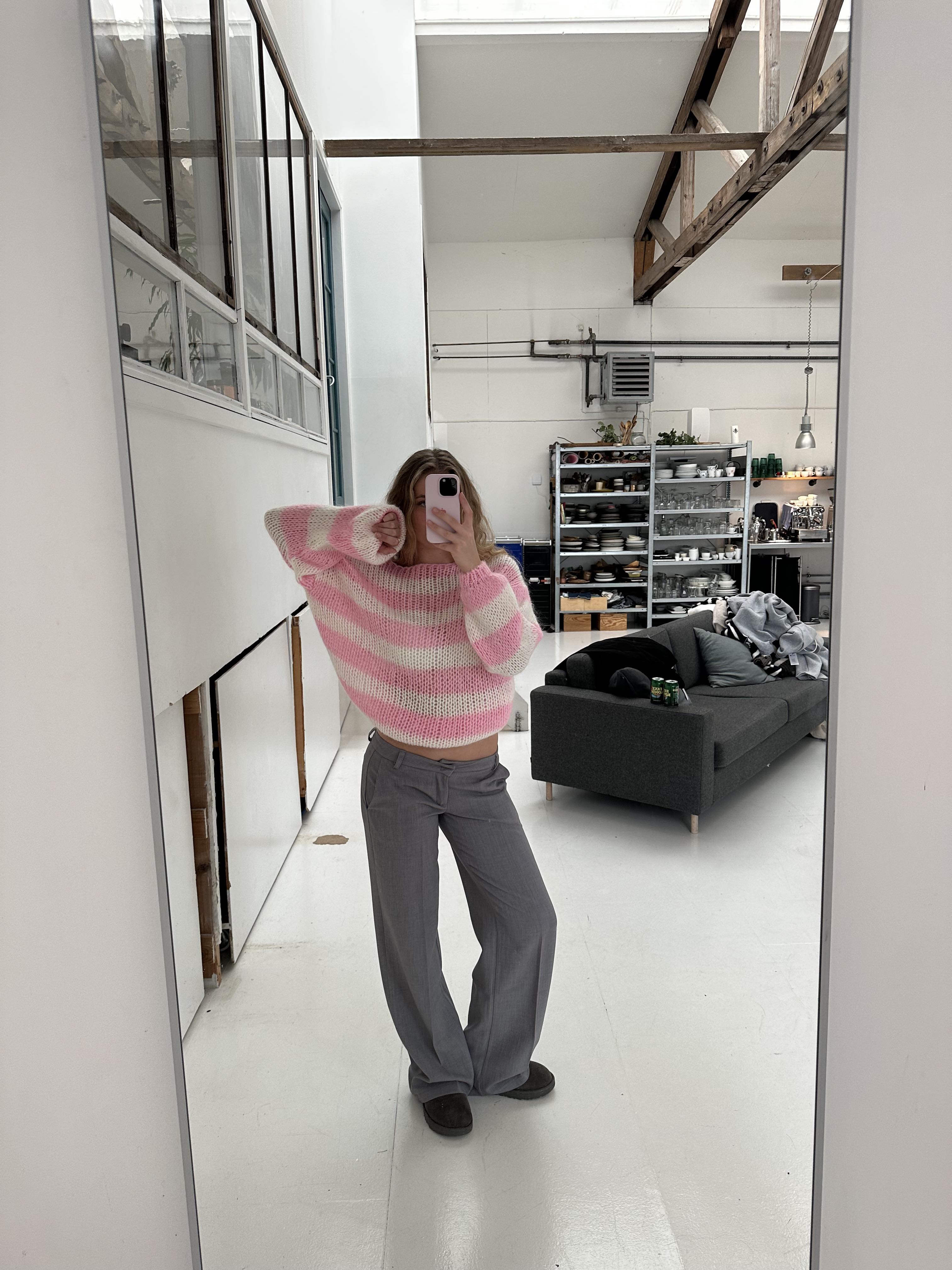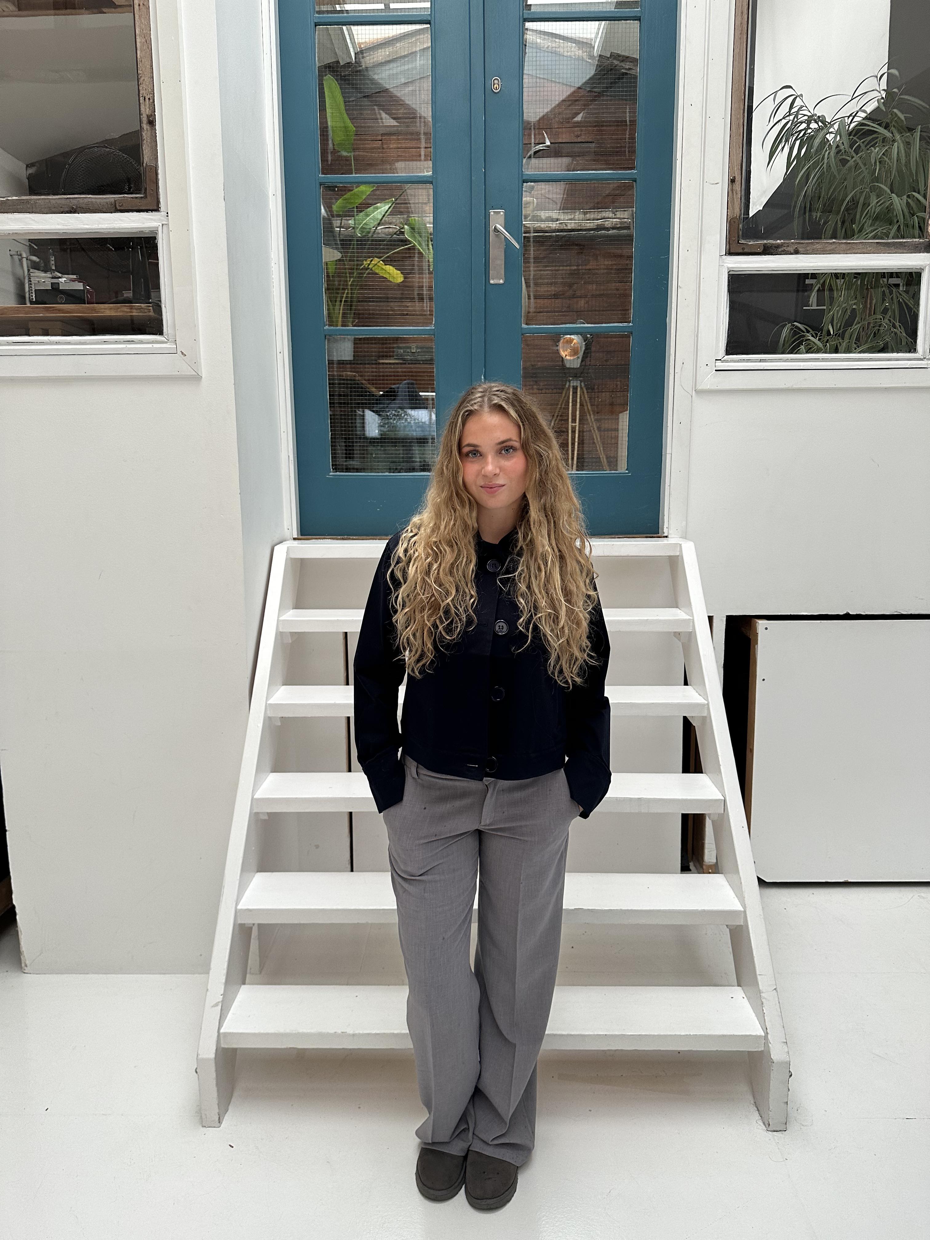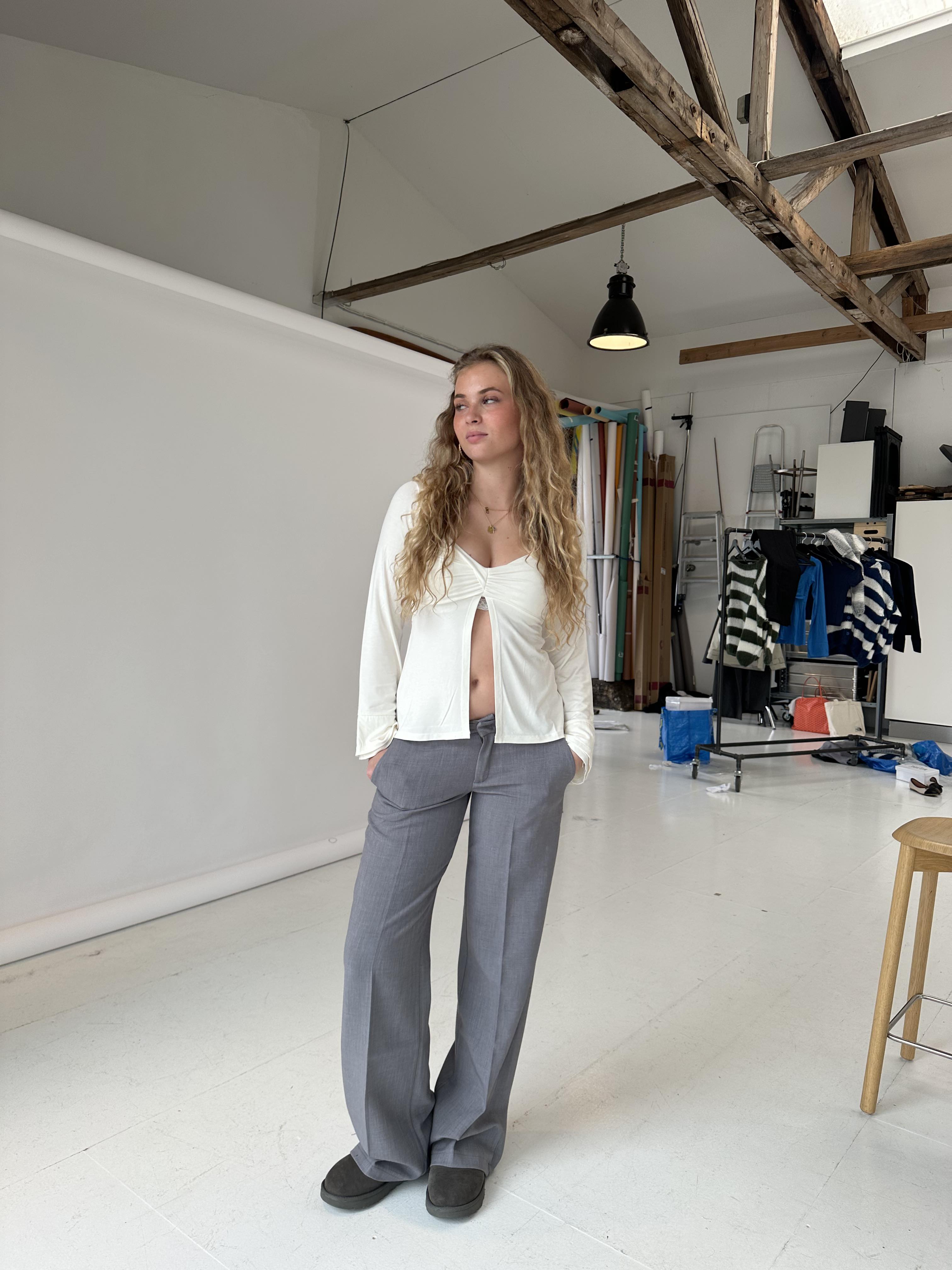 These suit pants are designed with a low waist. The pants have belt loops and are closed with a zipper and a hook-and-loop fastener. They are made with a loose and straight fit.