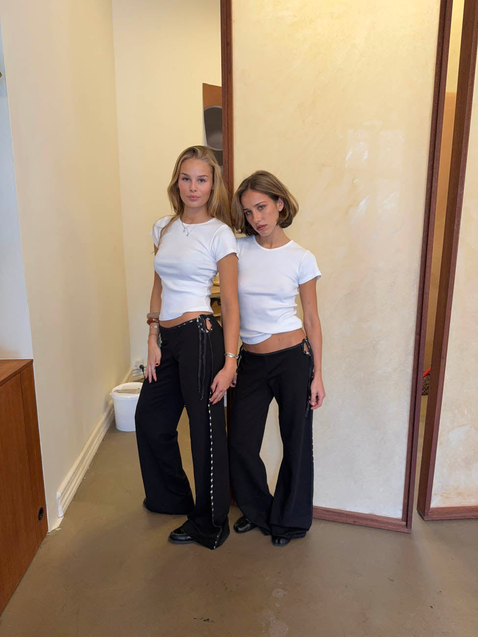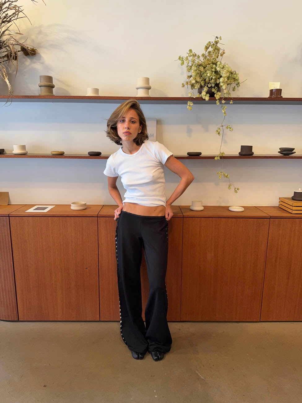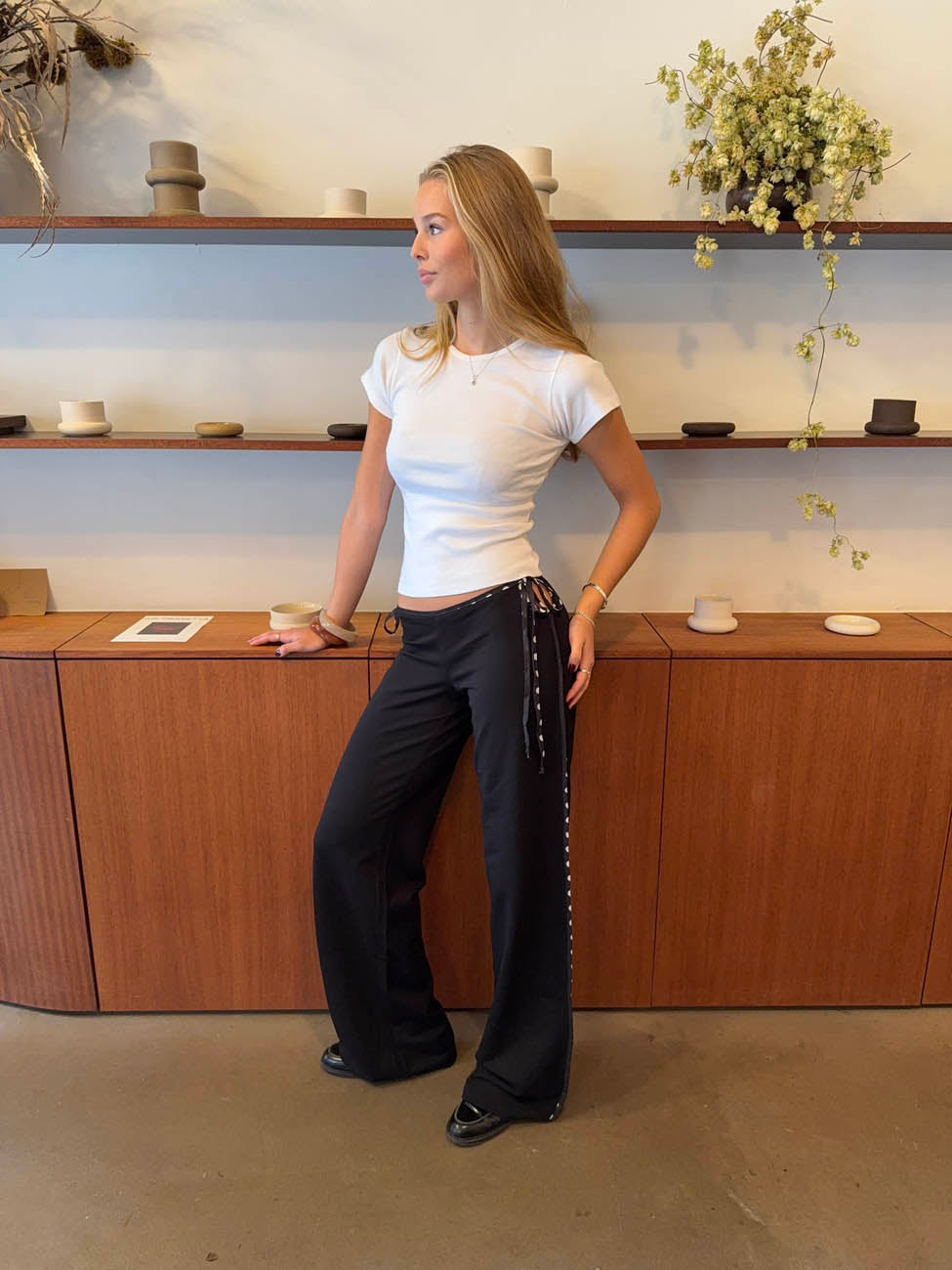 These black trousers are both stylish and comfortable – perfect for everyday wear or casual occasions. They feature a simple, minimalist design with straight legs and a drawstring waist, ensuring a good and flexible fit. The lightweight fabric gives the trousers a relaxed drape, making them easy to style with t-shirts, shirts, or knitwear.