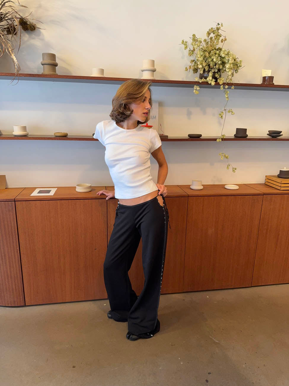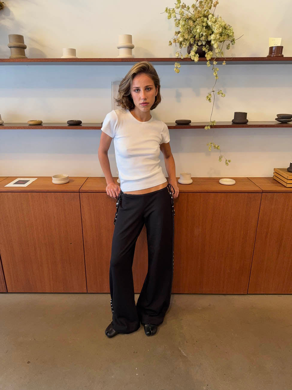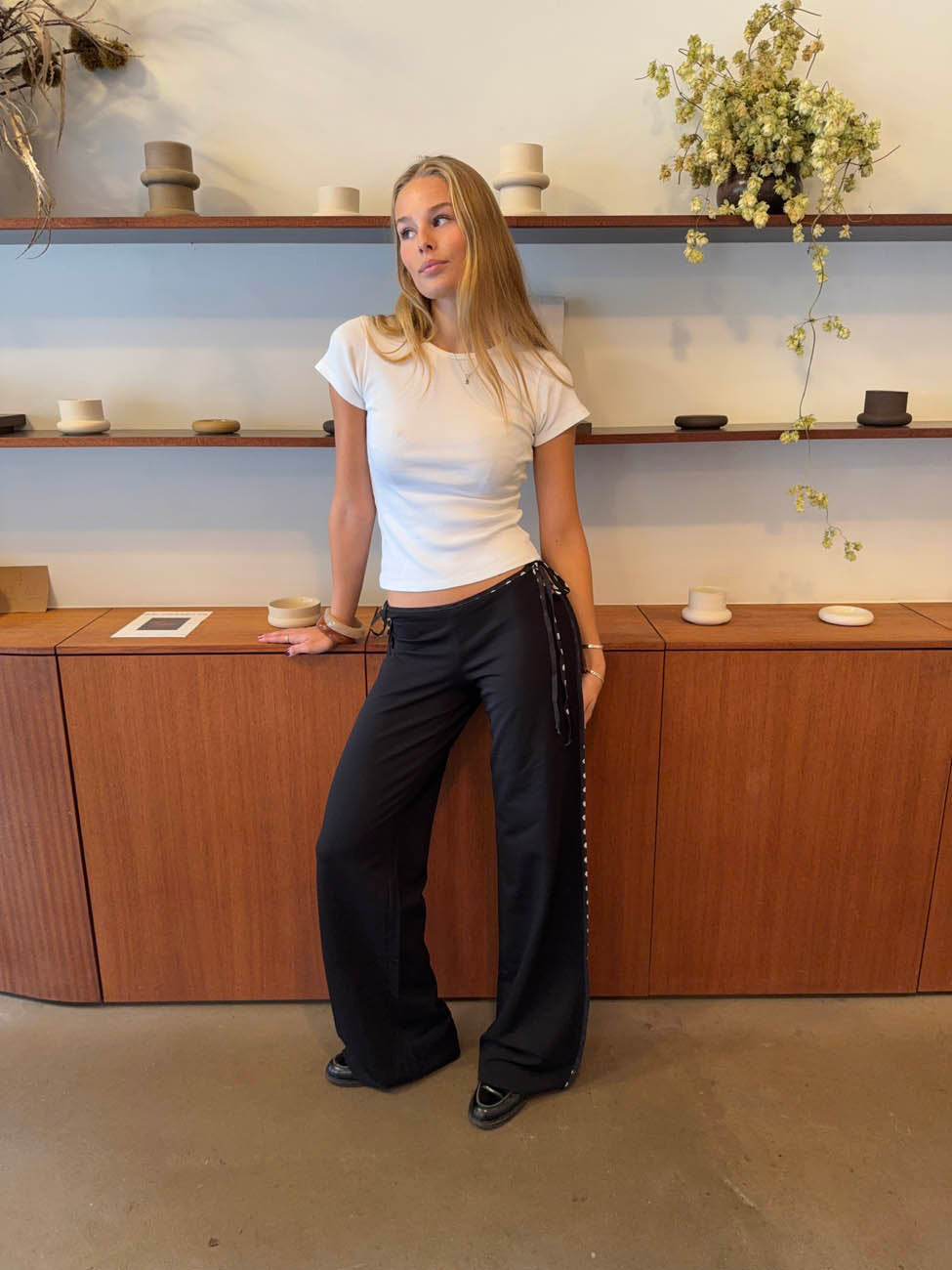 These black trousers are both stylish and comfortable – perfect for everyday wear or casual occasions. They feature a simple, minimalist design with straight legs and a drawstring waist, ensuring a good and flexible fit. The lightweight fabric gives the trousers a relaxed drape, making them easy to style with t-shirts, shirts, or knitwear.