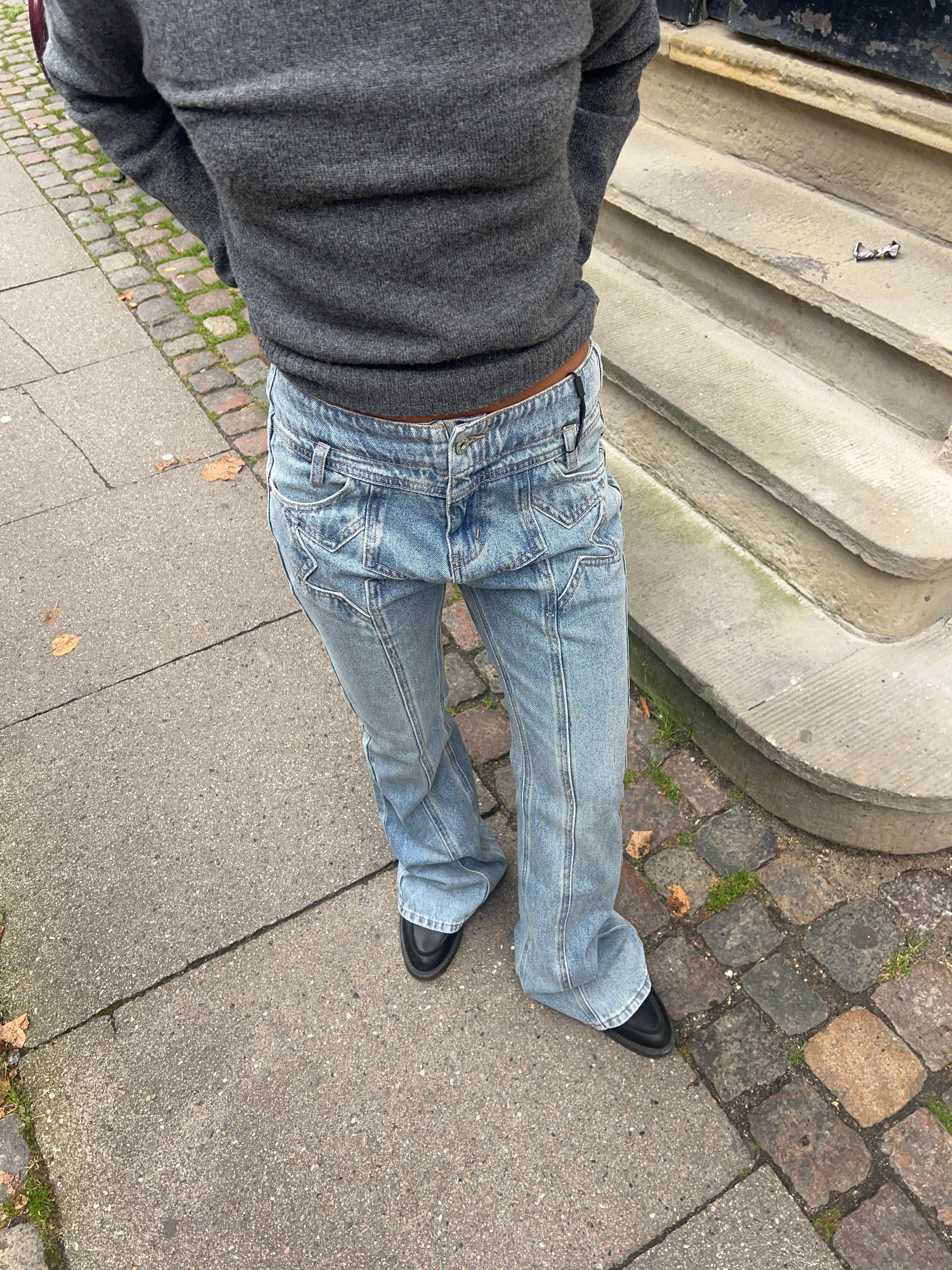 The coolest jeans with stars on the front. The trousers have a flare fit and a mid-waist. They close with a button and zipper.