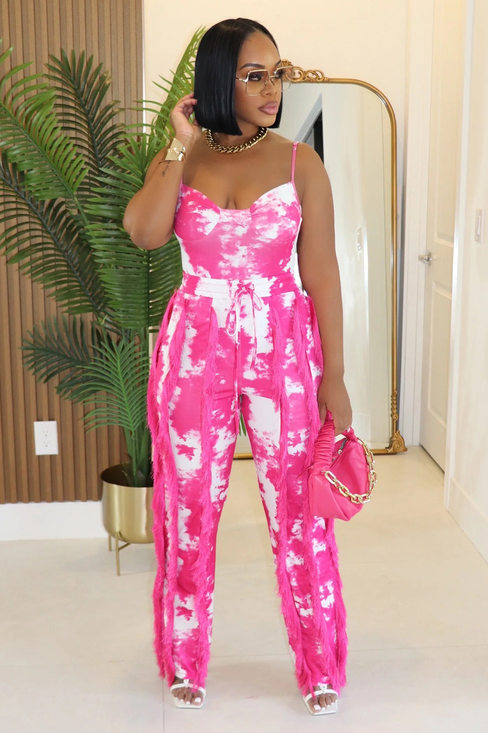 Tie Dye Cami Top Fringe High-Rise Pants Vacation 2pcs Set-Fuchsia