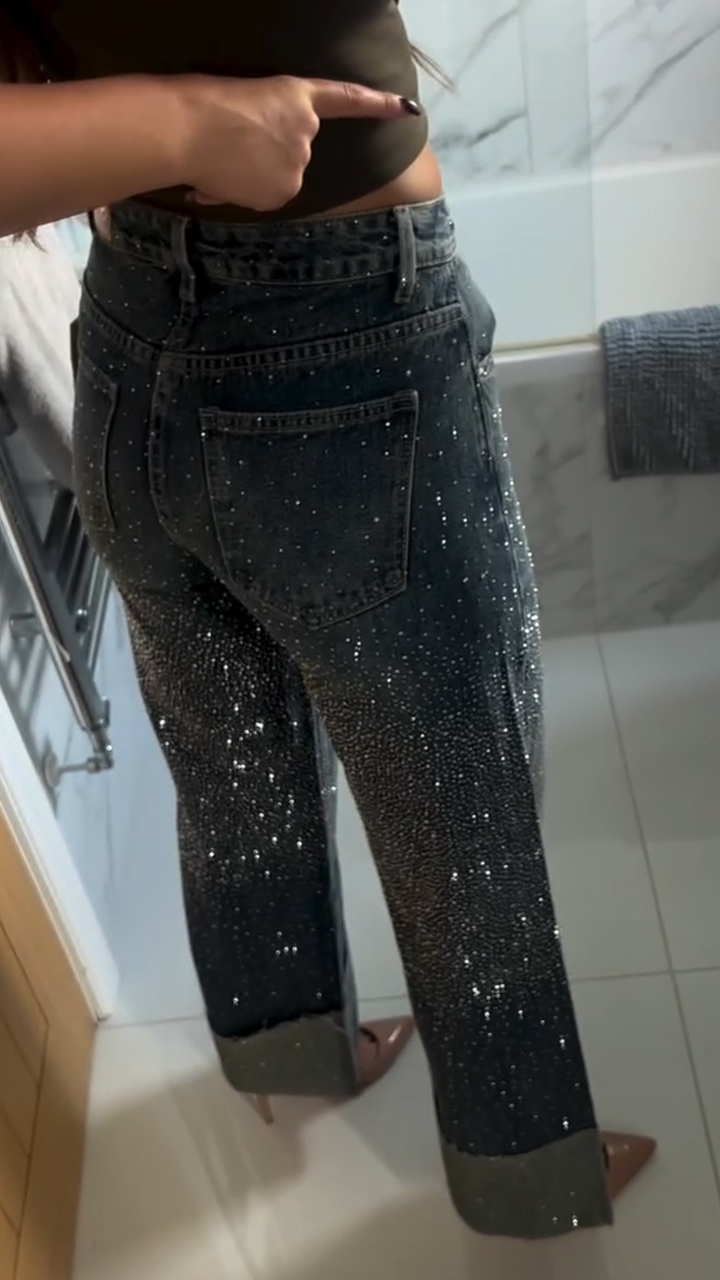 Women High Waisted Rhinestone Spliced Casual Jeans