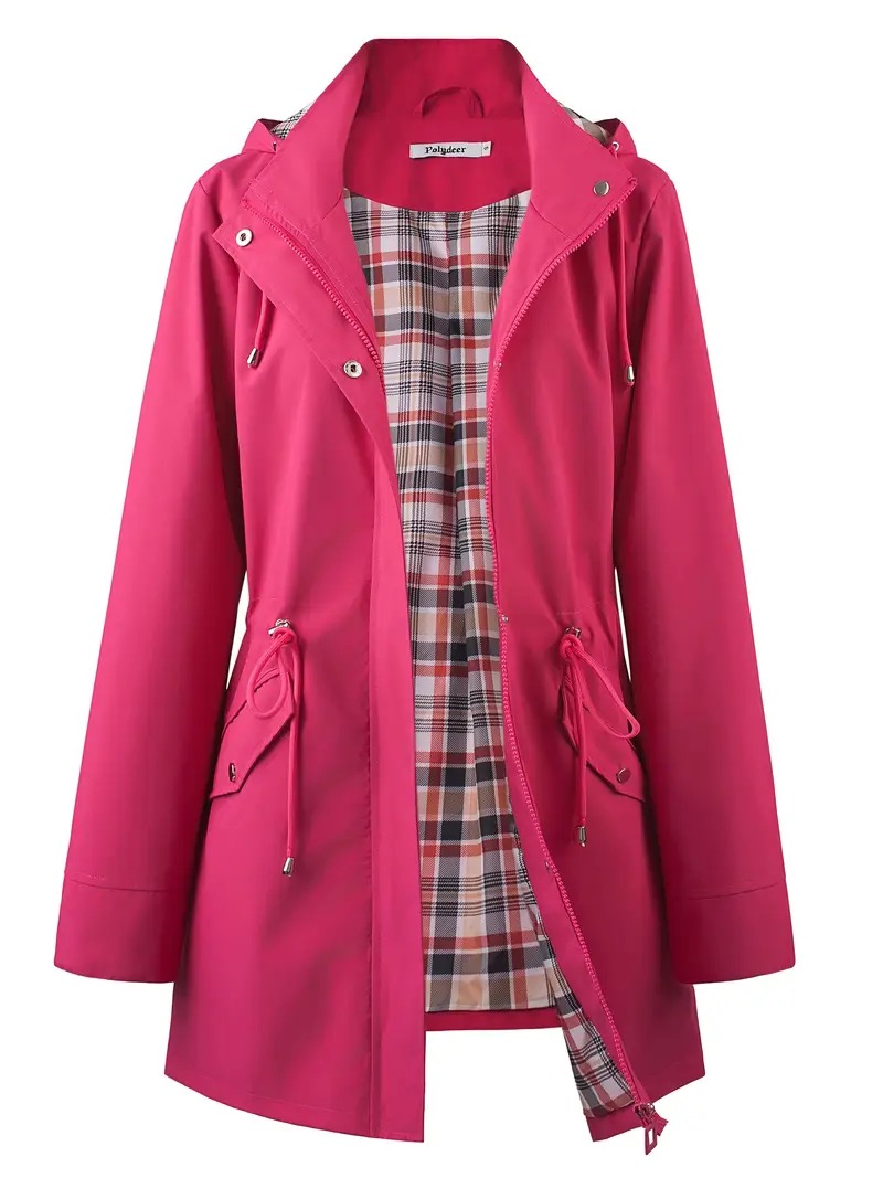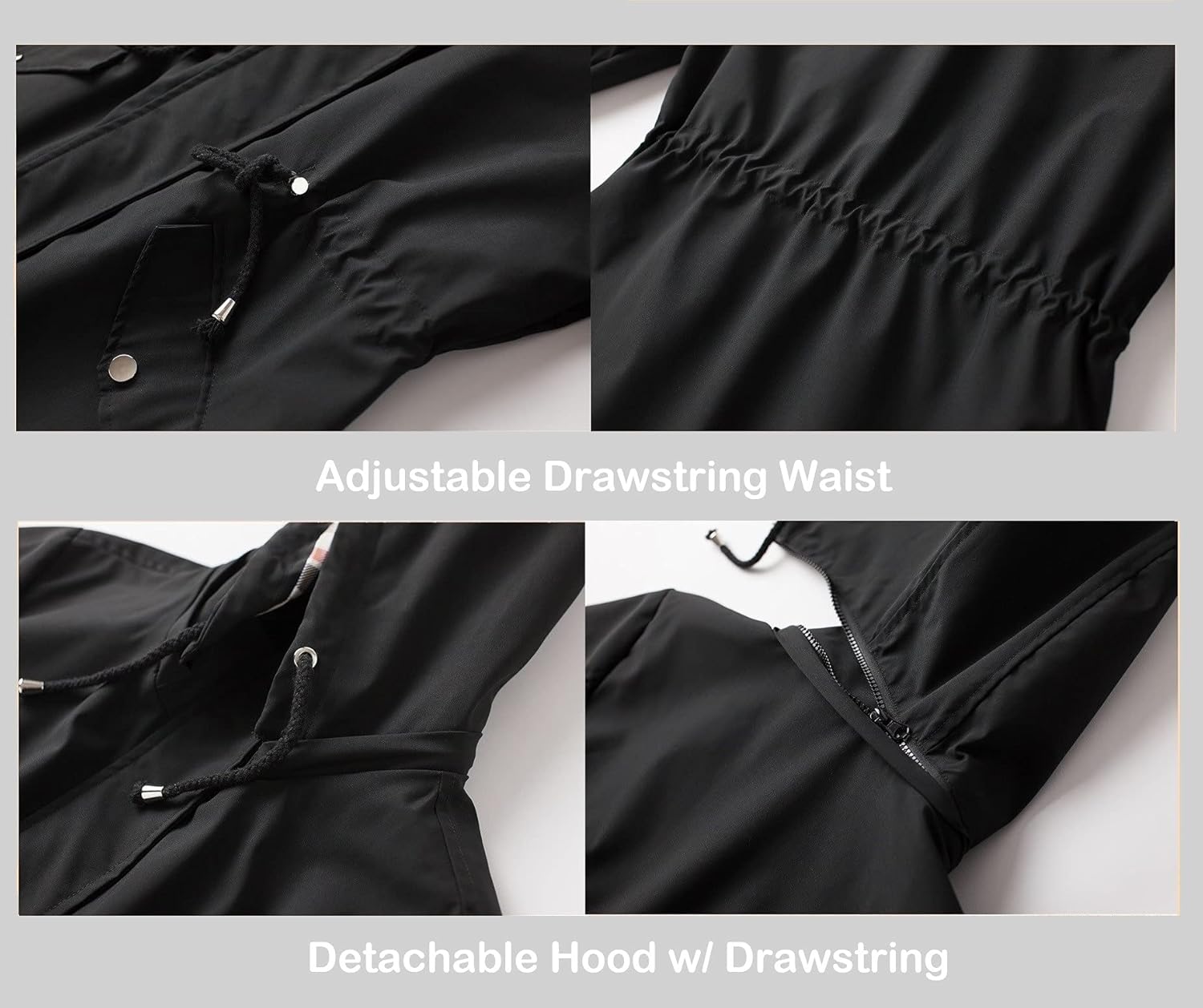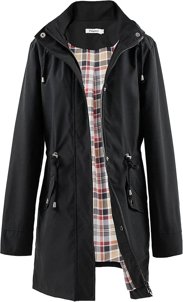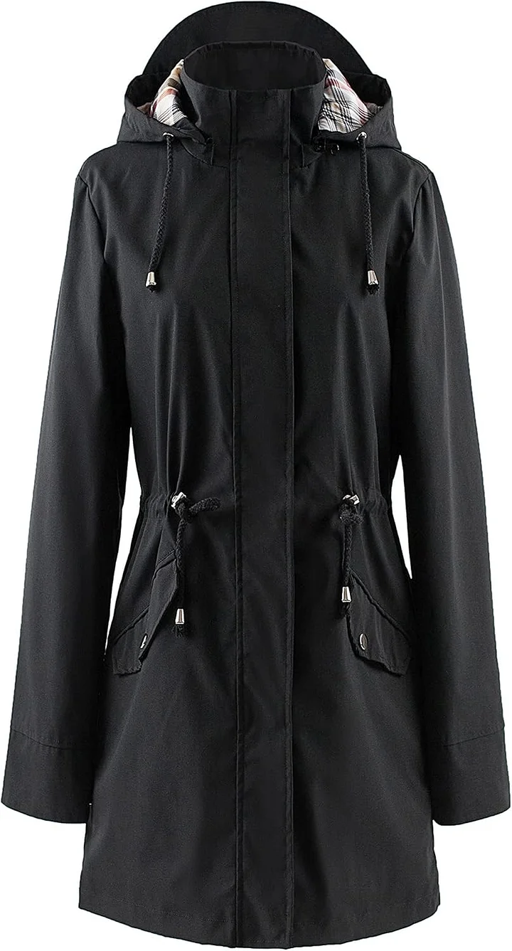 • 【FEATURES】The long-sleeve trench coat features: 1.Adjustable Drawstring Waist: allow you with a slim feminine look and comfortable range of motion;2.Detachable Hood with drawstring and an extra visor: give you more protection when in the heavy rain and wind;3.Pockets: 2 Front big pockets and 1 inner pocket: keep your belongings well;4.Stylish checked striped lining and roll up cuff design: make you looks cute and charming.