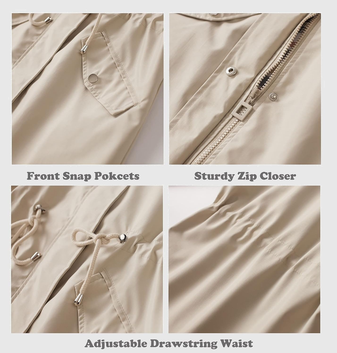 womens beige hooded zip up trench coat with drawstring waist multiple pockets casual long sleeve jacket for fall winter machine washable Product details 24