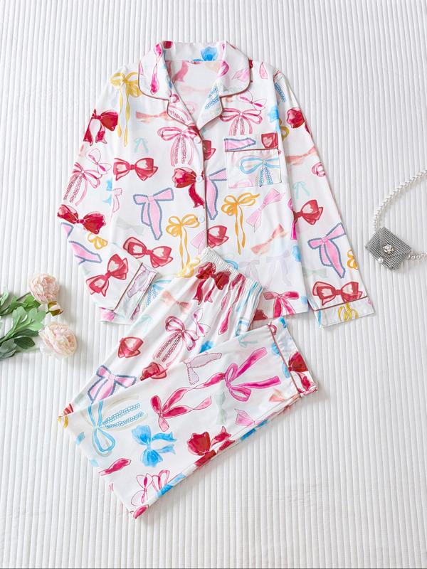 Two-piece Set Women's Christmas Print Button Front Pocket Shirt & Elastic Waist Pants Pyjama, Casual Comfy Long Sleeve Collared Top & Trousers Pyjama Set, Women's Sleepwear for Spring & Fall