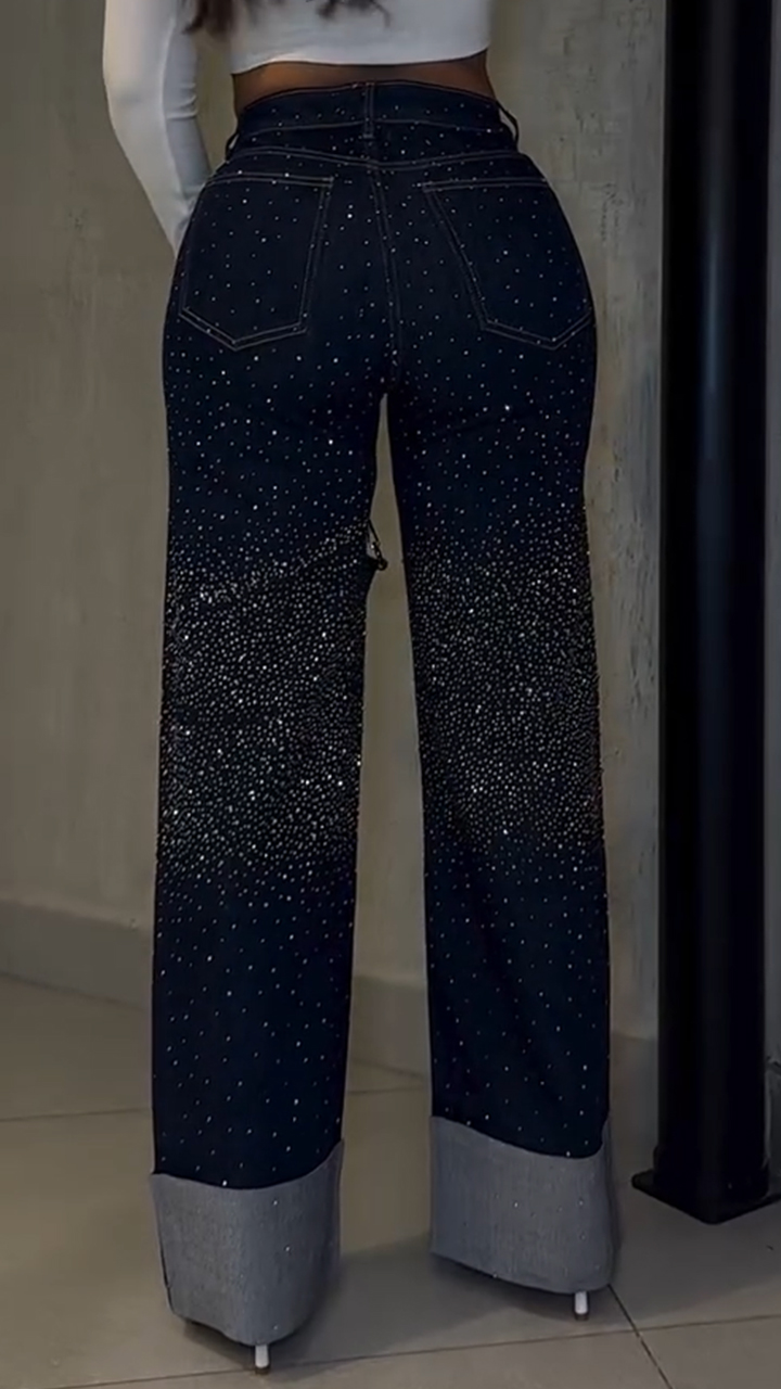 Women's Casual Wide-leg Jeans with Rhinestone Cuffs