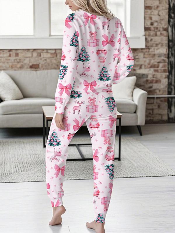 Women's Christmas Print Casual Set, Long Sleeve V Neck Top & Belted Pants, Ladies Homewear & Pajamas, Spring & Fall Fashion
