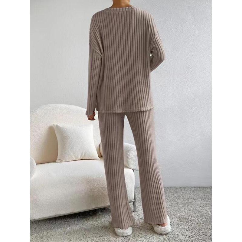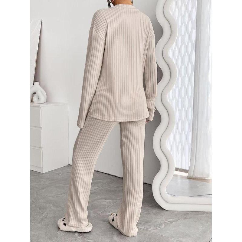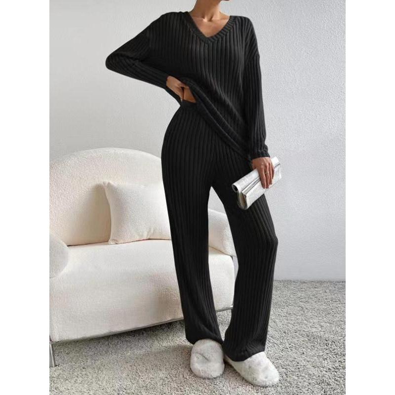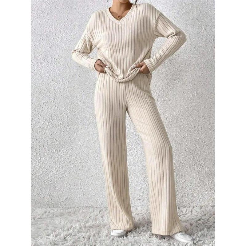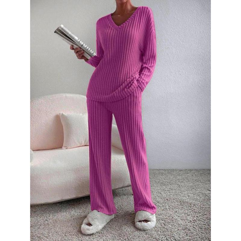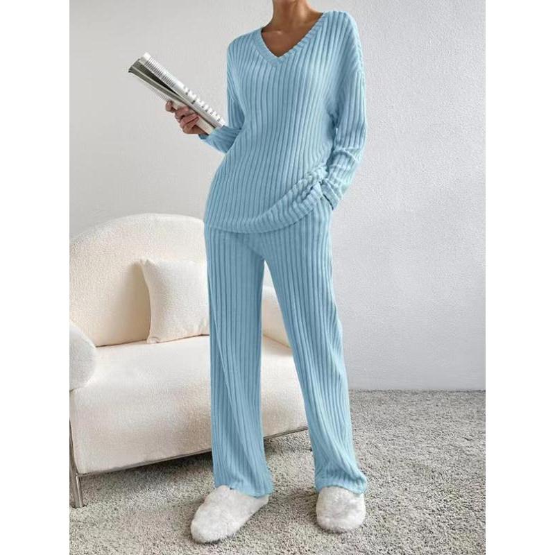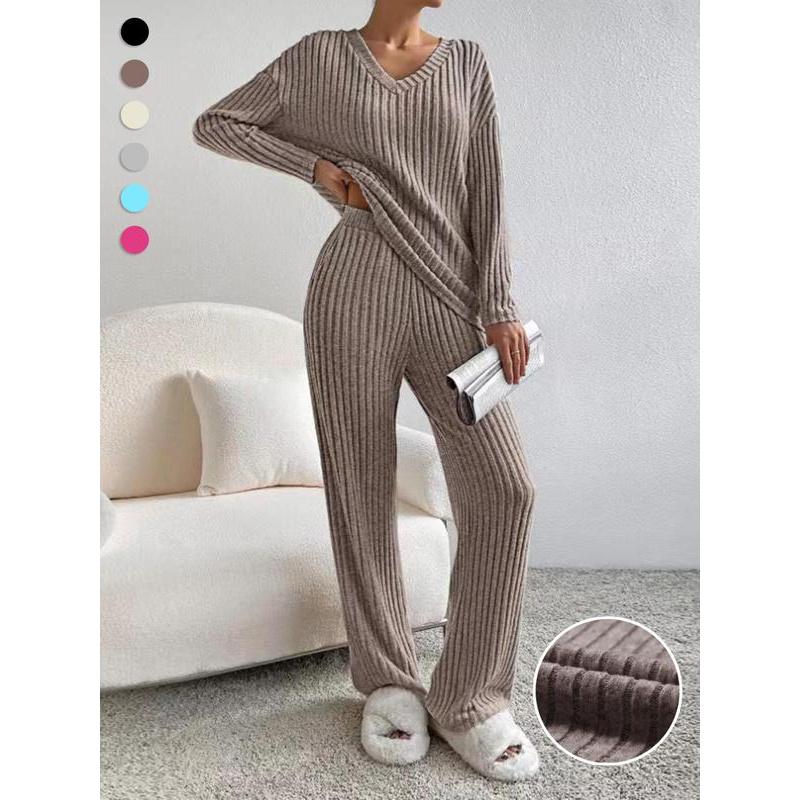 • Women's Solid Drop Shoulder Pocket Lounge Set, Casual Long Sleeve V Neck Top & Straight Leg Pants Two-piece Set, Women's Sleepwear