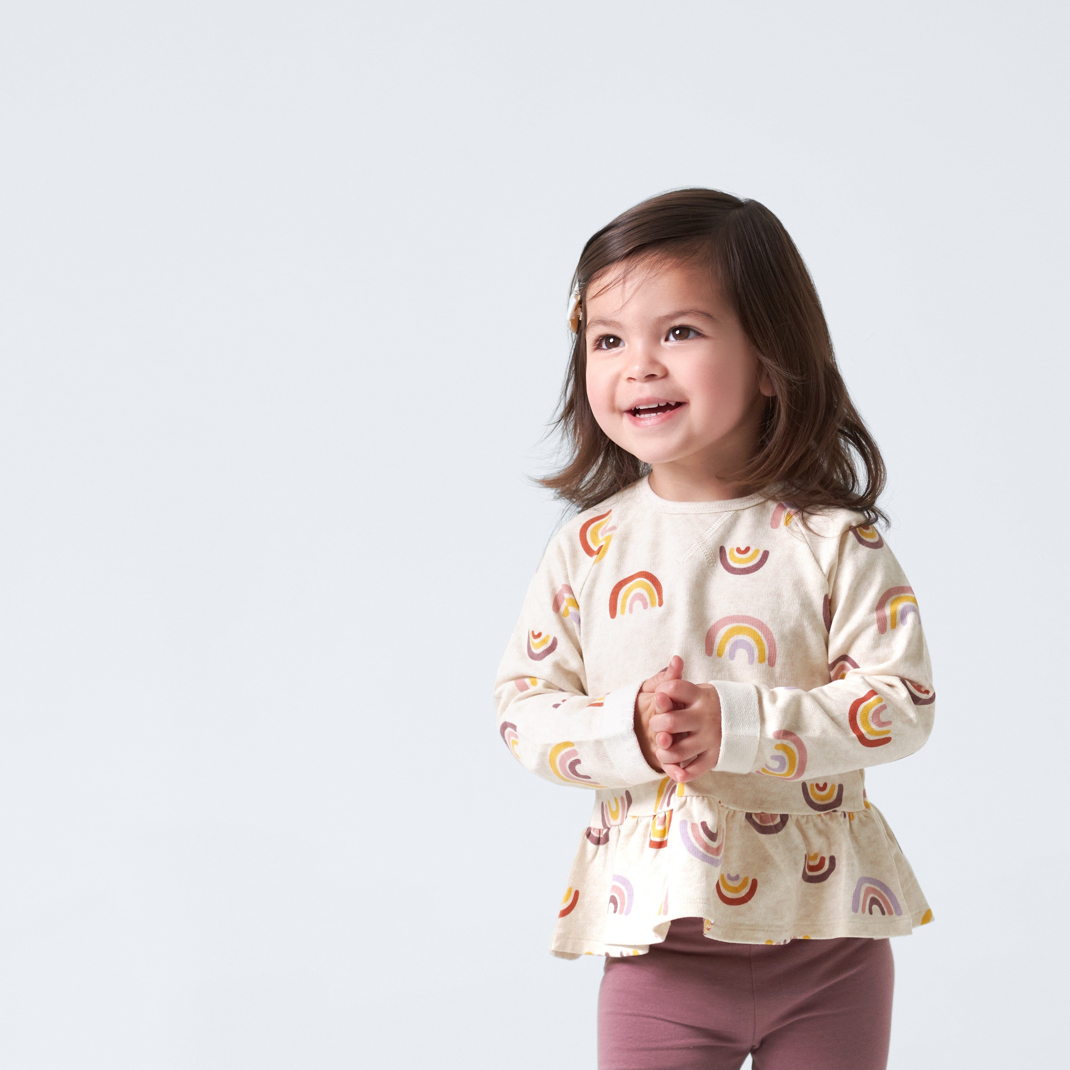 Our 2-piece peplum waist long sleeve top and legging set is perfect for those cool fall days! This multicolor rainbow set is designed for easy dressing and all-day comfort, perfect for infants and toddlers. We use STANDARD 100 by OEKO-TEX® certification on products tested in an independent laboratory against a list of more than 400 harmful substances, including PFAS.