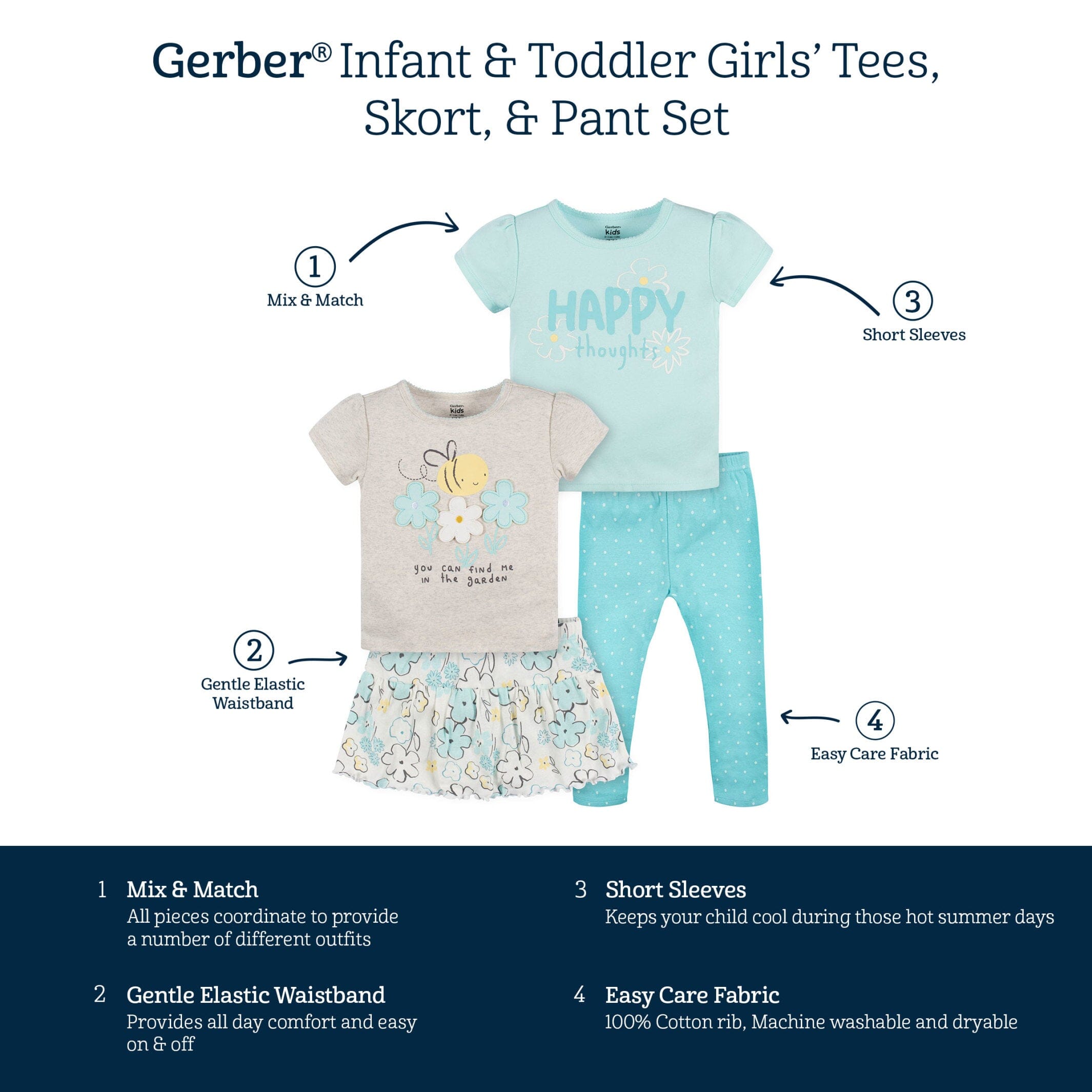 Our adorable bees & flowers tees, skort, & pants 4-piece sets are the perfect spring and summer outfits for babies and toddlers! Each one is made with soft cotton fabrics that your child will adore. We use STANDARD 100 by OEKO-TEX® certification on products tested in an independent laboratory against a list of more than 400 harmful substances, including PFAS.