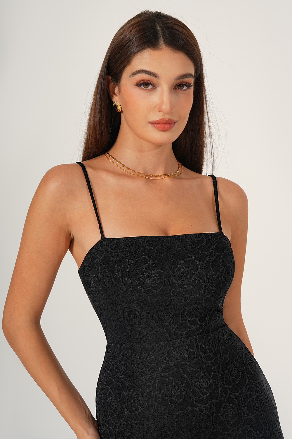 This black knit bodycon dress features a bold rose print, drawing inspiration from classic romance and timeless elegance. The delicate floral details blend seamlessly with the sleek silhouette, creating a captivating look that's both sensual and sophisticated.