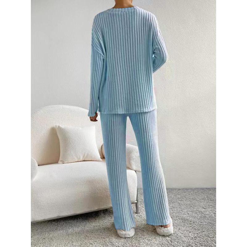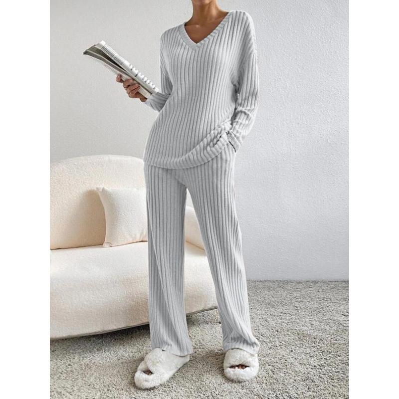 • Women's Solid Drop Shoulder Pocket Lounge Set, Casual Long Sleeve V Neck Top & Straight Leg Pants Two-piece Set, Women's Sleepwear