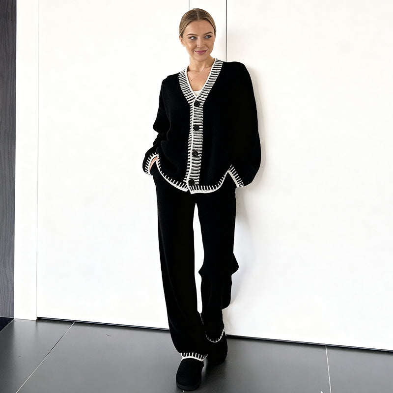 ELEGANT TWO-PIECE DESIGN: This knit cardigan with detailed trimming pairs effortlessly with wide-leg pants, delivering a coordinated yet relaxed outfit. The refined cut offers both functionality and style, making it suitable for casual outings or daily wear.