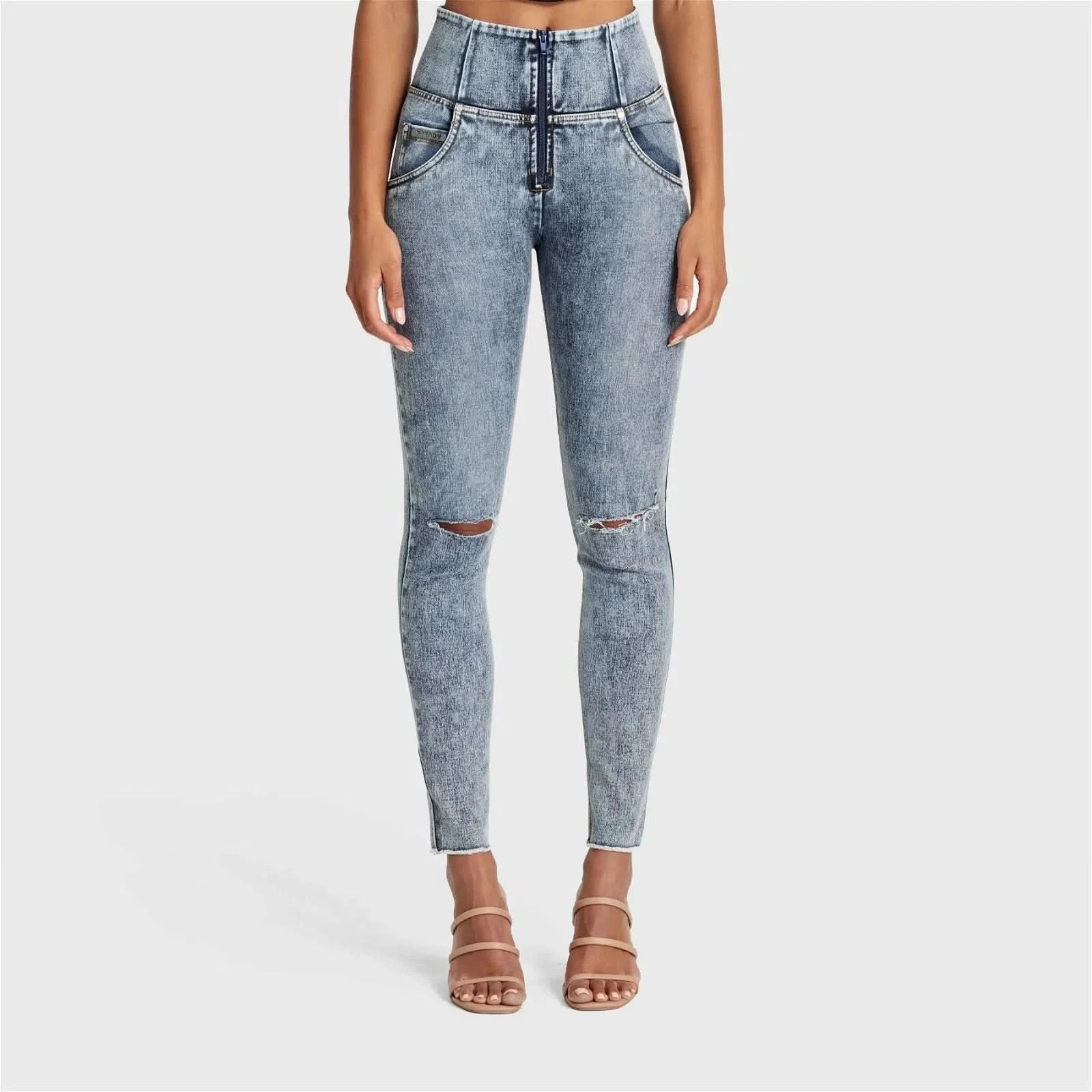 WRUP SNUG Ripped Jeans - High Waisted - Full Length - Blue Stonewash + Yellow Stitching