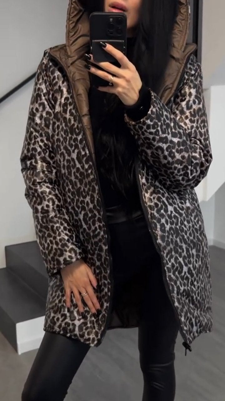 Women's Hooded Leopard + Solid Color Double-Sided Cotton Coat