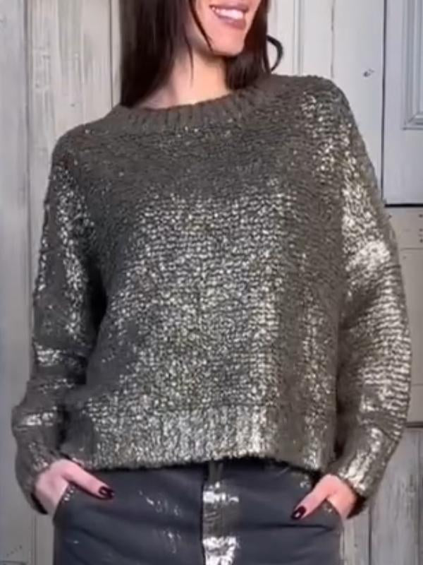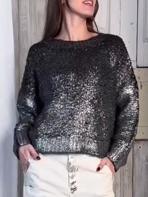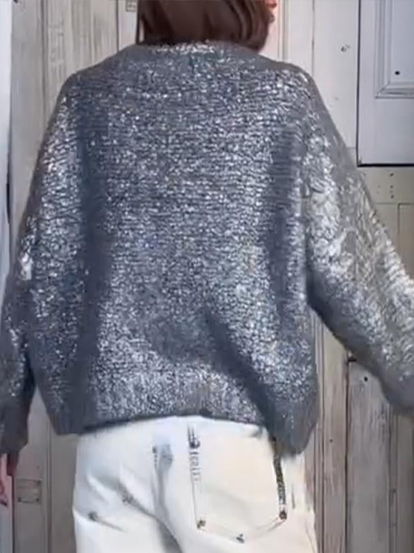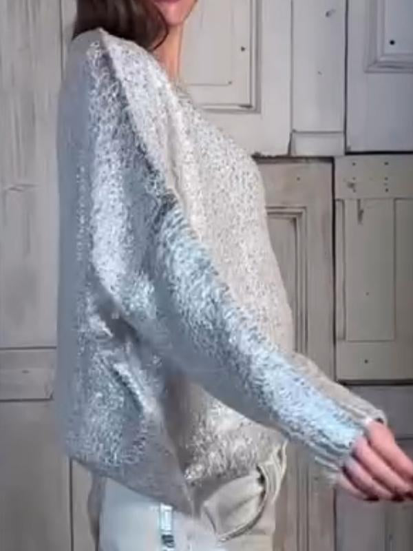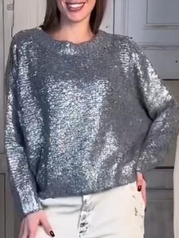 Women's Round Neck Long Sleeve Silver Hot Casual Sweater