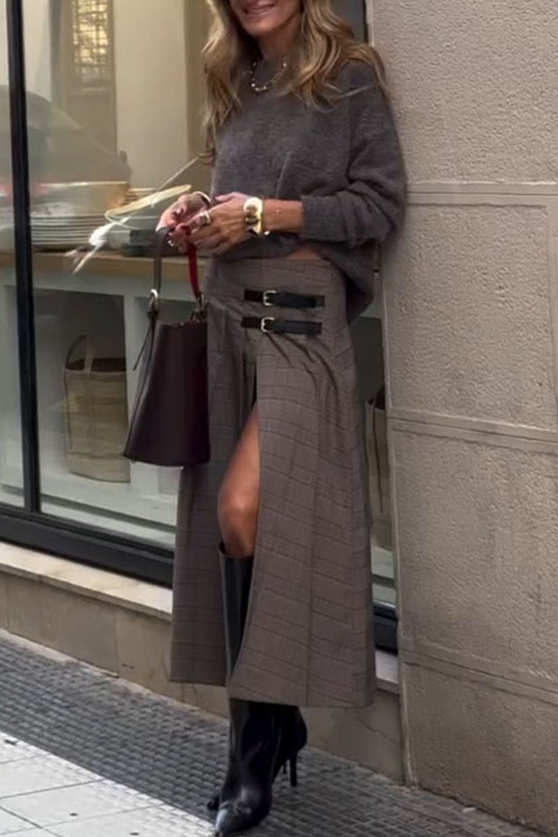 Women's Round Neck Long Sleeve Sweater and Slit Skirt Two-piece Set