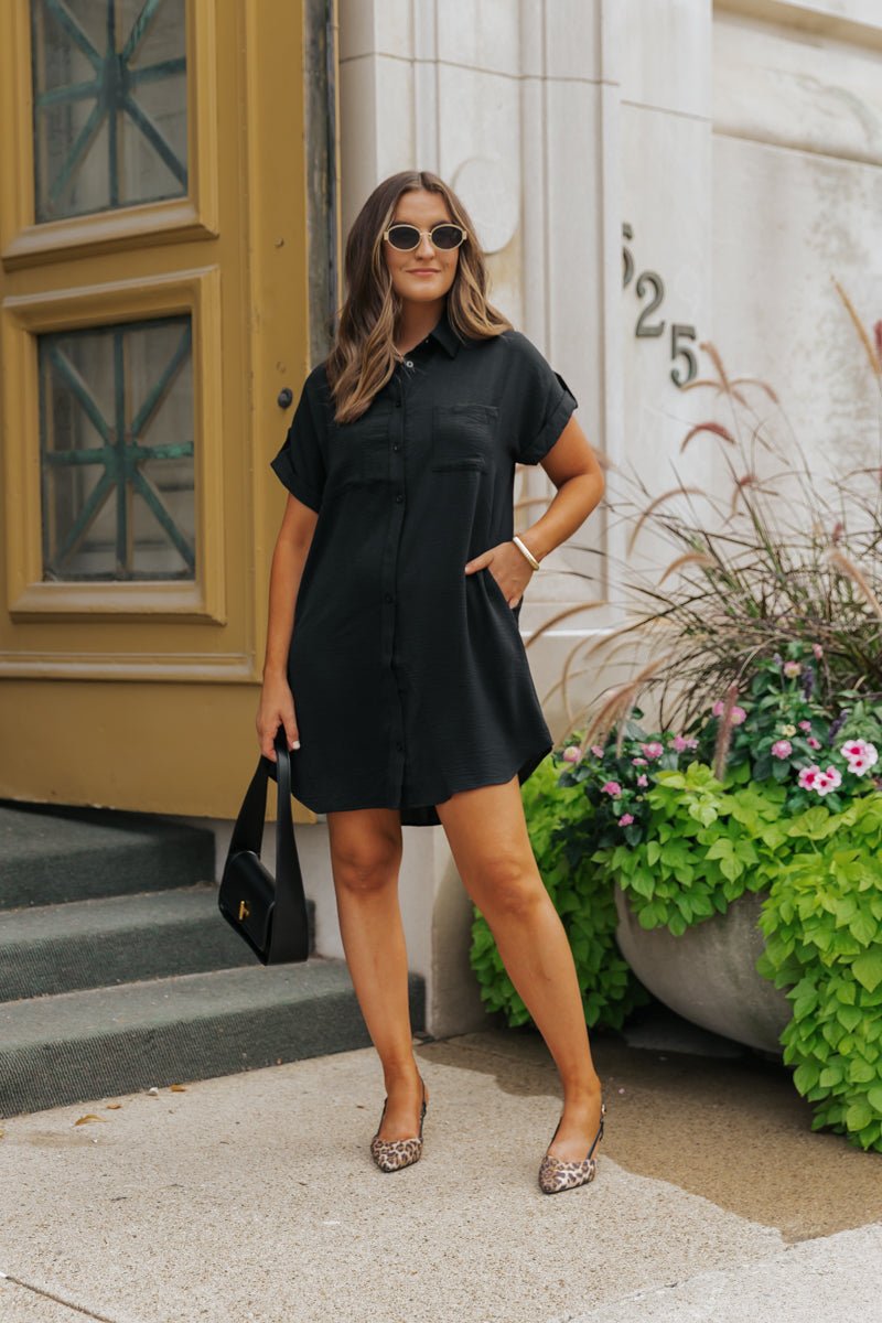 Expertly crafted, this black shirt dress offers a timeless and polished look for the fall!