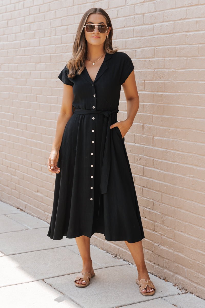 This Black Button Down Midi Dress is a sophisticated and versatile piece perfect for a variety of occasions!