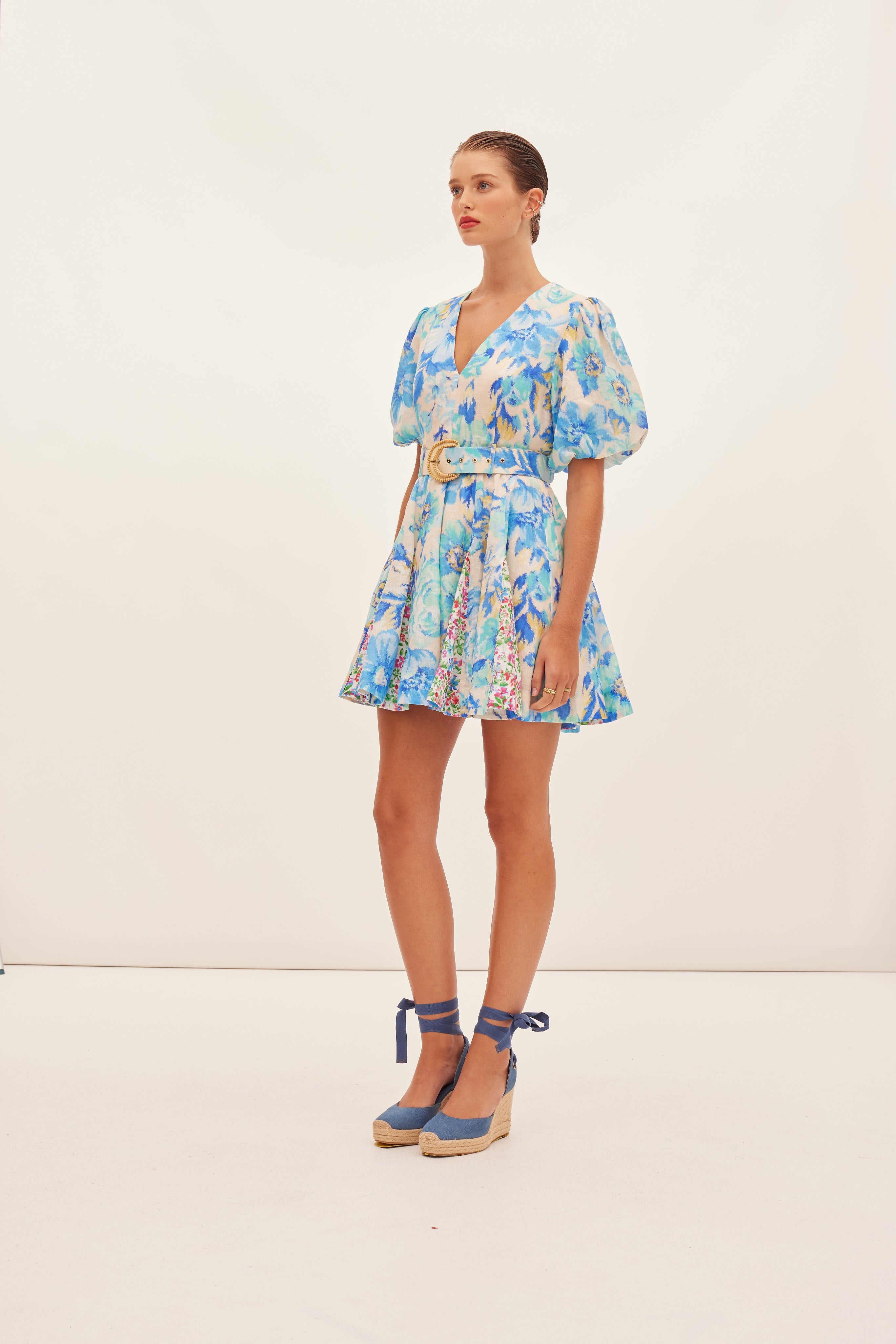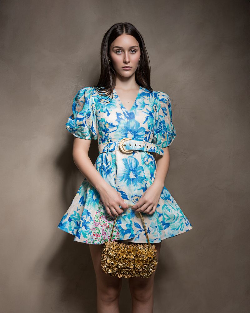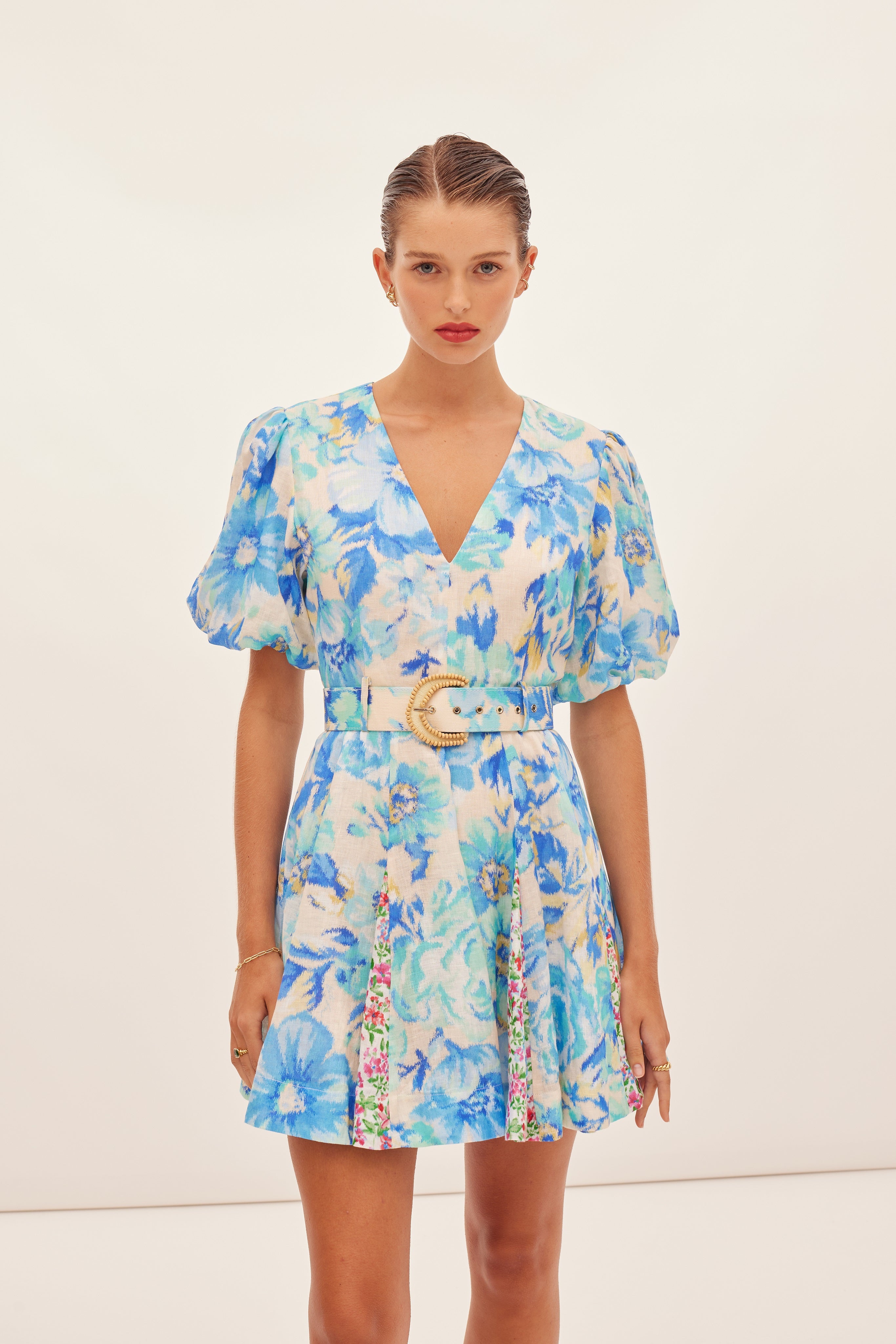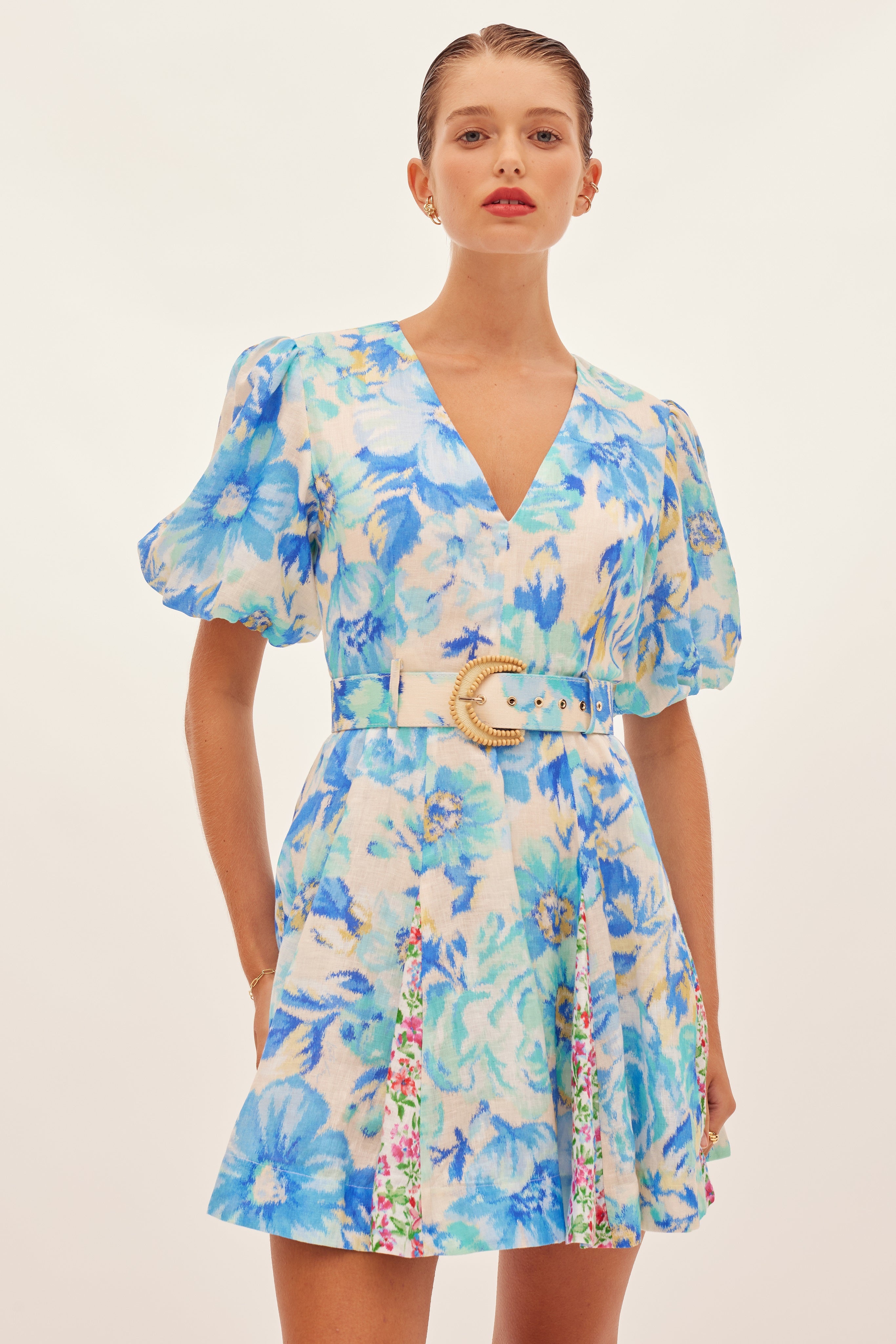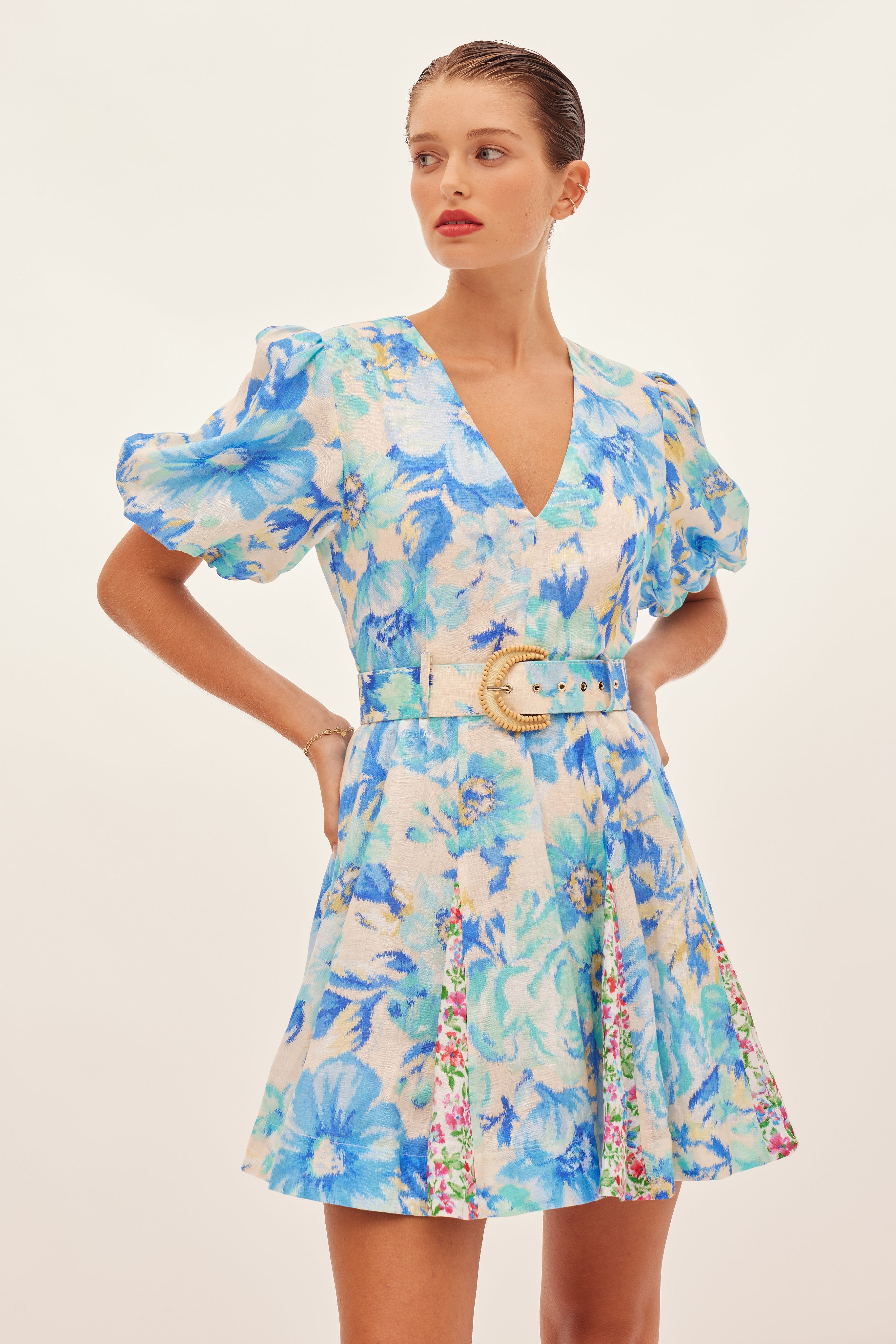 The Hispanica Plunge Dress in Calla, a Kate Ford exclusive hand-drawn print from our Spring Summer 2024 Collection, Boteh. A linen dress featuring a spliced print design, fitted plunging neckline & flattering flared godet skirt, self-covered belt with a d-ring raffia beaded edge buckle, short puff sleeves and shoulders with elastic cuff.