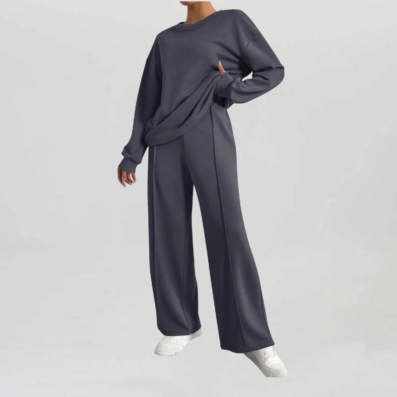 • Women's Casual Solid Color Loose Long Sleeve Top & Exposed Stitches Trousers Co-ord, Cozy Round Neck Top & Wide Leg Trousers Two Piece Outfits