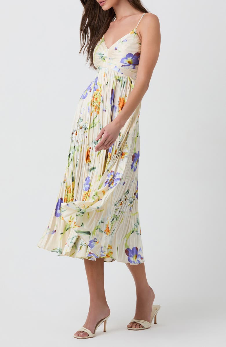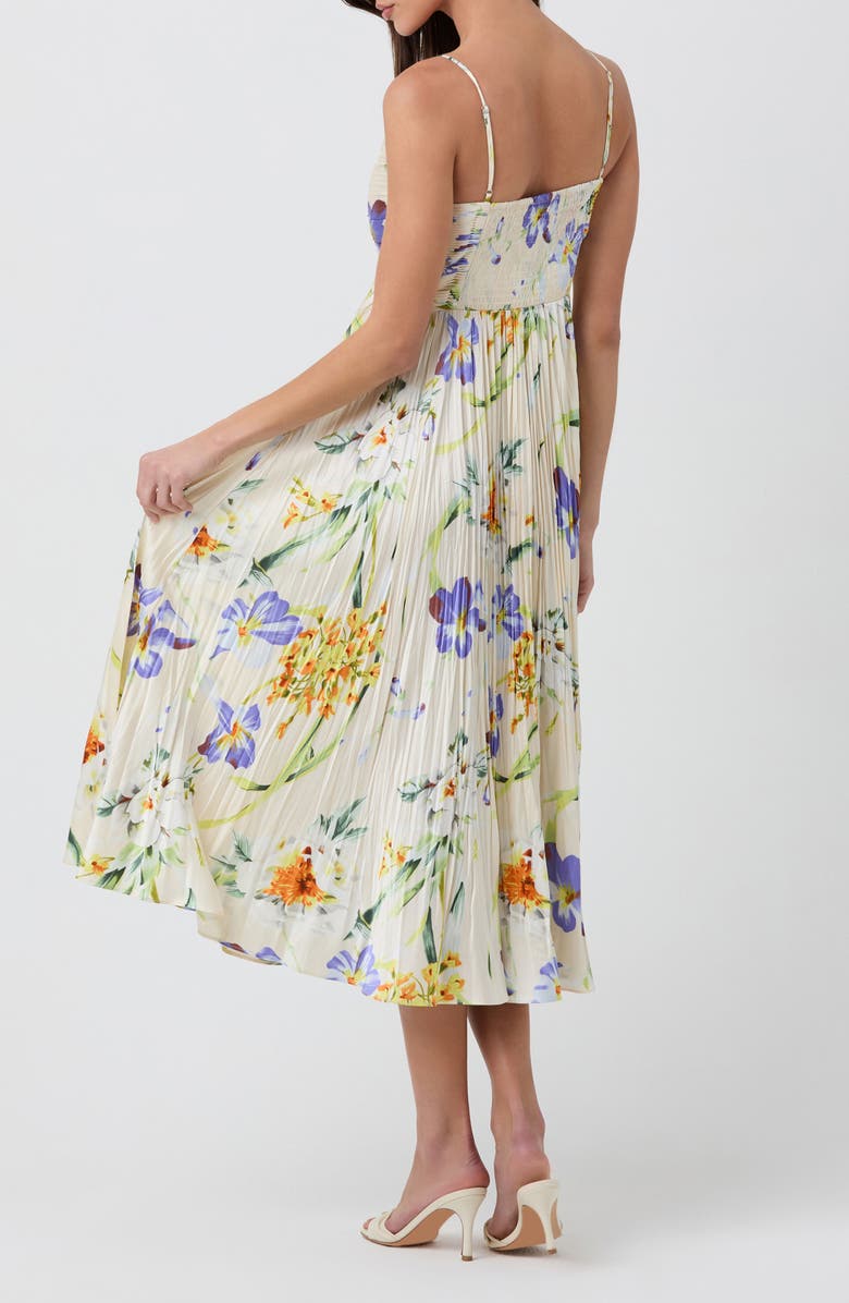 Pleating and a ruched bodice add to the charm of this romantic sundress covered in a lively floral print.