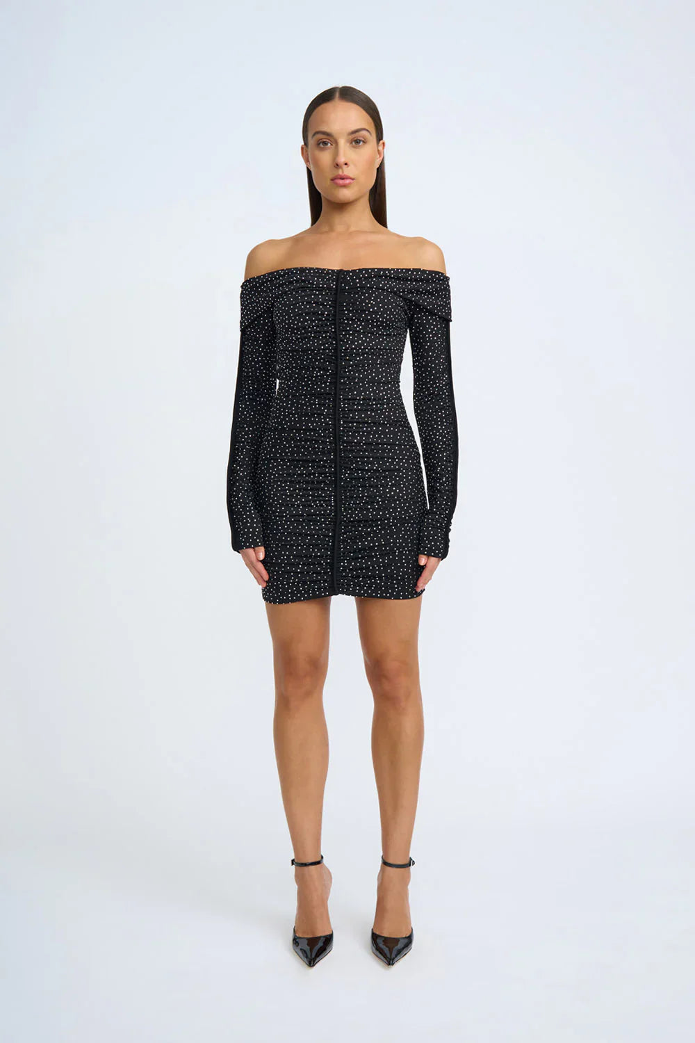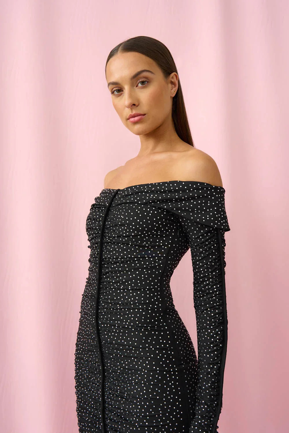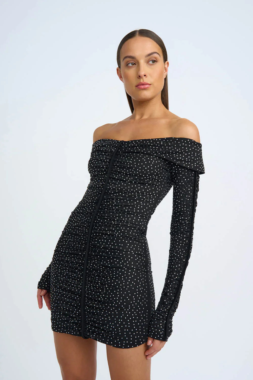 The Night Shine Party Mini Dress is perfect for a fun and elegant occasion, through its dramatic off the shoulder look and diamante addition. Crafted from a form fitting jersey fabrication with sparkle hotflix diamantes all over, this piece is designed to fit closely to the body accentuating the flattering feminine figure.
