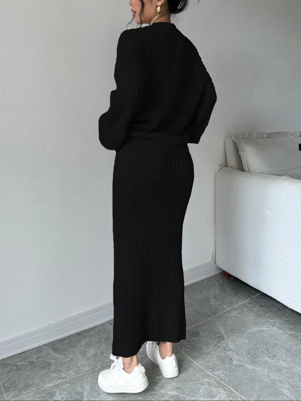 Women's Solid Button Front Sweater & Long Skirt Two-piece Set, Casual Drop Shoulder Long Sleeve Knit Top & High Waist Skirt for Daily Outdoor Wear, Women's Knitwear for Fall & Winter