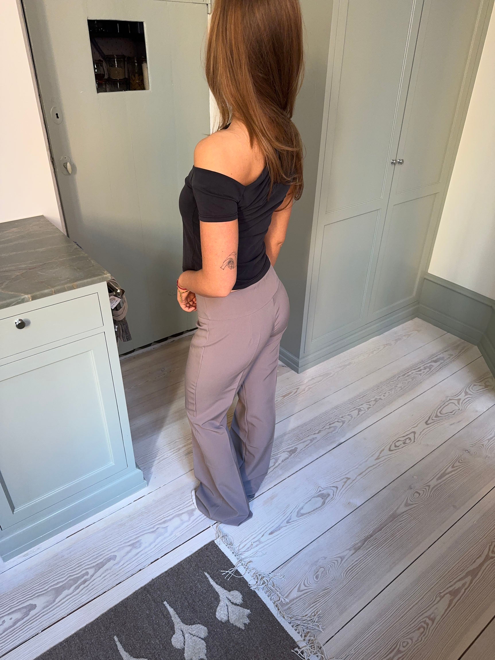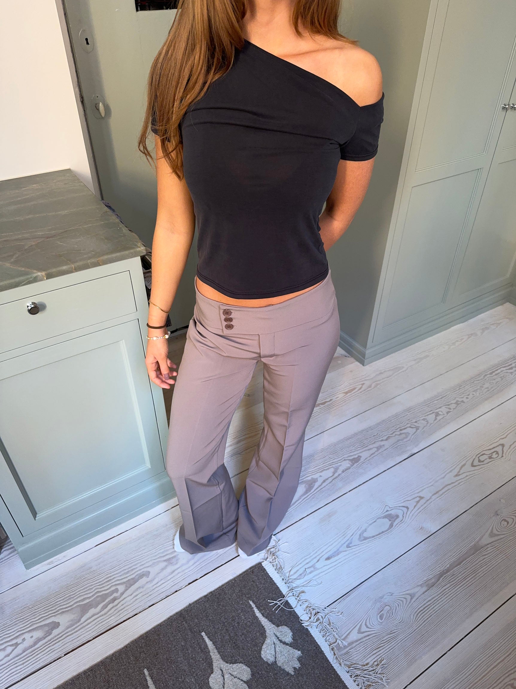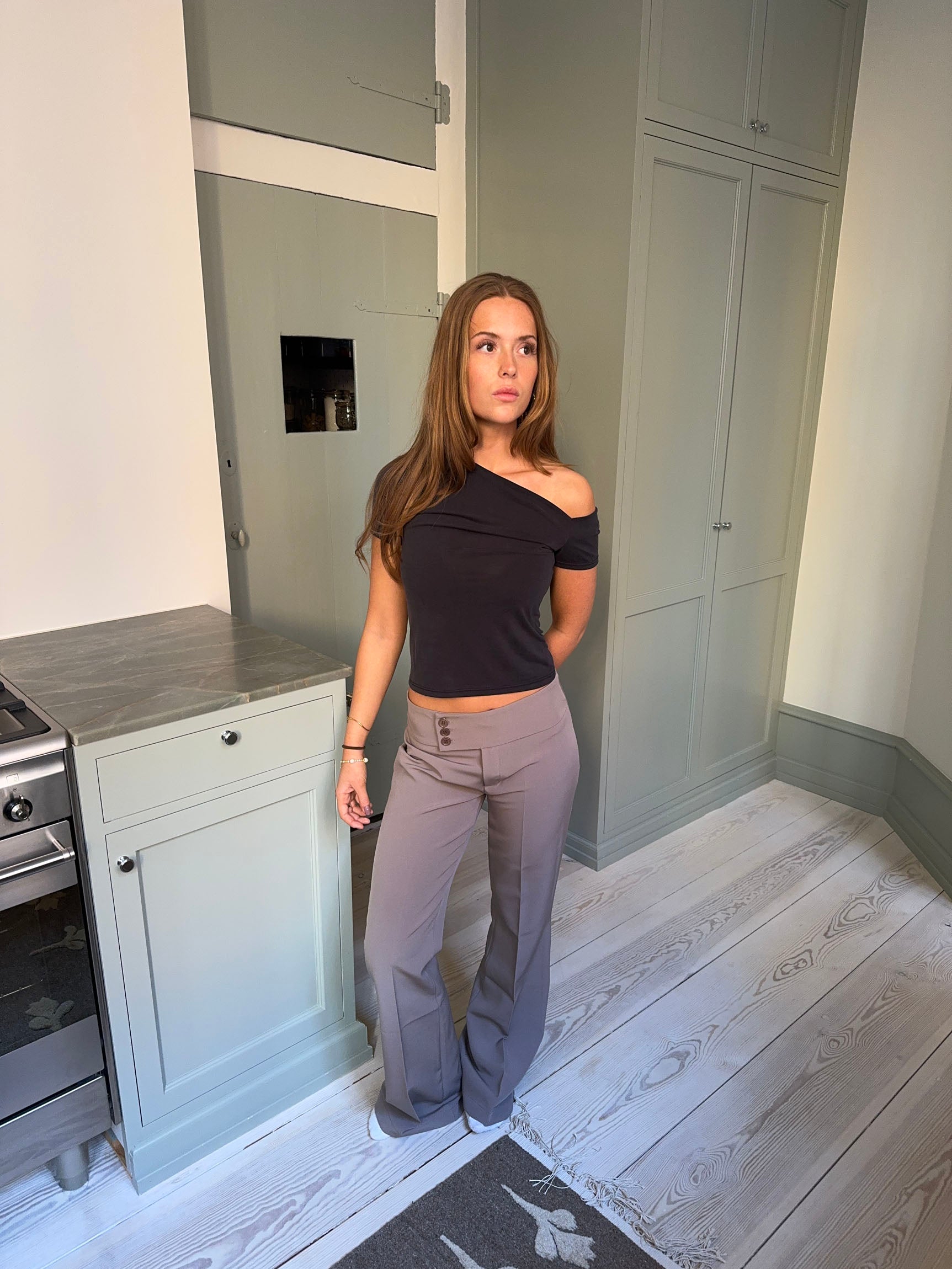 These trousers feature a modern low waist and fasten with buttons and a front zipper. Designed with a flared and loose fit, they ensure both comfort and a stylish look. The simple design makes them easy to style for both everyday wear and more formal occasions.