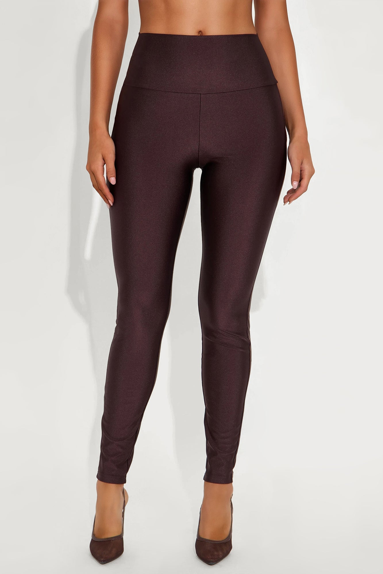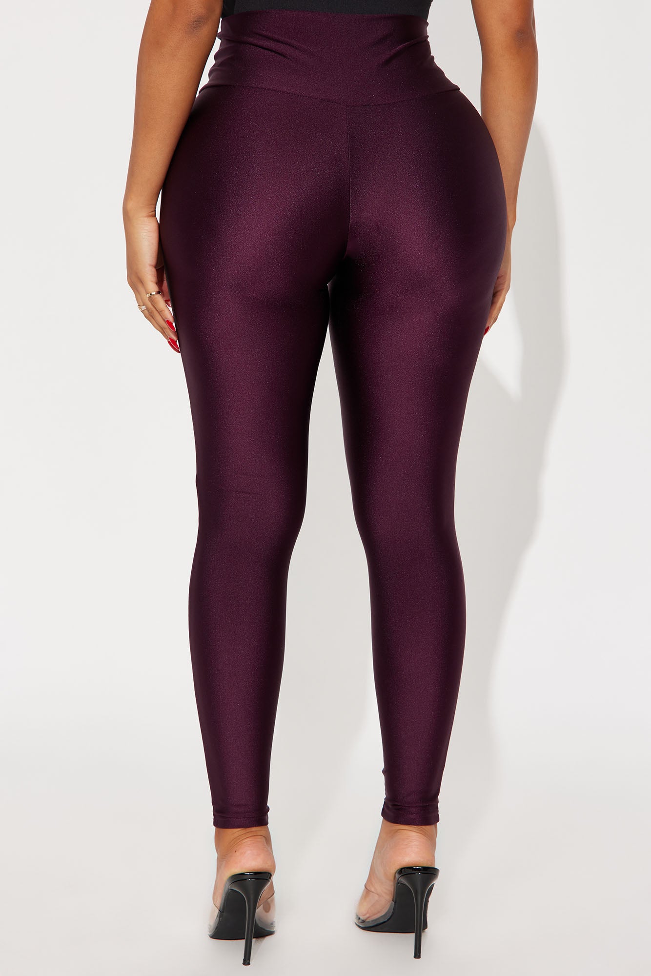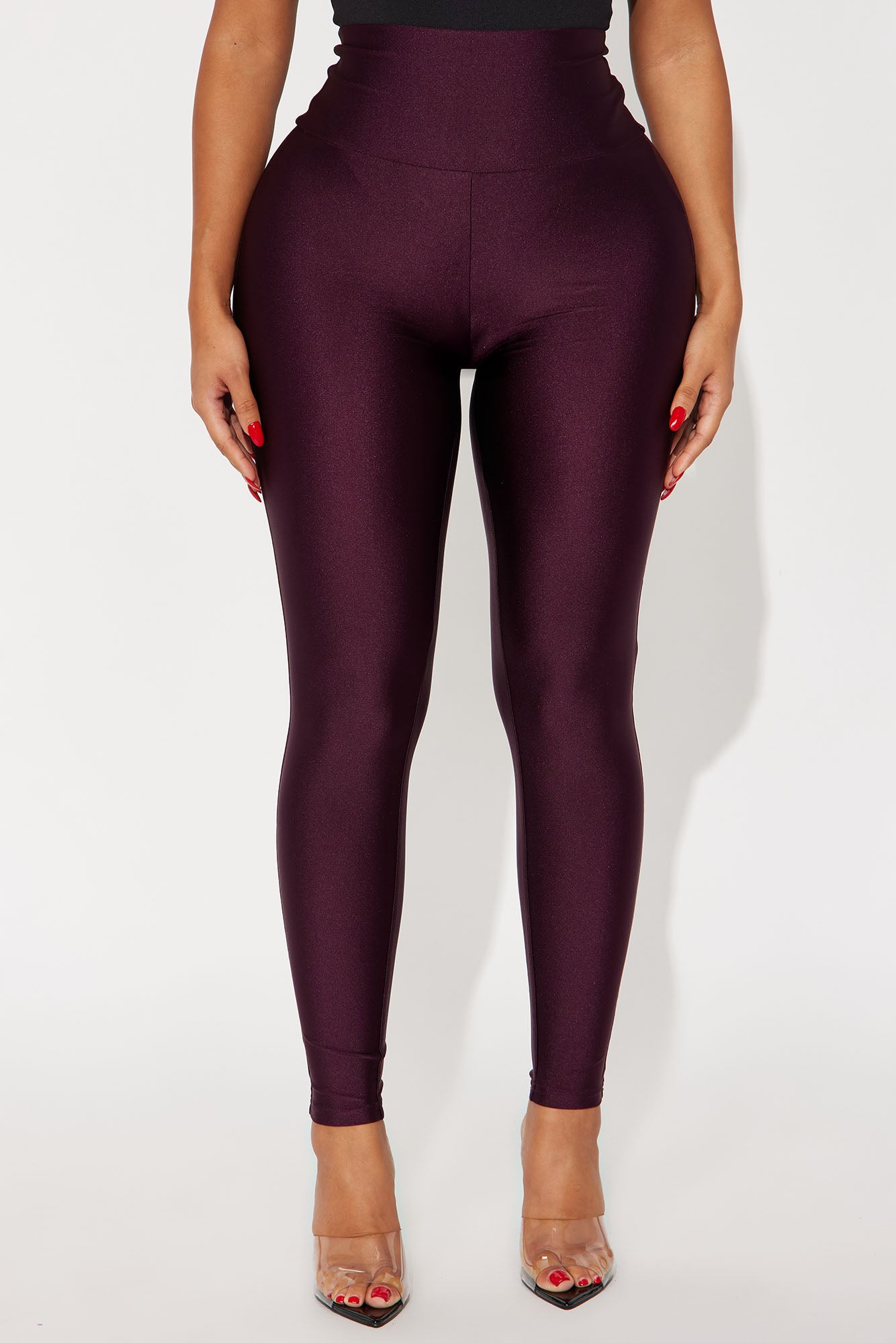 Available In Black, Chocolate, Eggplant, Magenta And Navy.High RiseSlinky FabricFull StretchWide WaistbandSkinny LegSelf: 82% Nylon 18% SpandexImported